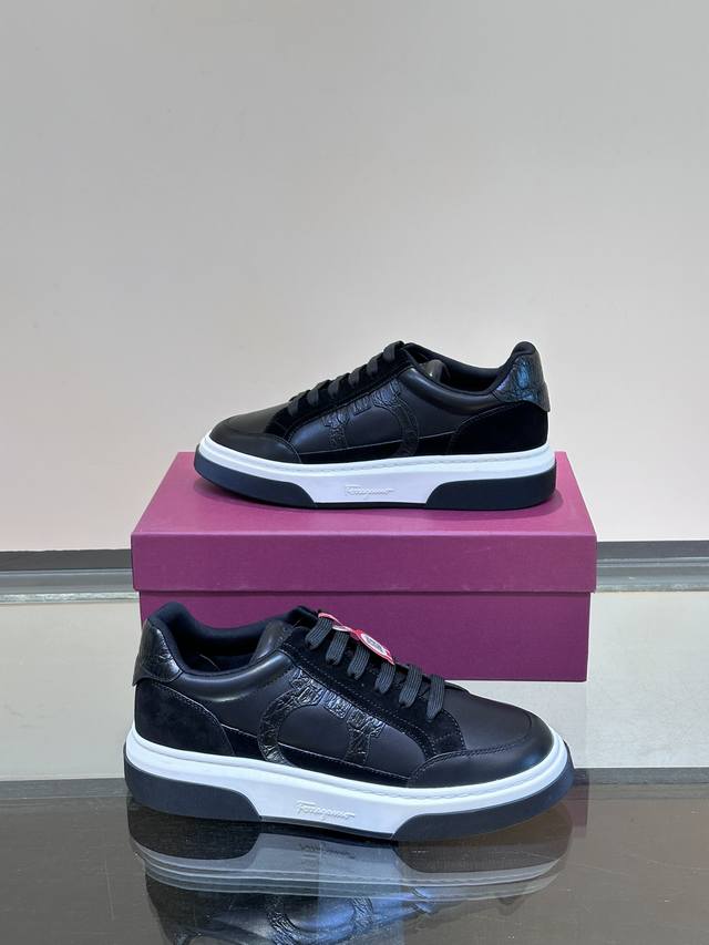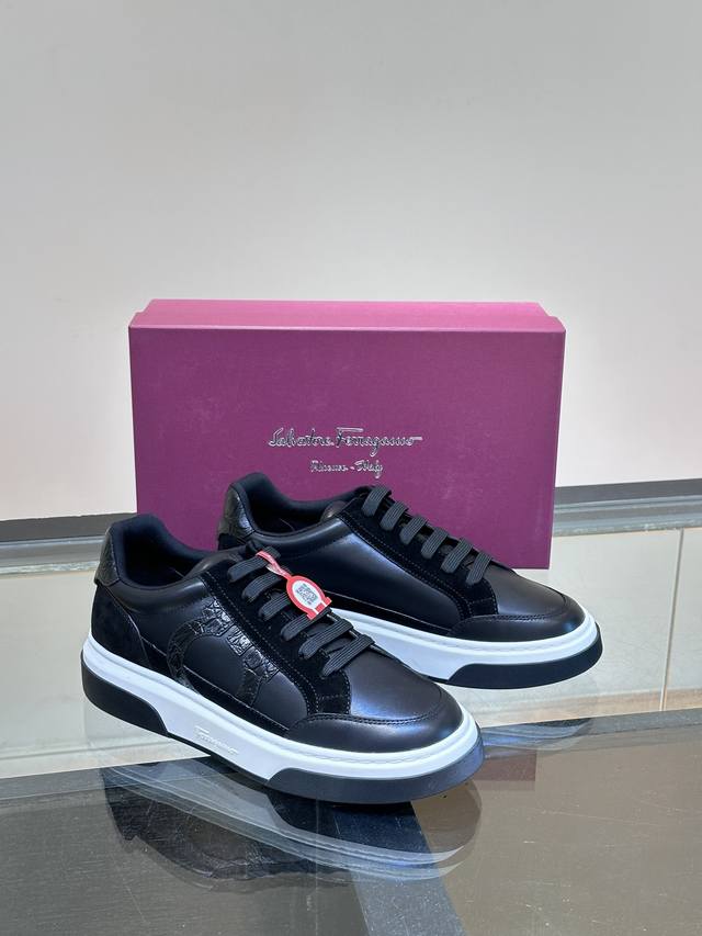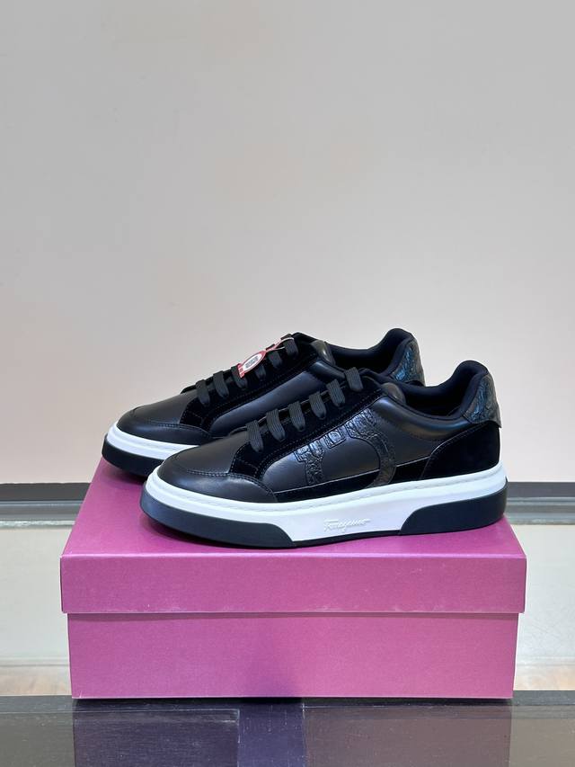 Ferragam* New Men's Gancini Silhouette Low-Top Casual Shoes. These low-top casual shoes are crafted from suede and calfskin leather. Inspired by 90s basketball shoe style, the Gancini side trim adds a touch of classic flair. They feature a lightweight rubber sole with knurled edges and custom grooves. The fabric lining and insole provide lightweight comfort, a stylish and dynamic look, and a comfortable yet sophisticated feel.