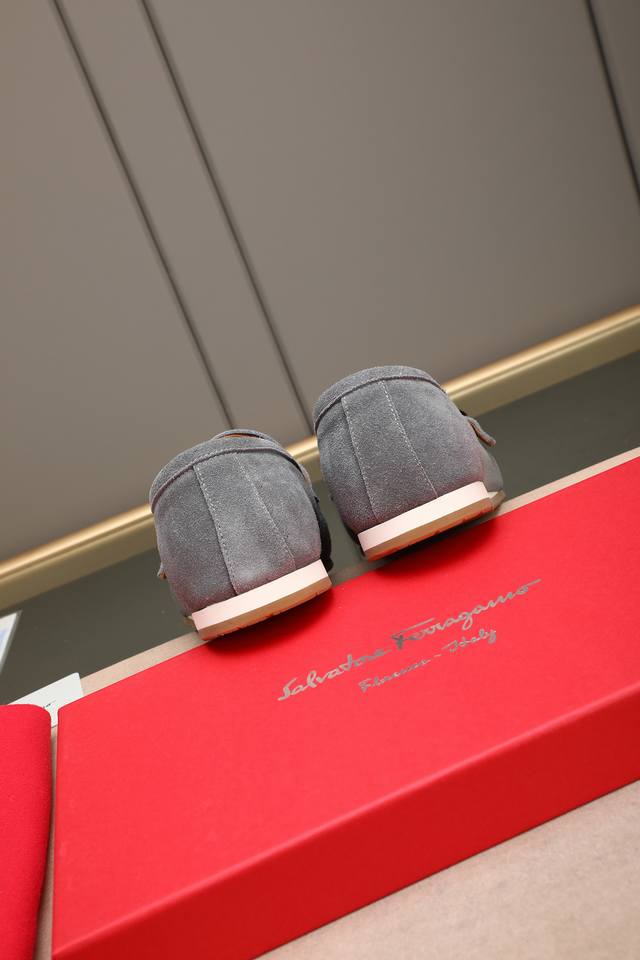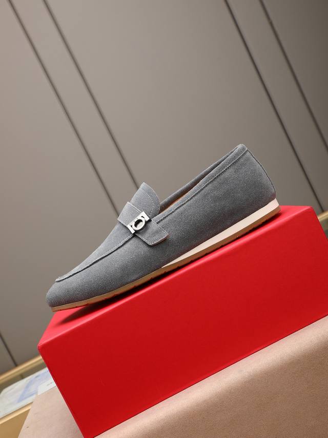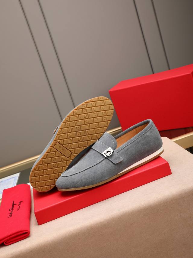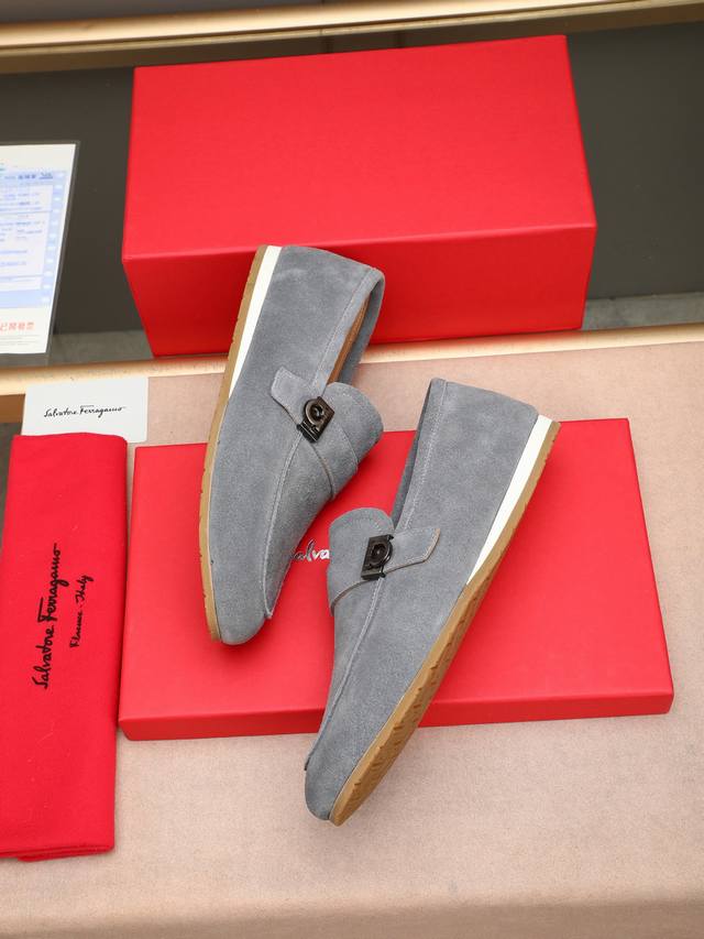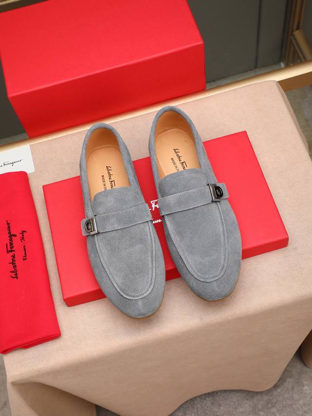 Ferragamo's new model features imported top-grain suede leather, offering a visible sense of quality. It boasts heavy-duty stitching, a naturally dyed calfskin lining, and a standard logo leather insole. Experience the luxury of a premium brand. Soft and comfortable to wear, this men's shoe features a dedicated non-slip, wear-resistant rubber sole, making it suitable for various occasions. Sizes: 38-44, 45 (custom sizes available).