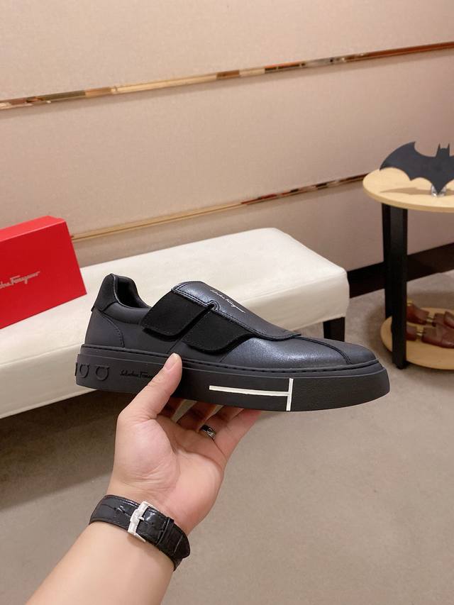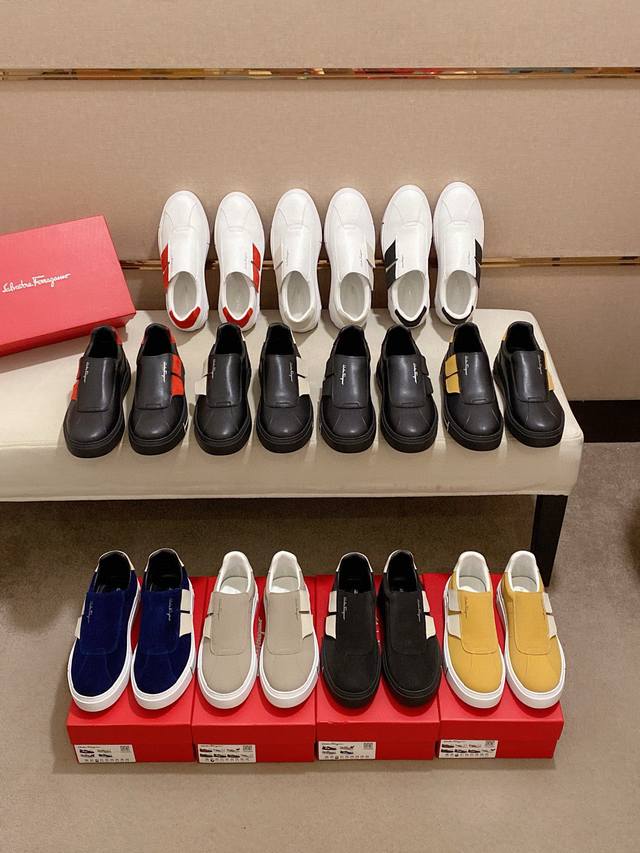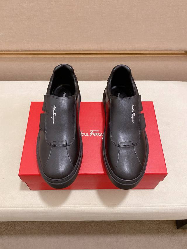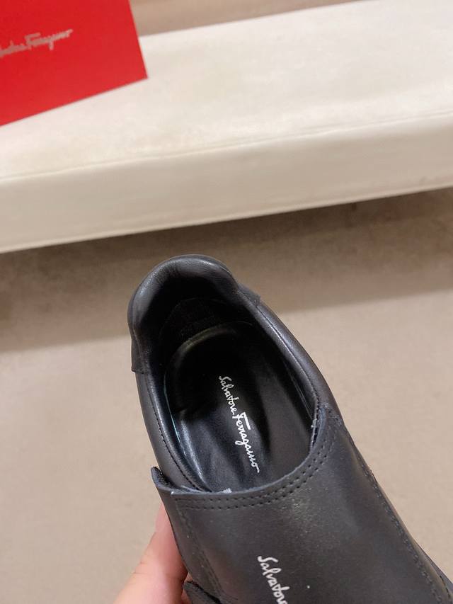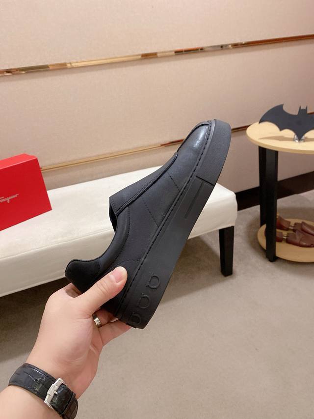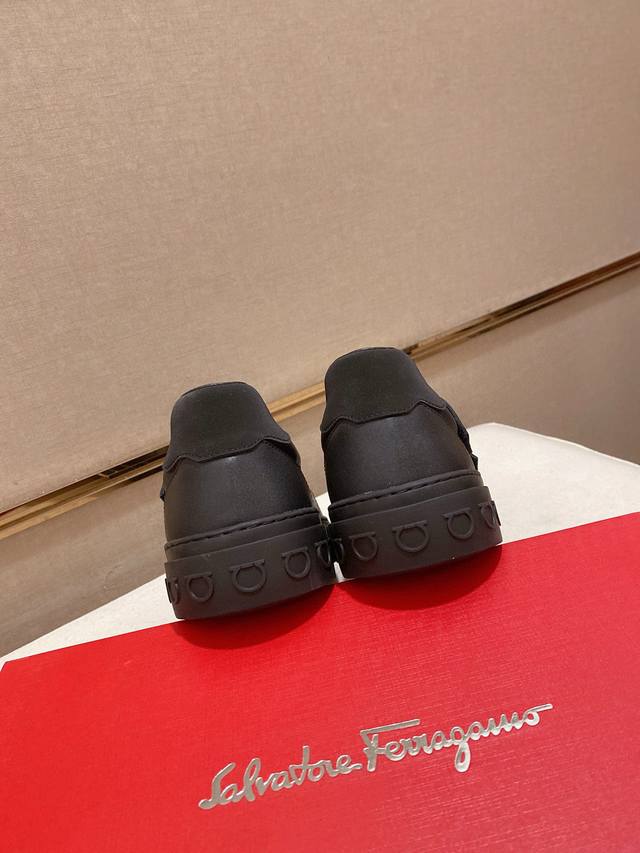 Factory direct price men's sports shoes, original Ferragamo new style, men's skateboard shoes, synchronized style. The upper is made of imported grained cowhide, featuring the latest brand elements, G brand hardware pull tabs. The Ferragamo official website's latest design exudes a sophisticated feel. The simple slip-on style is super versatile. The inner lining is top-grain sheepskin. Original rubber sole. Sizes 38-44. Size 45 is custom-made and non-refundable.