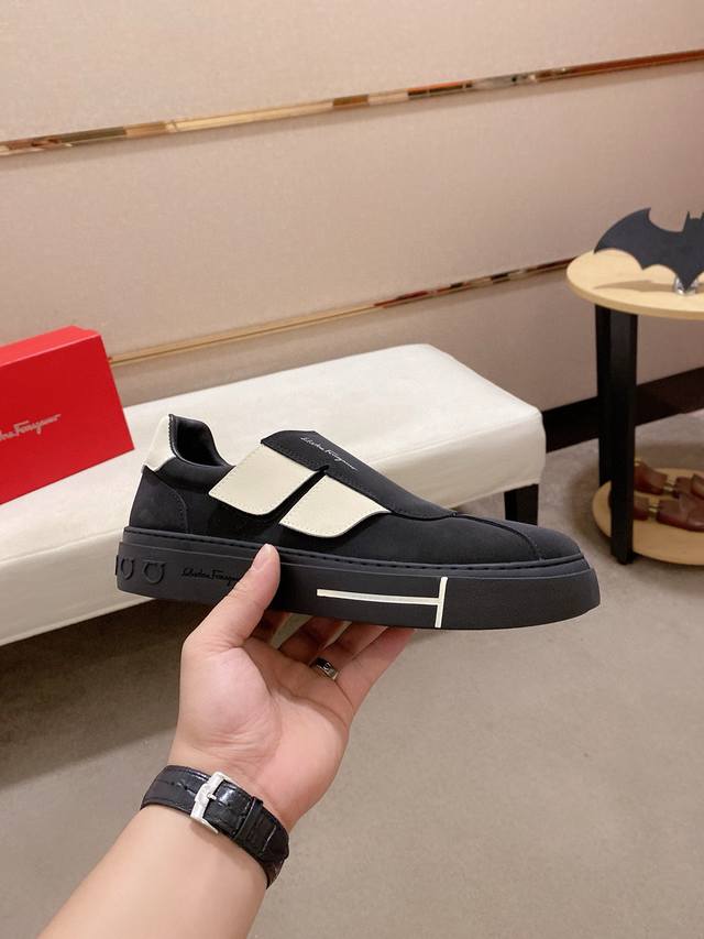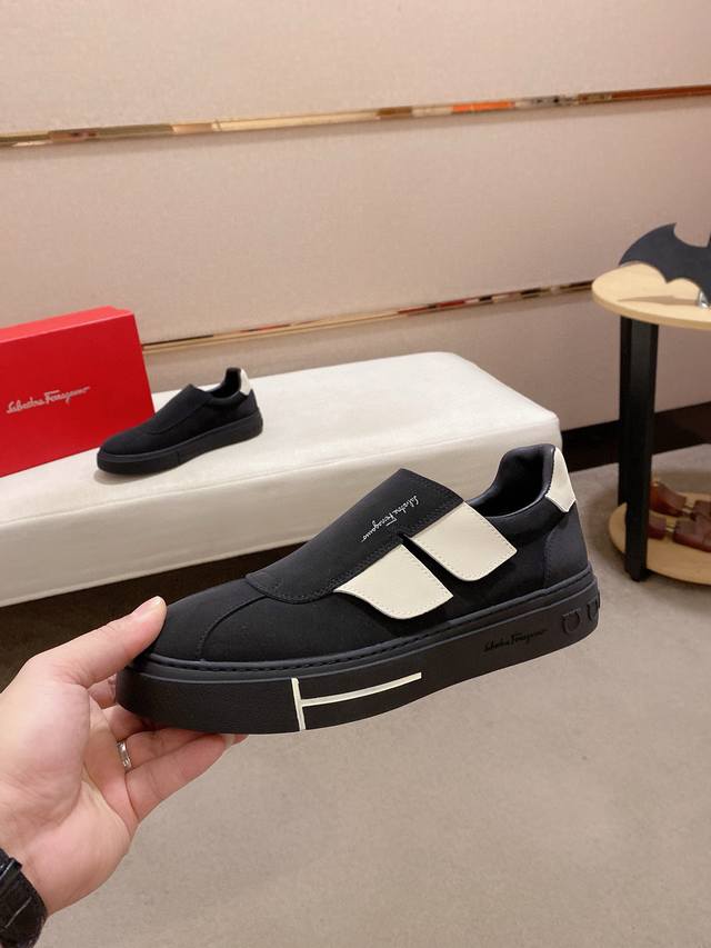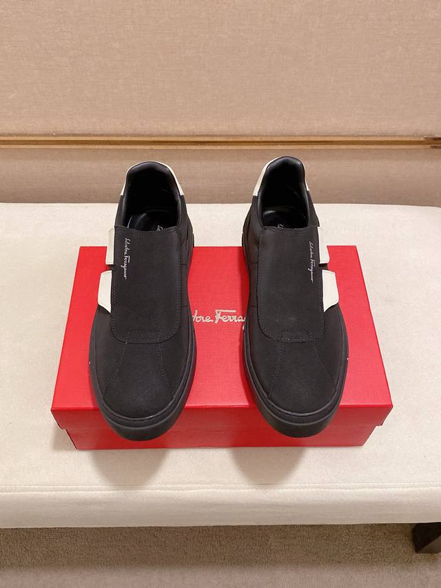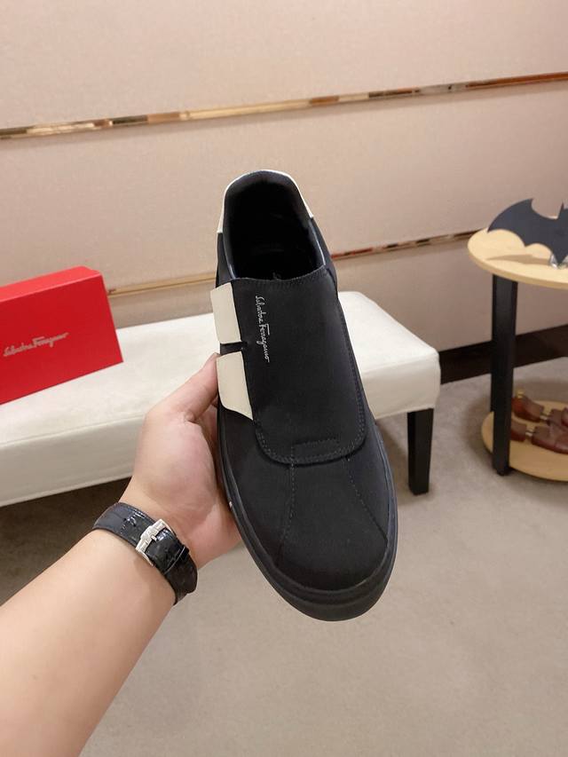 Factory direct price men's sports shoes, original Ferragamo new style, men's skateboard shoes, synchronized style. The upper is made of imported grained cowhide, featuring the latest brand elements, G brand hardware pull tabs. The Ferragamo official website's latest design exudes a sophisticated feel. The simple slip-on style is super versatile. The inner lining is top-grain sheepskin. Original rubber sole. Sizes 38-44. Size 45 is custom-made and non-refundable.