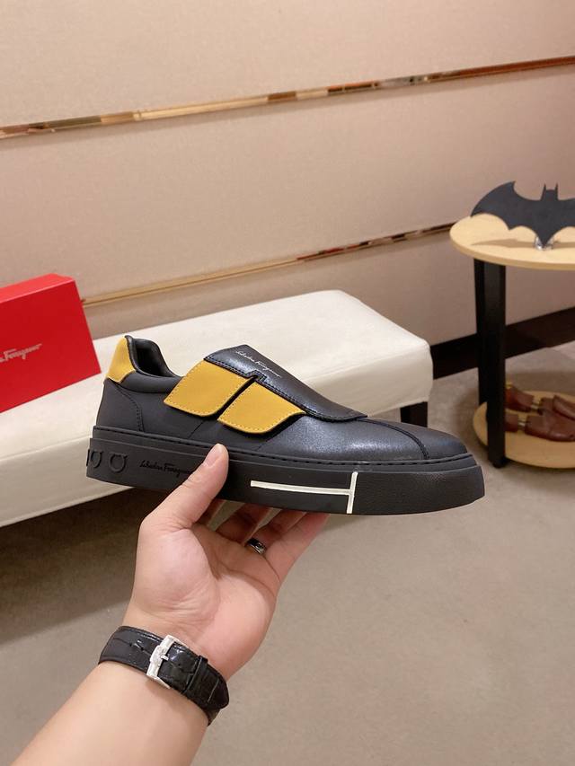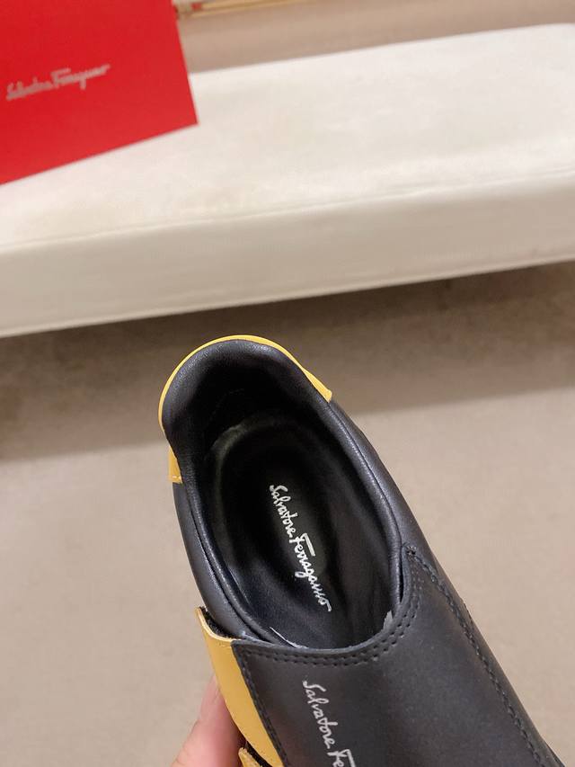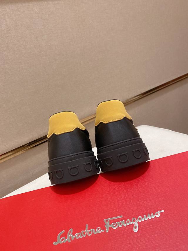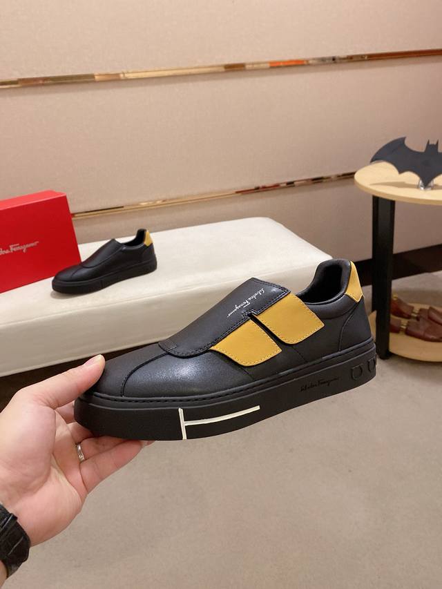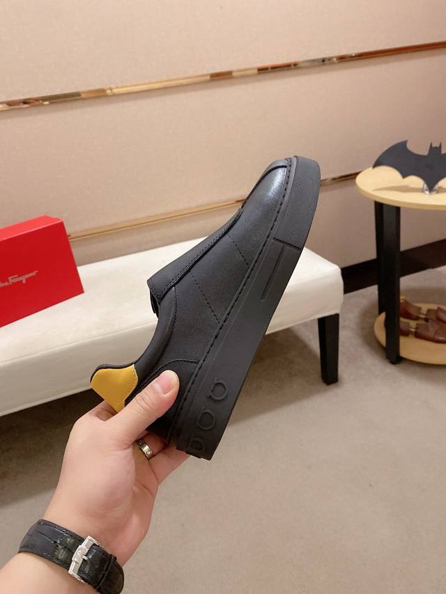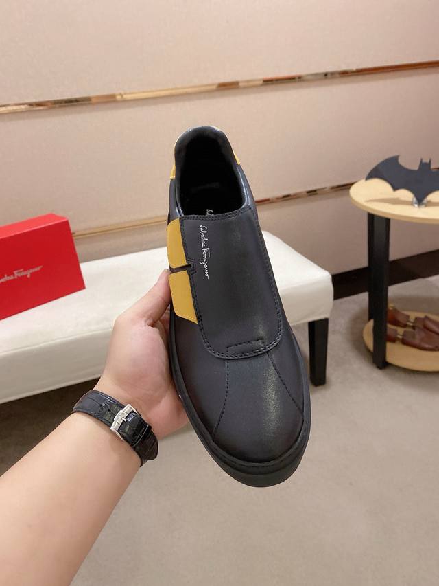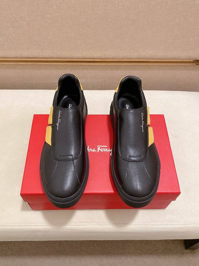 Factory direct price men's sports shoes, original Ferragamo new style, men's skateboard shoes, synchronized style. The upper is made of imported grained cowhide, featuring the latest brand elements, G brand hardware pull tabs. The Ferragamo official website's latest design exudes a sophisticated feel. The simple slip-on style is super versatile. The inner lining is top-grain sheepskin. Original rubber sole. Sizes 38-44. Size 45 is custom-made and non-refundable.