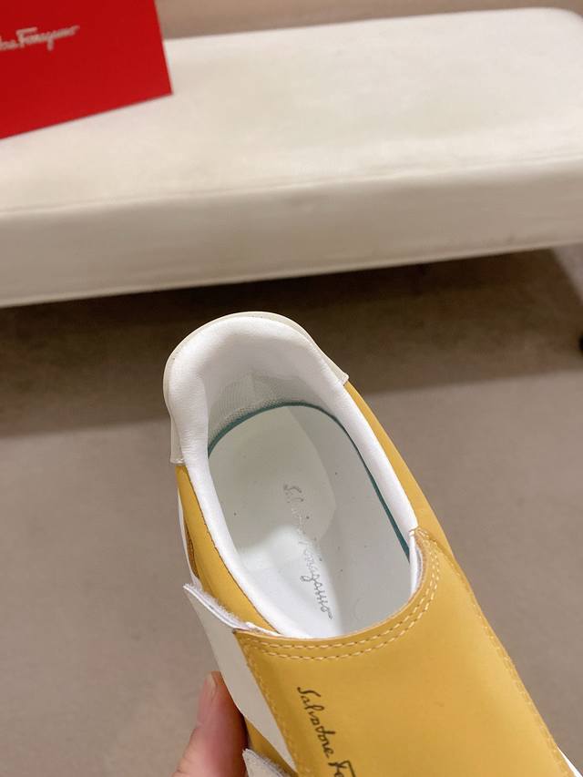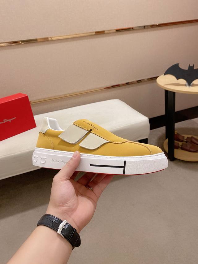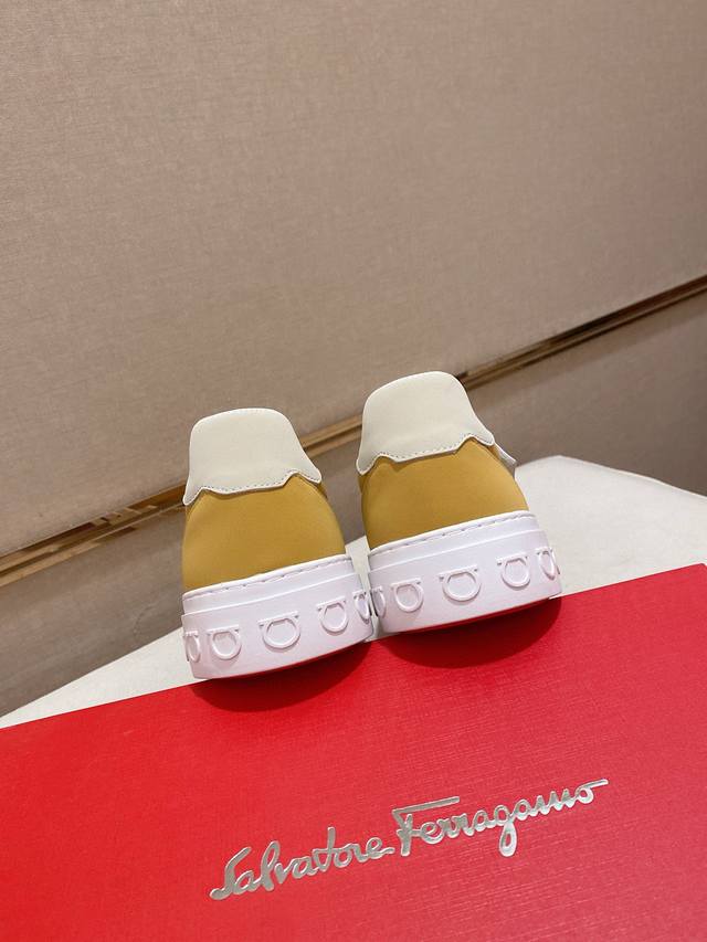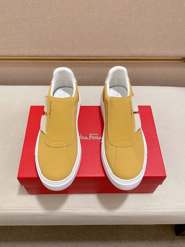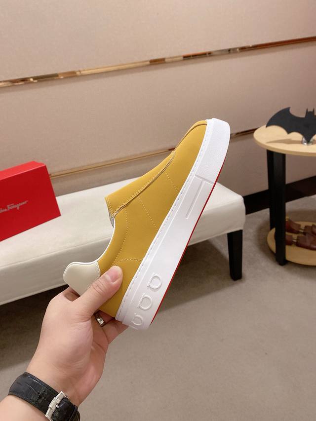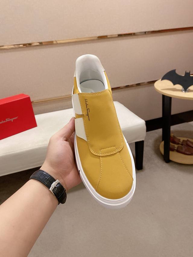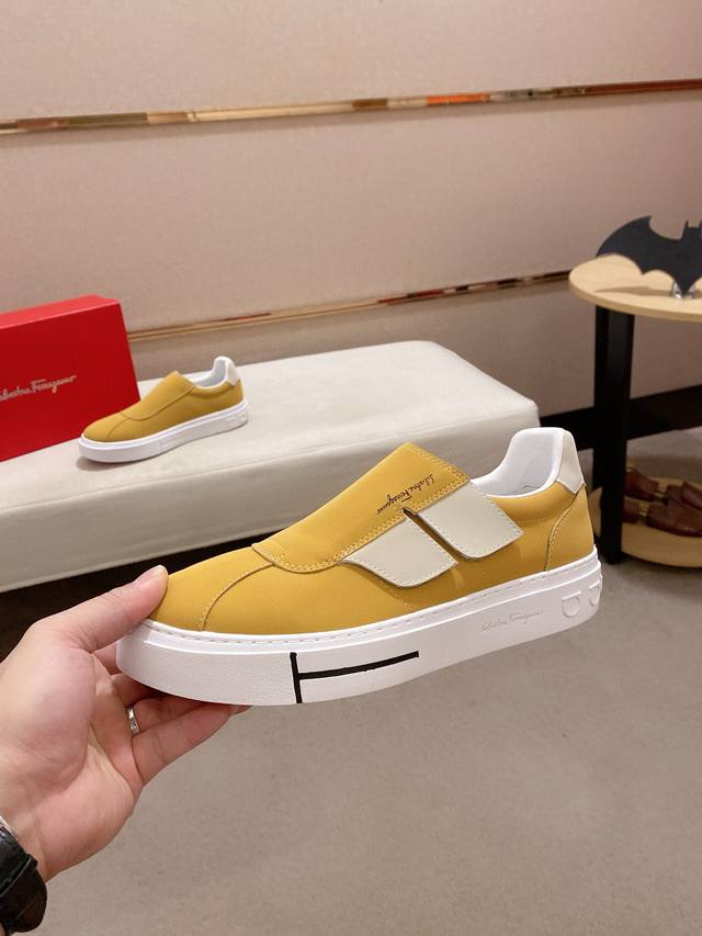 Factory direct price men's sports shoes, original Ferragamo new style, men's skateboard shoes, synchronized style. The upper is made of imported grained cowhide, featuring the latest brand elements, G brand hardware pull tabs. The Ferragamo official website's latest design exudes a sophisticated feel. The simple slip-on style is super versatile. The inner lining is top-grain sheepskin. Original rubber sole. Sizes 38-44. Size 45 is custom-made and non-refundable.