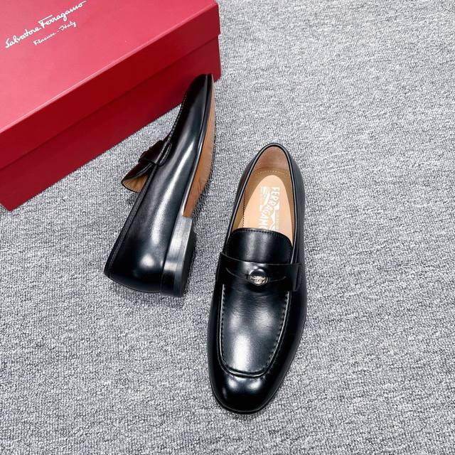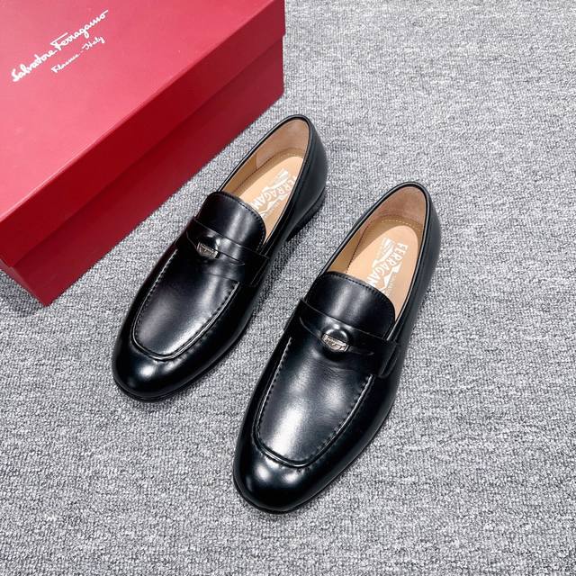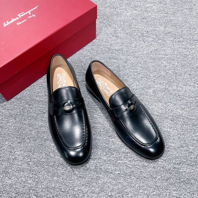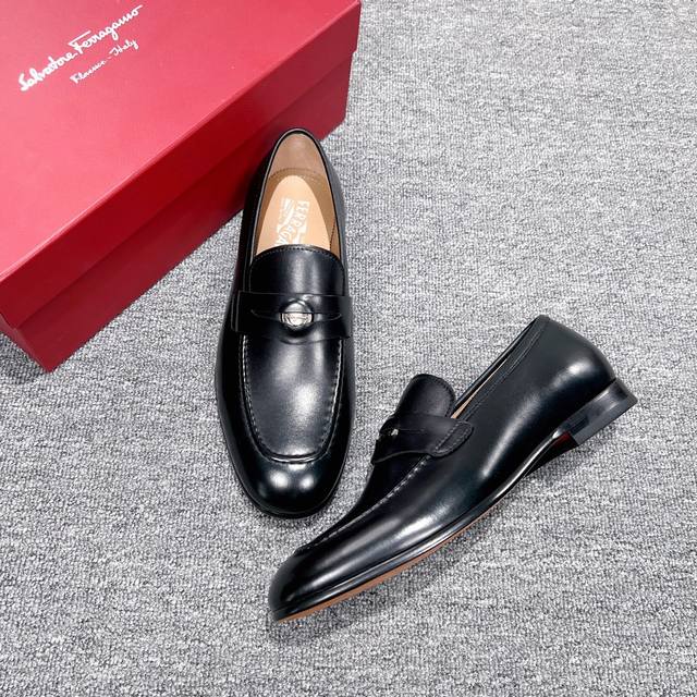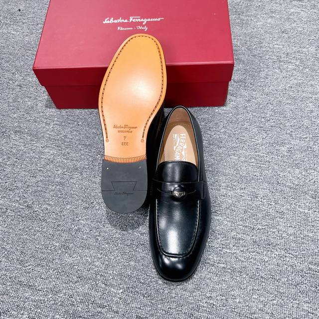 Factory Price Men's Men's Sports Shoes Original Ferragamo Men's Leather Shoes. These elegant loafers feature ornate details, exuding a sophisticated and refined style, perfect for cocktail parties. The heavyweight cowhide is hand-polished for a stunning finish, and the instep is adorned with a sleek, sleek inner rounded palladium-colored buckle. Stitching reveals the edges of the leather sole, crafted using the "Originali" construction technique, a multi-step process that is almost entirely handmade, showcasing the exceptional craftsmanship of expert shoemakers.