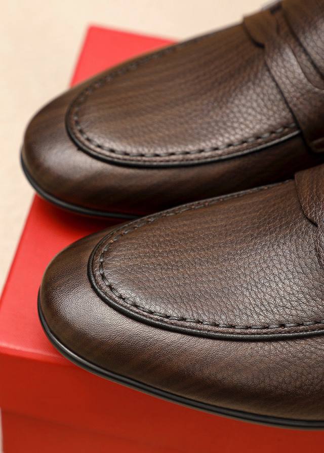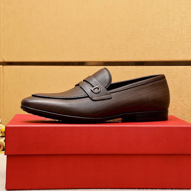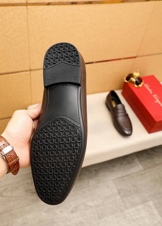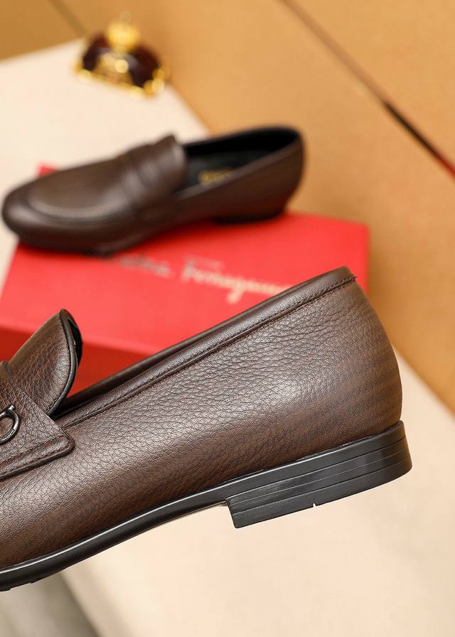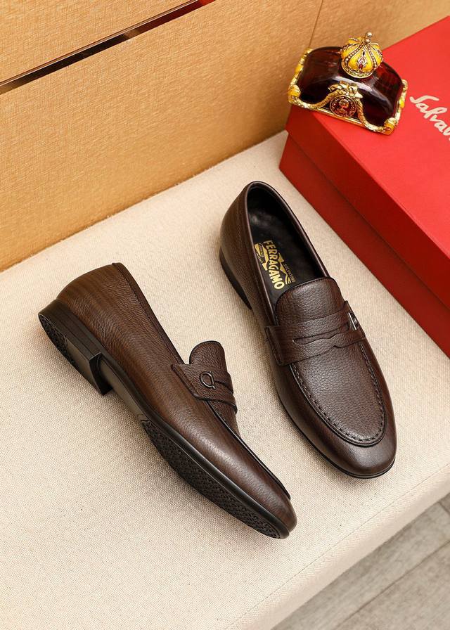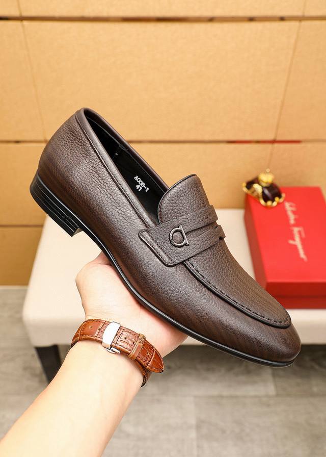 Product Brand: Ferragamo Casual Leather Shoes True to Size: 38-44, 45 (Custom Made) Materials: Selected imported top-grain lychee-textured cowhide upper, imported water-dyed cowhide lining. Strong three-dimensional visual effect, rubber outsole. Colors: 1 color available.