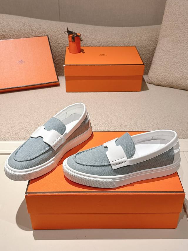 These calfskin and washed denim slip-on sneakers feature the iconic "H" detail. The simple, streamlined design creates a stylish urban look. Comfortable and versatile, a classic Hermes timeless style. Comes with exquisite boutique packaging
