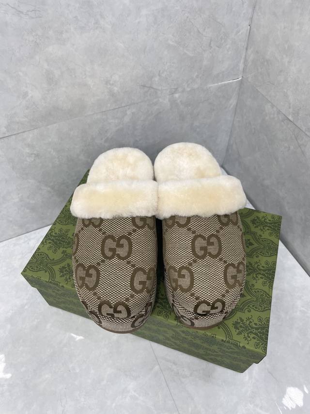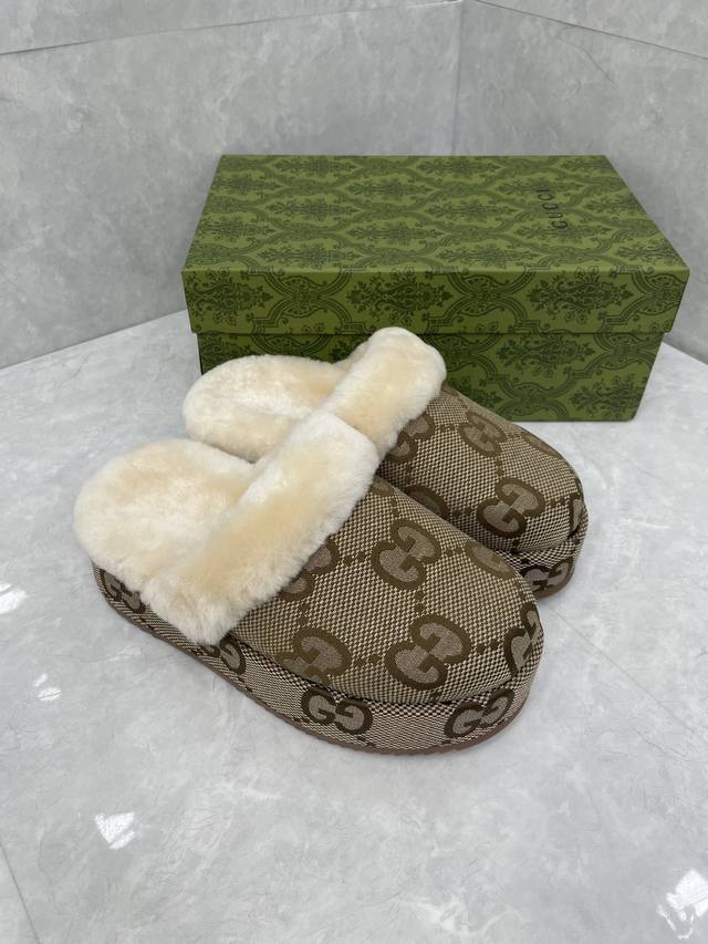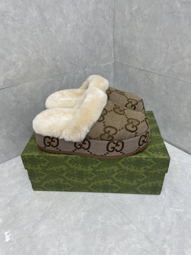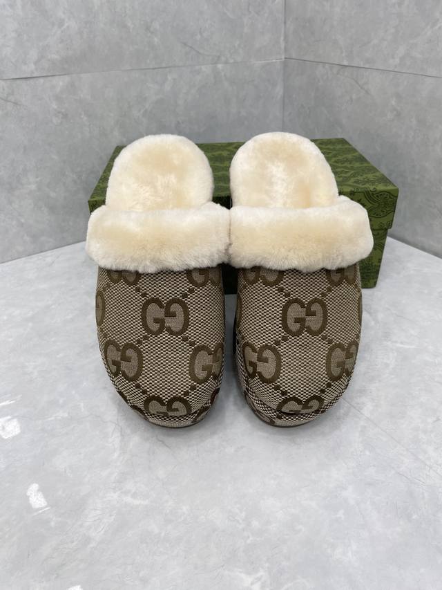 Gg Autumn/Winter New Wool Slippers DDD The Gg logo, first used in the 1970s, evolved from the early Gucci diamond quilting that originated in the 1930s, and is a representative essence of Gucci's tradition. Reinterpreted in a bright and eye-catching color, the Gg logo adds a striking focal point to these sneakers. The sole features an embossed design highlighting Mr. Guccio Gucci's initials, emphasizing the brand's rich heritage. DDD Upper: Gg jacquard fabric DDD Lining: Sheepskin DDD Type: Women's slippers DDD Sole: Platform with rubber sole DDD Heel height: Low heel DDD Height: 5.5 cm DDD Made in Italy DDD Sizes: 35-44 DDD