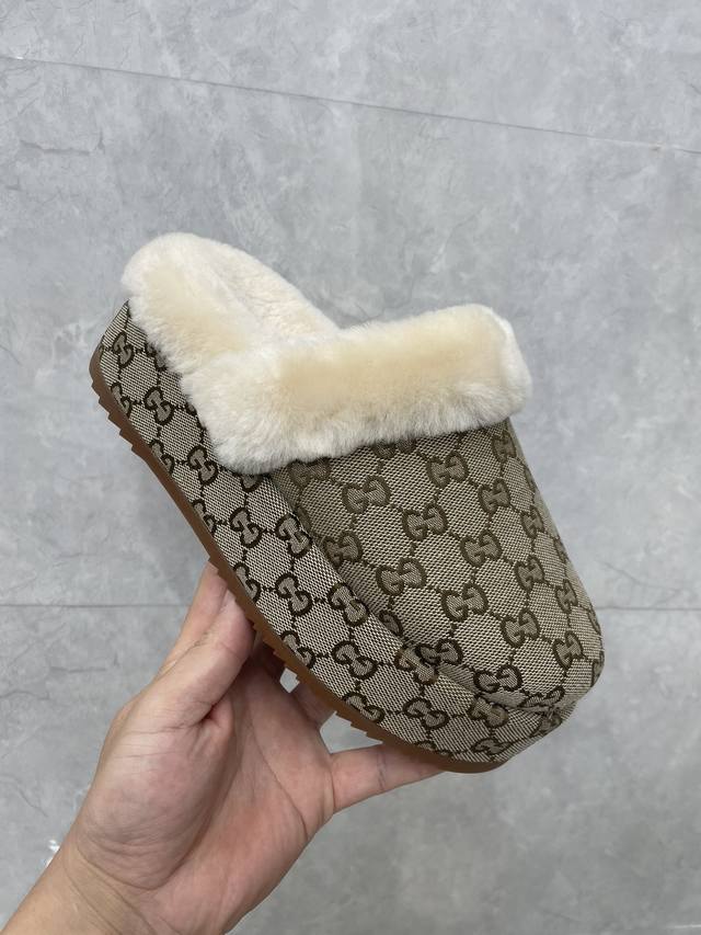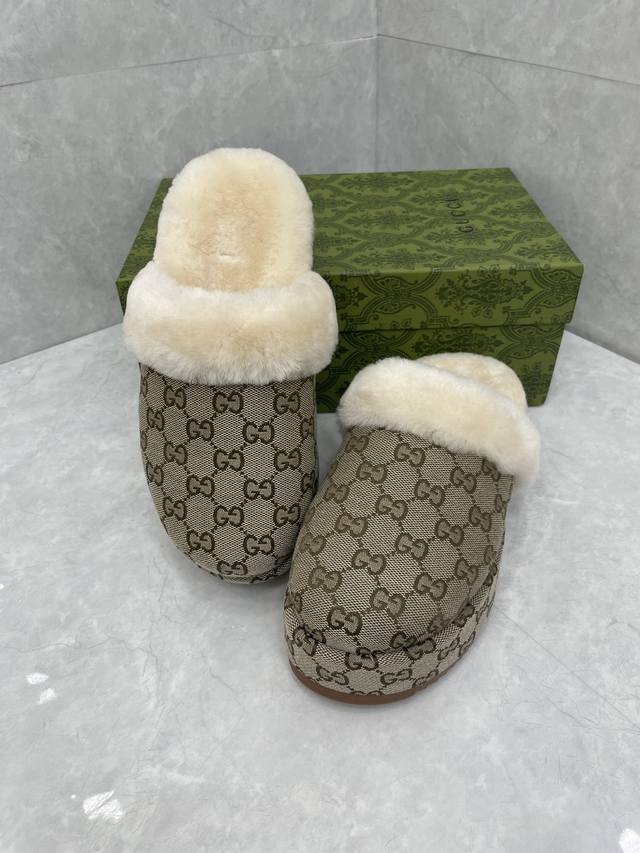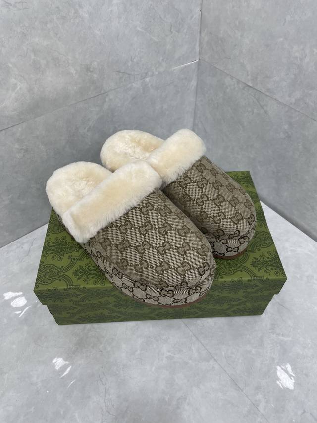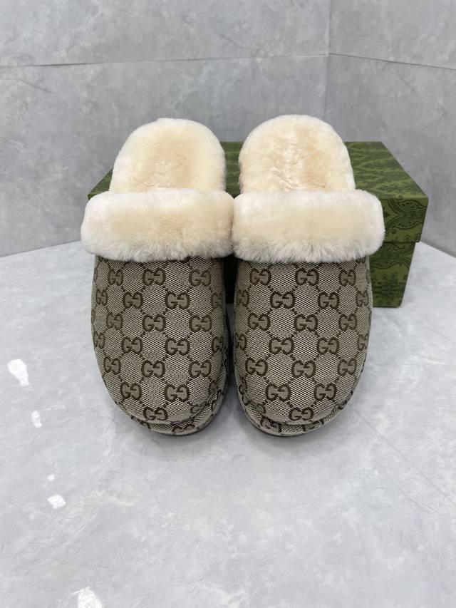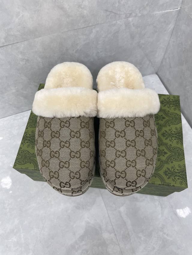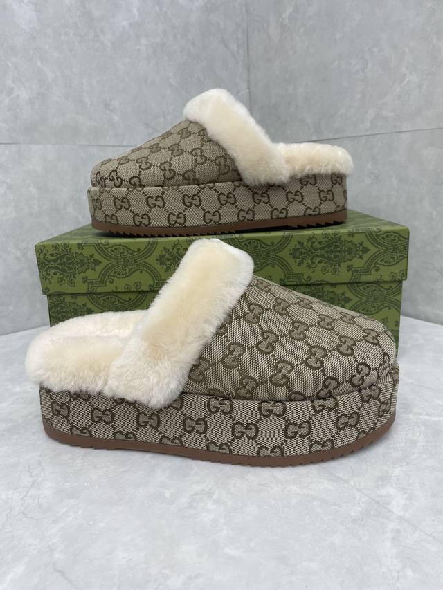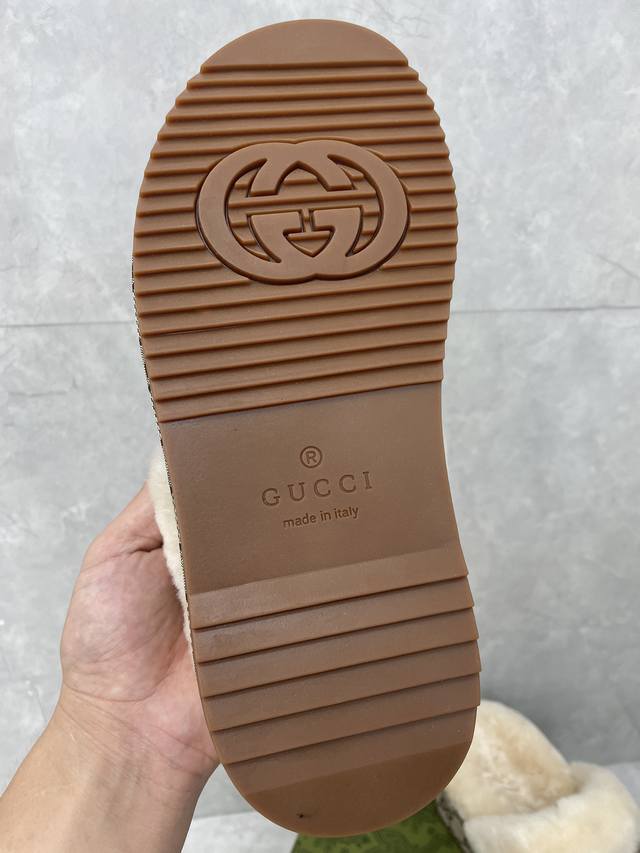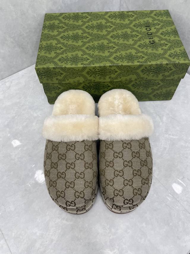 Gg Autumn/Winter New Wool Slippers DDD The Gg logo, first used in the 1970s, evolved from the early Gucci diamond quilting that originated in the 1930s, and is a representative essence of Gucci's tradition. Reinterpreted in a bright and eye-catching color, the Gg logo adds a striking focal point to these sneakers. The sole features an embossed design highlighting Mr. Guccio Gucci's initials, emphasizing the brand's rich heritage. DDD Upper: Gg jacquard fabric DDD Lining: Sheepskin DDD Type: Women's slippers DDD Sole: Platform with rubber sole DDD Heel height: Low heel DDD Height: 5.5 cm DDD Made in Italy DDD Sizes: 35-44 DDD