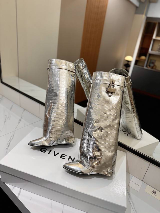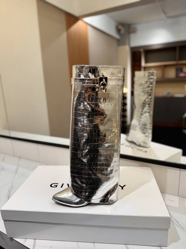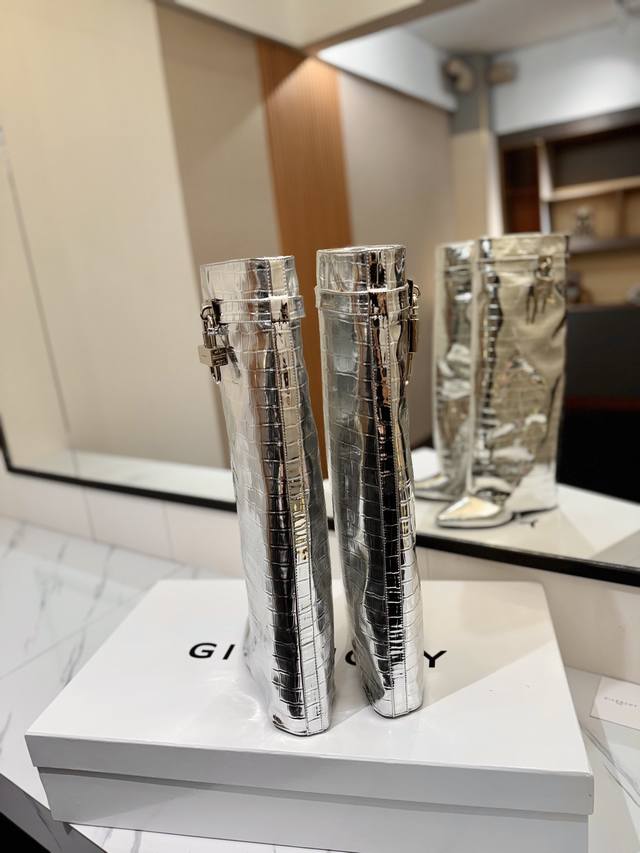 Authentic, Custom-Made Givenchy 2025 New High-Heeled Laminated Leather Wrinkled Boots, Highest Quality Version on the Market. The Givenchy buckle and wrinkled patent leather design is a fashion sensation. Original design, super accurate and highly replicated. Excellent fit, slimming, and high-end look, super comfortable. Upper: Imported cowhide. Lining: Calfskin. Custom-made matching mold with iconic logo buckle. Buckle available in pure silver, pure gold, and gold/silver mix; please specify your preference in the order notes. Heel: 8.5cm, matching mold. Outsole: Imported genuine leather. Sizes: 35-40 (34.40 41:42). Customizable, non-refundable.
