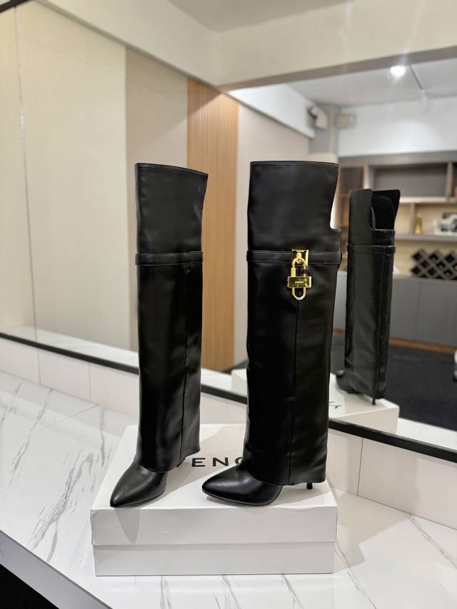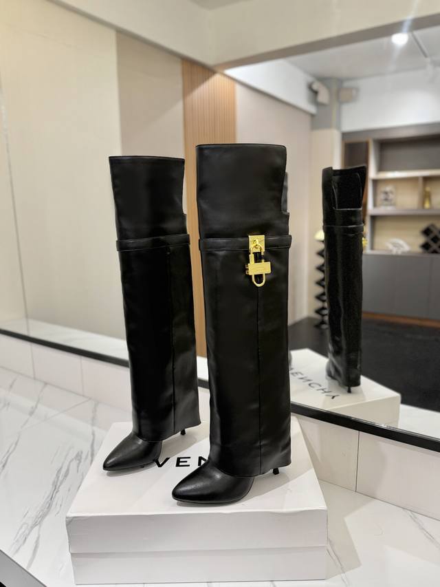 Authentic, custom-made Givenchy Shark Lock series over-the-knee boots, the highest quality version on the market. The Givenchy buckle is a fashion icon, instantly giving you longer legs. Original design, super accurate and highly replicated. Excellent fit, slimming, high-end look, and super comfortable. Upper: Imported cowhide. Lining: Calfskin. Custom-made matching mold with iconic logo buckle. Buckle available in pure silver, pure gold, and gold/silver mix; please specify your preference in the order notes. Heel: 10.5cm, matching mold. Outsole: Imported genuine leather. Sizes: 35-40 (34.40 41:42). Customizable, non-refundable.