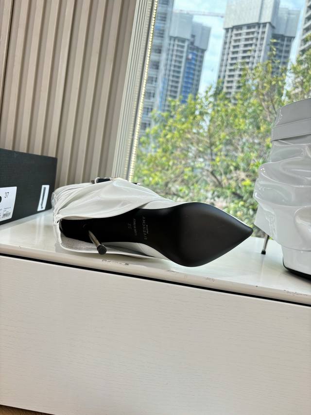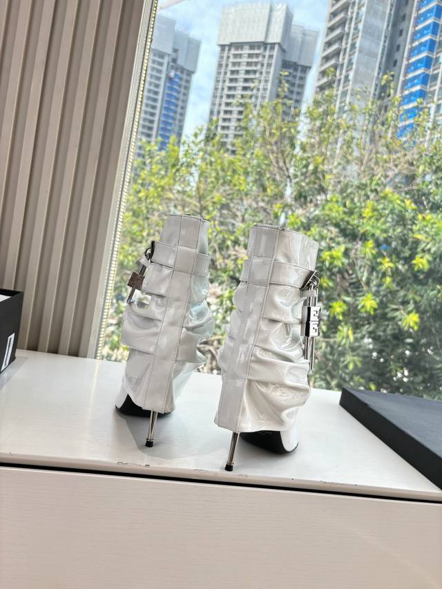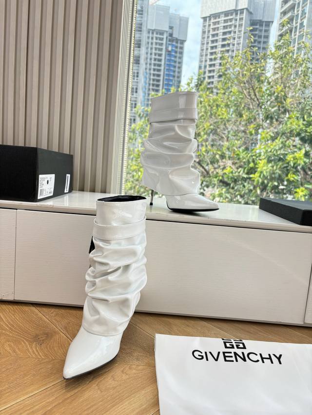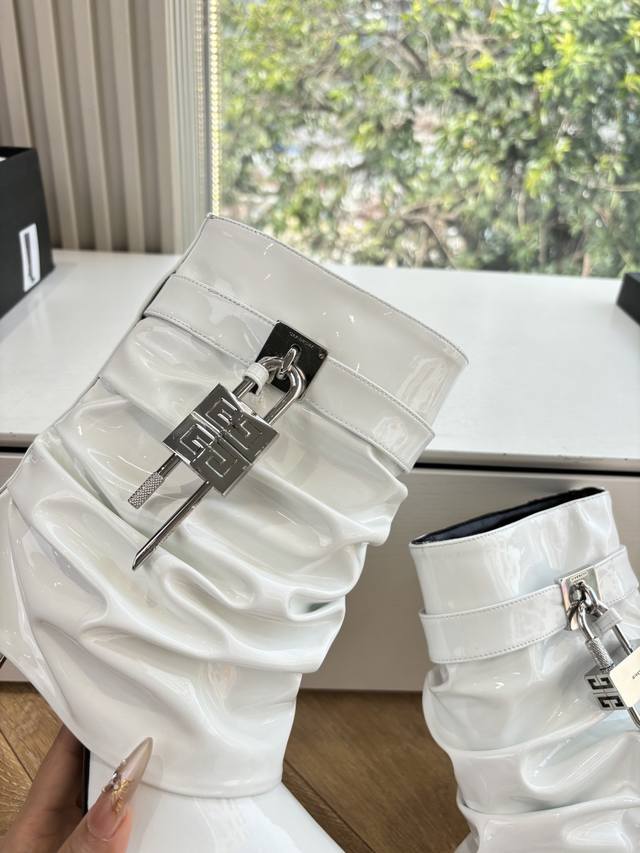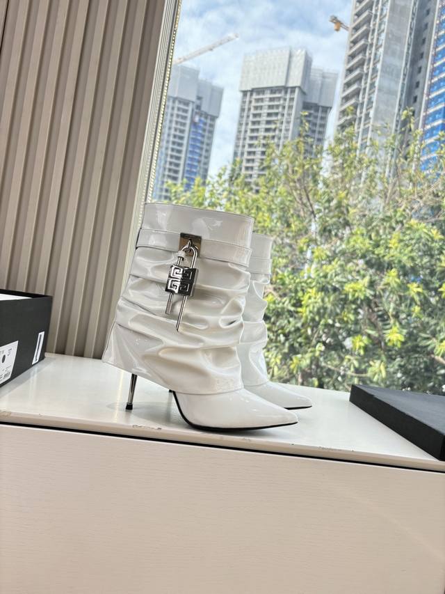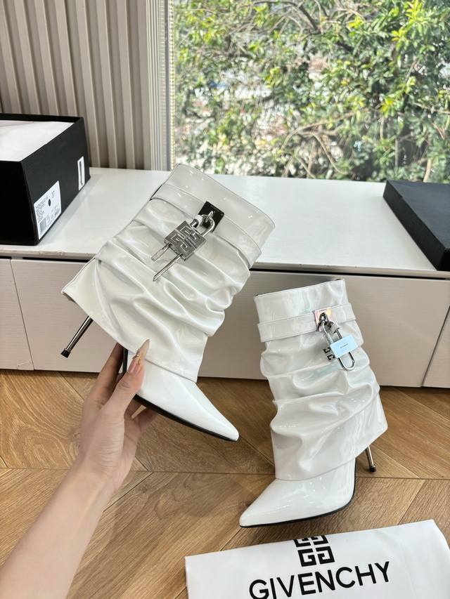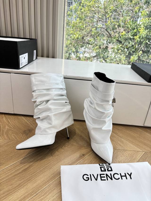 G277 Givenchy New Fashionable Long Boots/Riding Boots in Glossy Leather, 1:1 replica of the original. Features leather straps with metal buckles on the legs, an asymmetrical gold 4G logo padlock on the side, and an almond-shaped toe. Heel height: approx. 11cm. Material: Cowhide. Lining: Sheepskin. Sizes: 35-42 (40-42). Custom sizes, no returns or exchanges.
