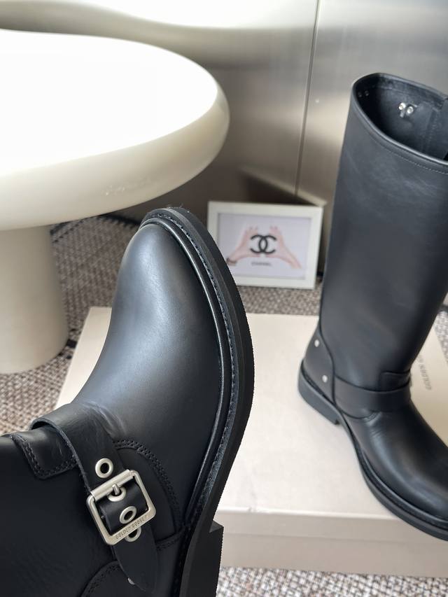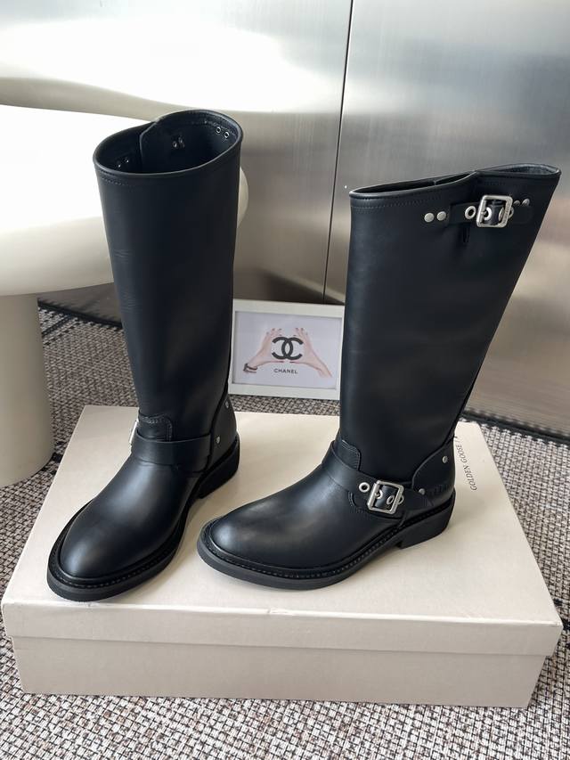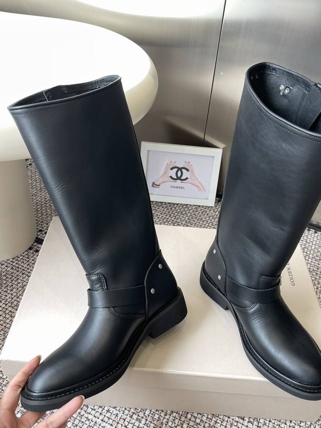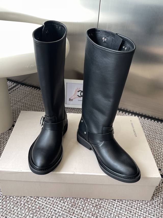 Ggdb Golden Goose 25Ss Autumn/Winter New Retro Tall Boots/Knight Boots. Made of high-quality genuine leather, these boots are delicate, durable, and have a good sheen. They are high-top riding boots with metal buckle elements that add a retro and cool style. The shoe shape is sleek, and the boot height is moderate, which has a good effect on the leg line. Pair them with a black leather jacket, black skinny jeans, and metallic accessories for a cool biker look. The dark brown version can be paired with a plaid suit and high-waisted straight-leg jeans to create a retro-modern atmosphere. Upper: Imported top-grain calfskin. Lining: Cowhide. Original molded rubber sole + genuine leather welt combination outsole. Sizes: 35-40. Size 40 is custom-made and non-refundable.