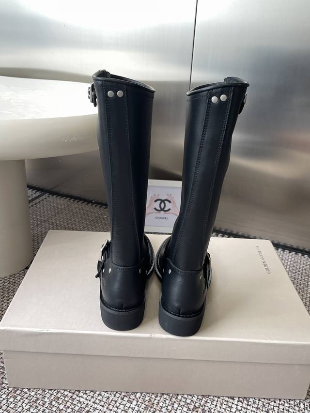 Made of high-quality genuine leather, these boots are delicate, durable, and have a good sheen. They are high-top riding boots with metal buckle elements that add a retro and cool style. The shoe shape is sleek, and the boot height is moderate, which has a good effect on the leg line.