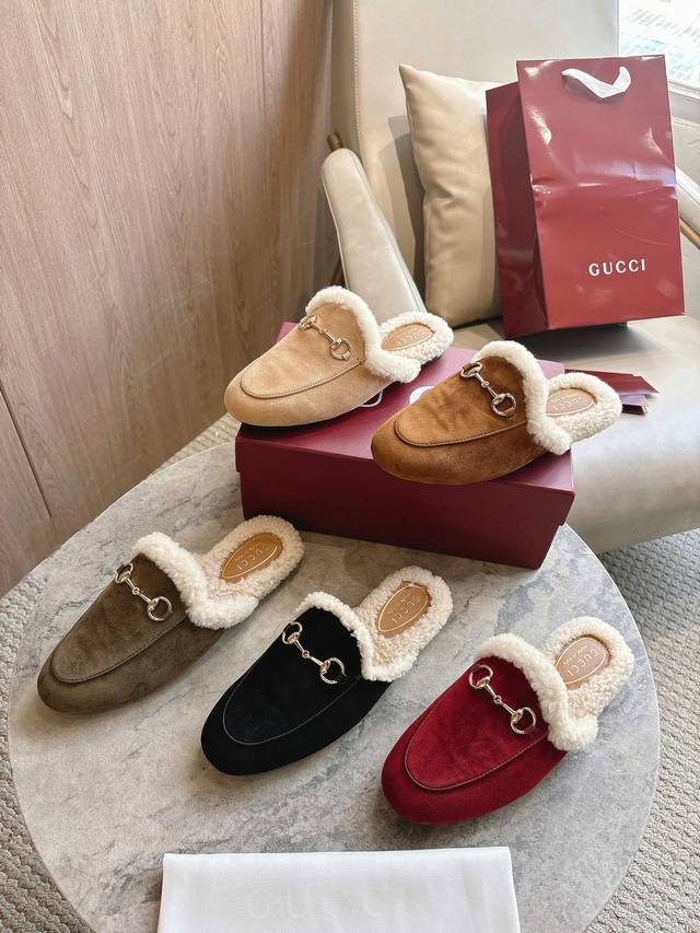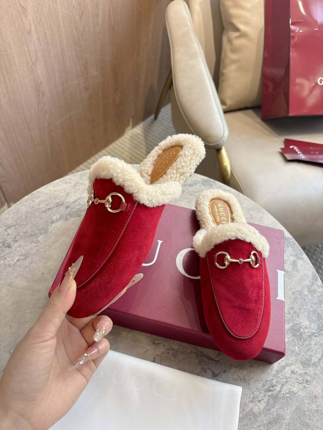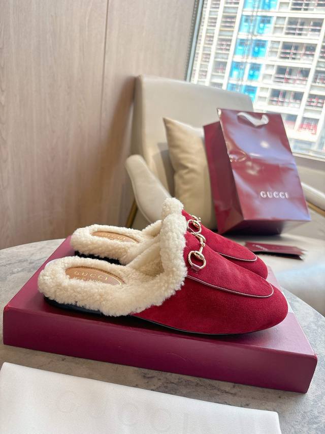 1803-3 Burgundy Gucci Princetown Slippers are renowned for their elegant silhouette, exquisite materials, and classic horsebit. This model is defined by its smooth suede and merino wool lining. Sizes: Women's 35-42, Women's 41-42. Made to order. Packaging: Full set.