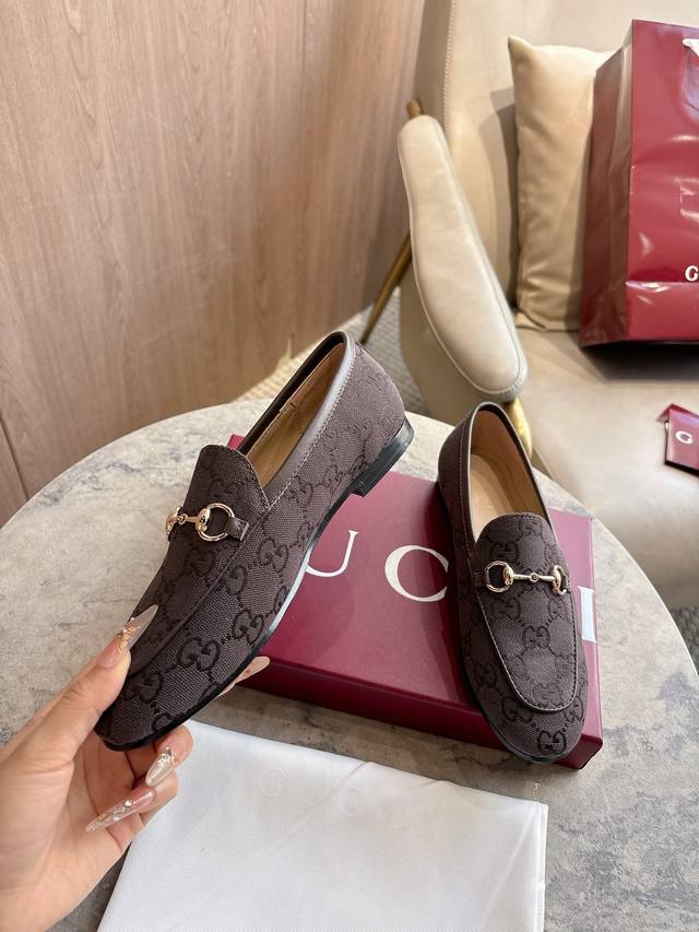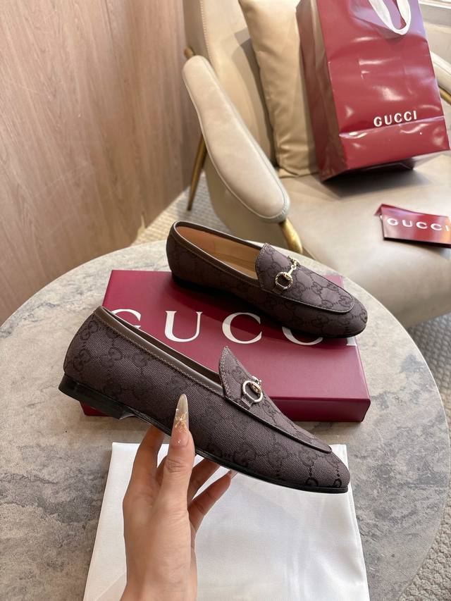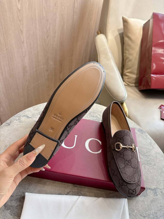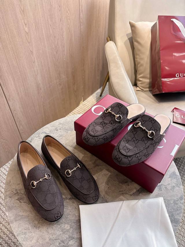 1819-1 Brown G 35-41 Since its inception, the slipper has been a signature product of the Gucci collection. This women's loafer features classic brown Gg canvas and slipper design elements, offering a bright and refreshing twist on a classic color scheme. Brown Gg Canvas Sizes: 35-42, 40-42 (Custom Made) Sole Material: Imported Italian Genuine Leather Packaging: Brand New Red Box