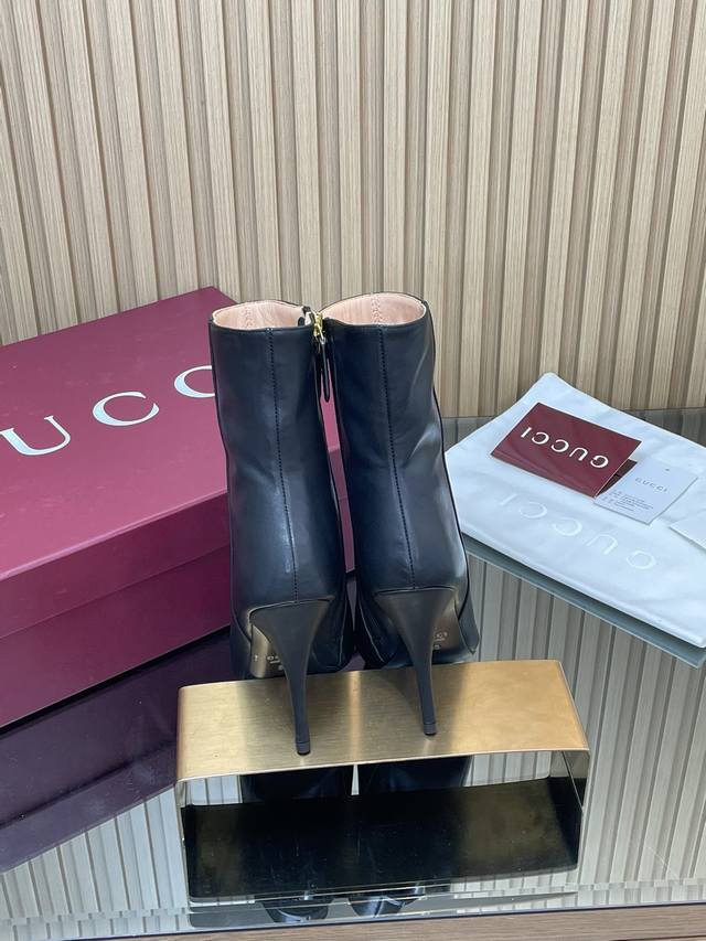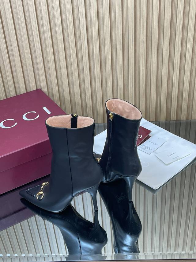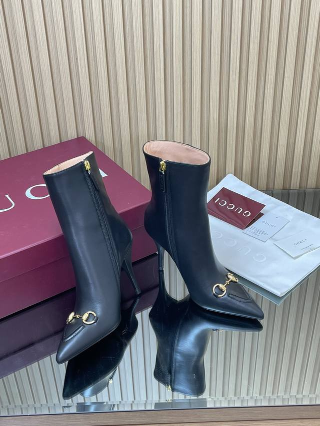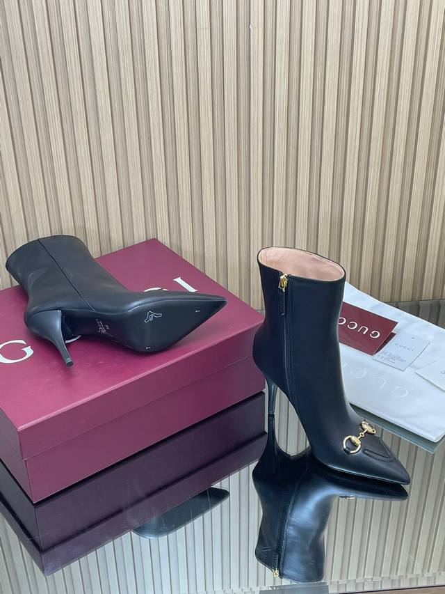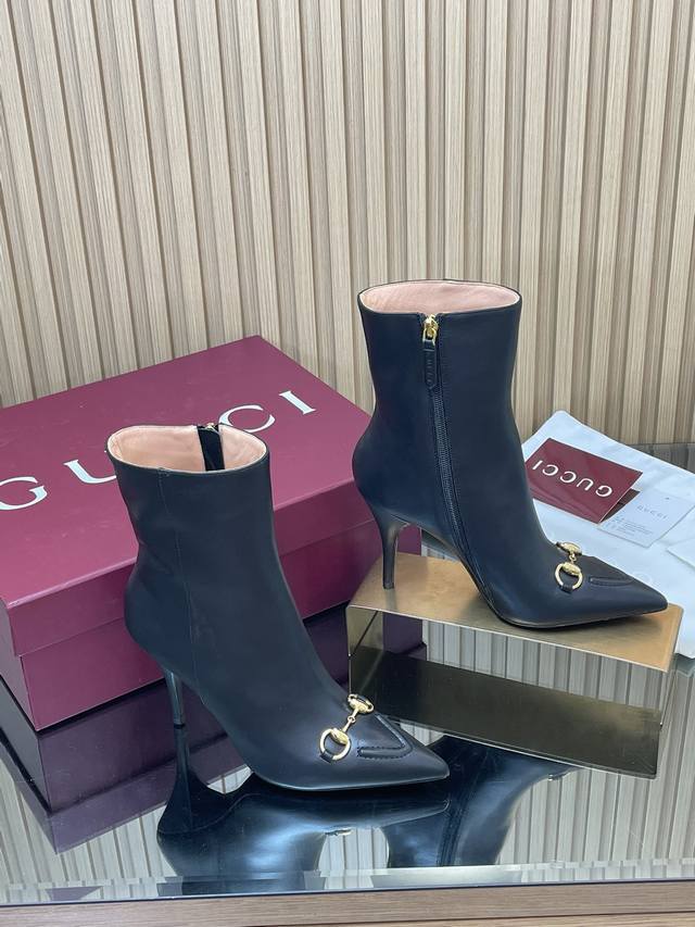 2025 Autumn/Winter Gucci New Gucci Horsebit High-Heeled Ankle Boots, Pointed Toe, Ankle Boots, Factory Price. Top-tier version, welcome to compare. 1:1 replica of the original. Note that many common versions on the market have incorrect linings. Please recognize our authentic product. Upper: Full-grain high-grade calfskin, GG monogram fabric. Lining/Insole: Full-grain high-grade black lambskin. Sole: Italian top-grade genuine leather. Heel height: 10cm. Sizes: 35-42, 41, 40, 42. Custom orders are non-refundable. Packaging: Original full set of Anchor wine red new packaging. Gucci's creative director introduces the new pointed-toe Horsebit ankle boots, a commitment to gender equality and advocating for women's empowerment. The pointed toe and distinctive logo details highlight beauty, strength, and a spirit of freedom.