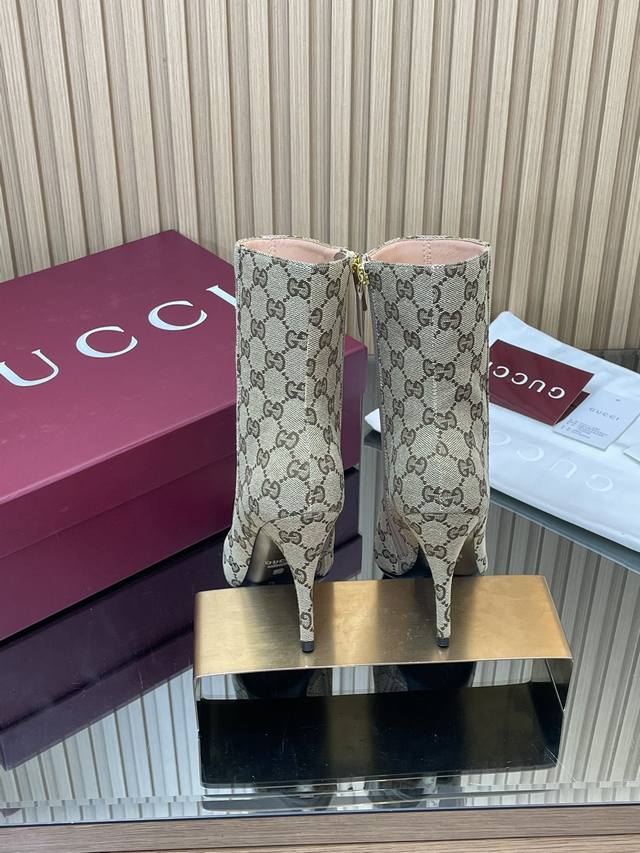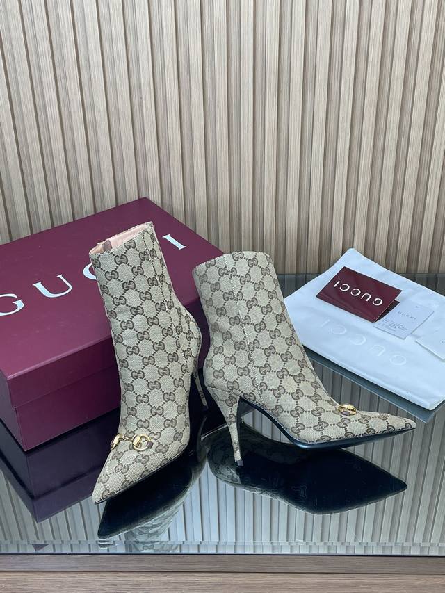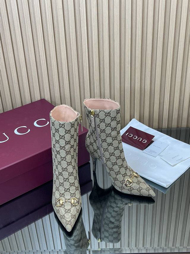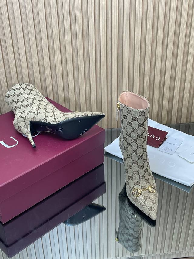 2025 Autumn/Winter Gucci New Gucci Horsebit High-Heeled Ankle Boots, Pointed Toe, Ankle Boots, Factory Price. Top-tier version, welcome to compare. 1:1 replica of the original. Note that many common versions on the market have incorrect linings. Please recognize our authentic product. Upper: Full-grain high-grade calfskin, GG monogram fabric. Lining/Insole: Full-grain high-grade lambskin. Sole: Italian top-grade genuine leather. Heel height: 10cm. Sizes: 35-42, 41, 40, 42. Custom orders are non-refundable. Packaging: Original full set, new Anchor red packaging. Gucci's creative director introduces the new pointed-toe Horsebit ankle boots, a commitment to gender equality and advocating for women's empowerment. The pointed toe and distinctive logo details highlight beauty, strength, and a spirit of freedom.