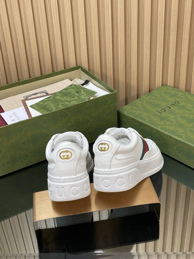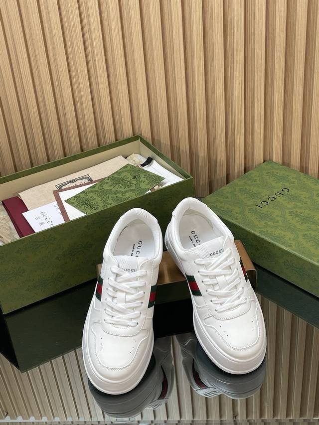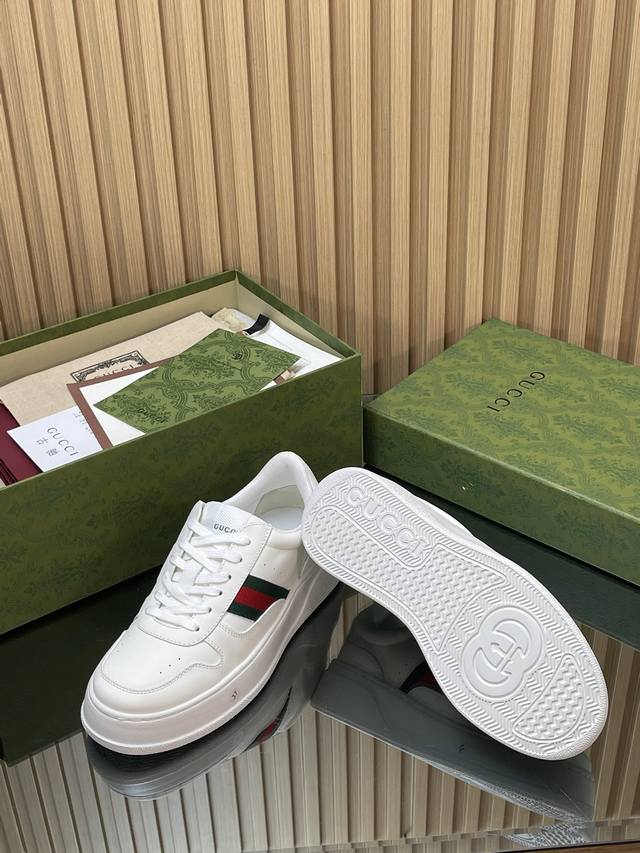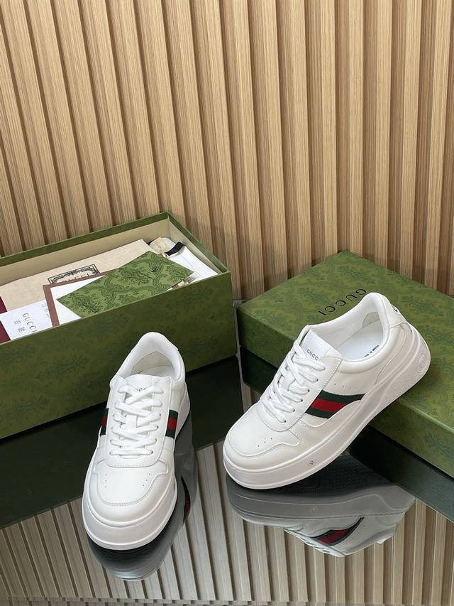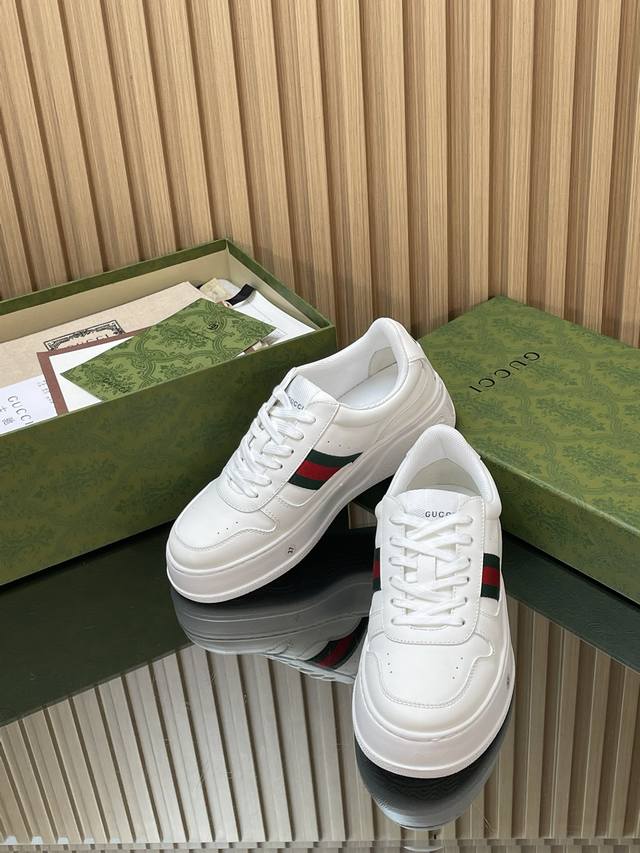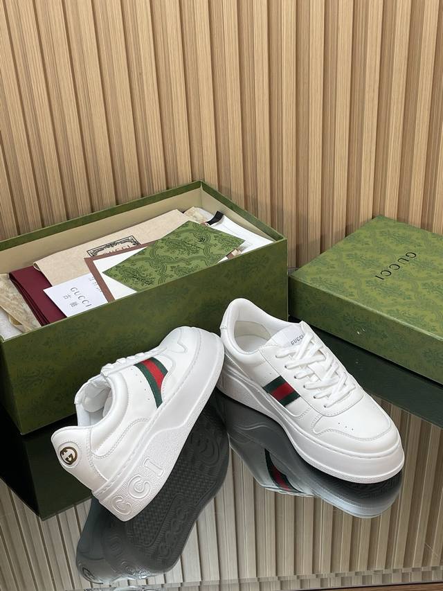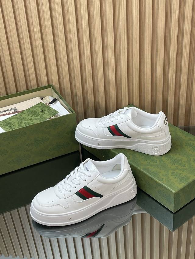 2025 Autumn/Winter New Gucci Thick-Soled Biscuit Shoes for Men and Women + Size 50 Green Red and Green Webbing Casual Shoes for Couples Original Custom 1:1 Replica, Highest Version Comparable to Gucci, No Difference. Upper: Imported calfskin + Brand logo webbing. Lining: Water-dyed sheepskin. Insole: Cowhide. Outsole: 1:1 original mold, ultra-lightweight and wear-resistant sole. Sizes: Men's and Women's 35-45. Men's 39, 45, Women's 40, 41. Customized, no returns or exchanges. Packaging: Complete set of packaging from boutique airline boxes. This 2025 Autumn/Winter series sneaker features a thick-soled structure, cleverly utilizing a corridor design, color scheme, and material elements to showcase a retro style . The shoes use leather with red and green webbing details, and the thick rubber sole adds to their exquisite charm.