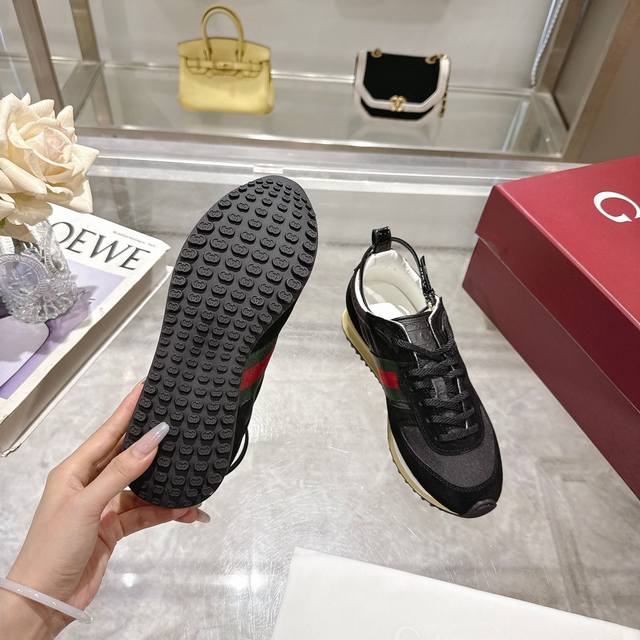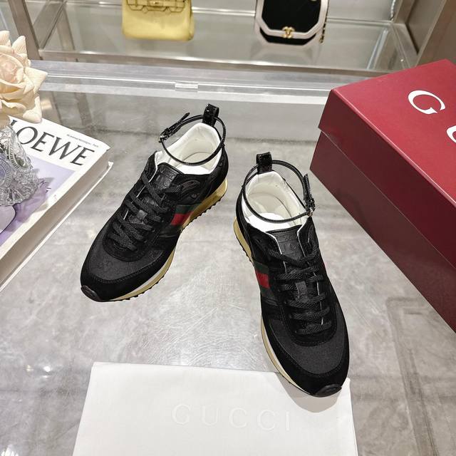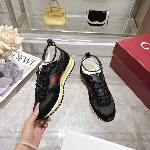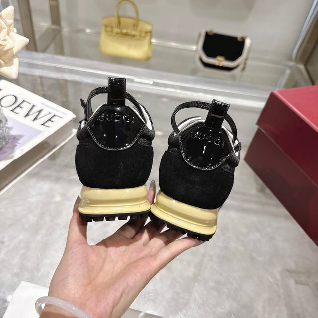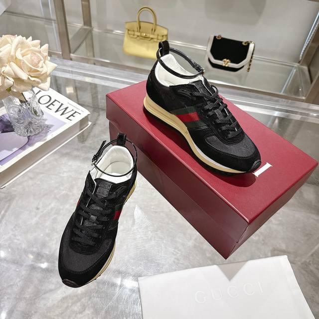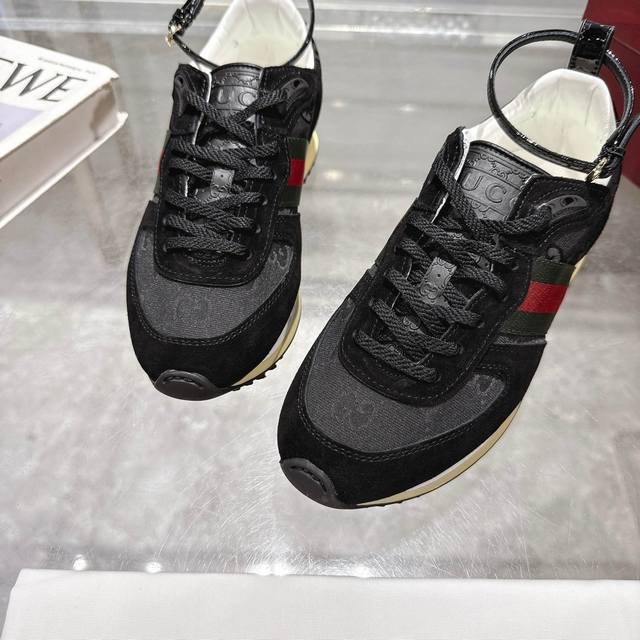 2025 Dynamic piece. Lightweight and flexible outsole with a special treatment exudes a rich retro feel. Removable and adjustable ankle strap. High-frequency embossing of the tongue for a 3D Gucci logo. Comfortable and breathable fabric lining. Ultra-light vacuum foam sole. Available in sizes 35-41, complete package, black: Available in size 42 (