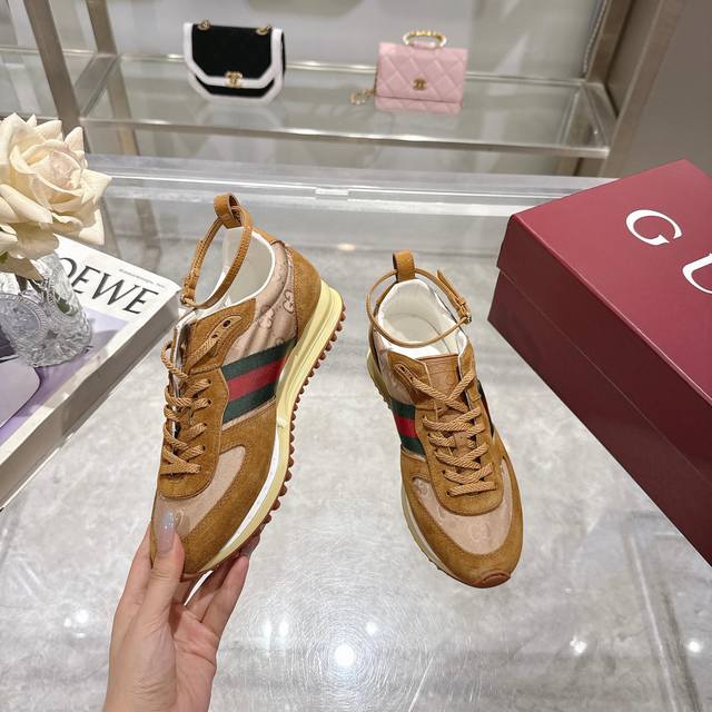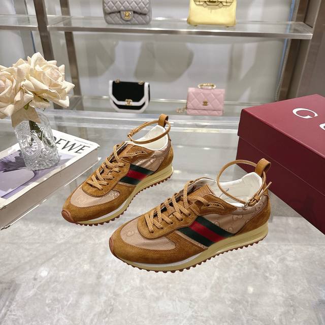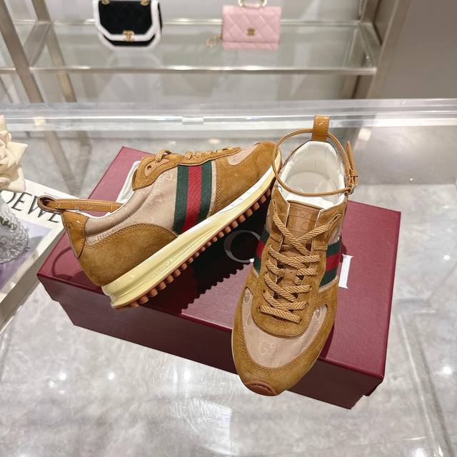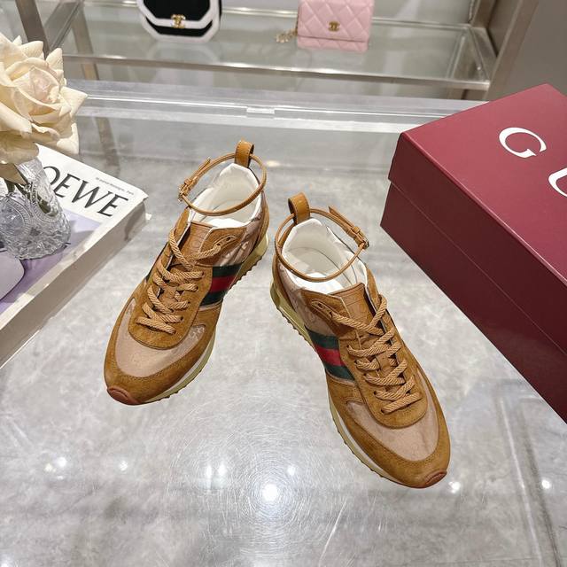 2025 Dynamic piece. Lightweight and flexible outsole with a special treatment exudes a rich retro feel. Removable and adjustable ankle strap. High-frequency embossing of the tongue for a 3D Gucci logo. Comfortable and breathable fabric lining. Ultra-light vacuum foam sole. Sizes 35-40, complete package. Camel red: Available in size 41,
