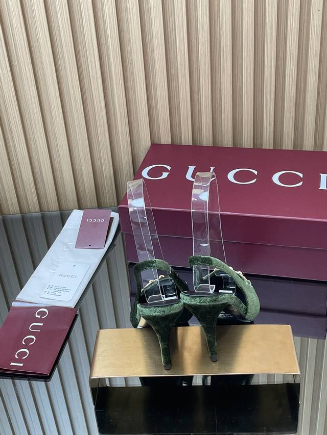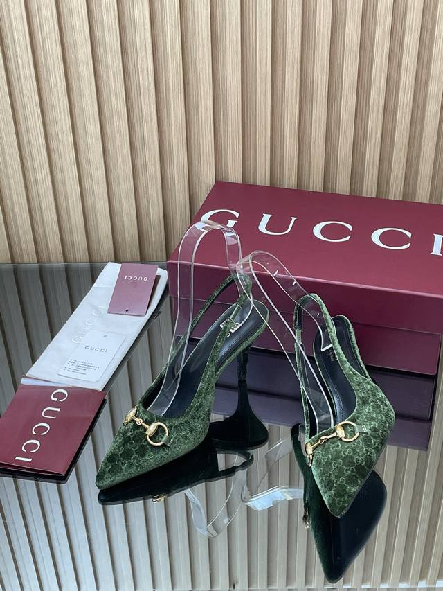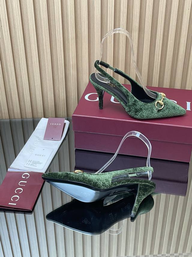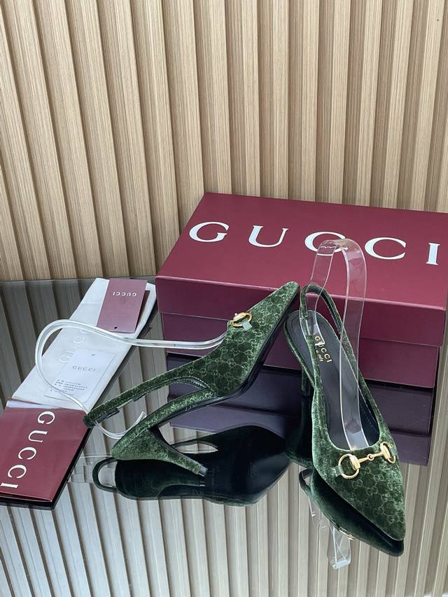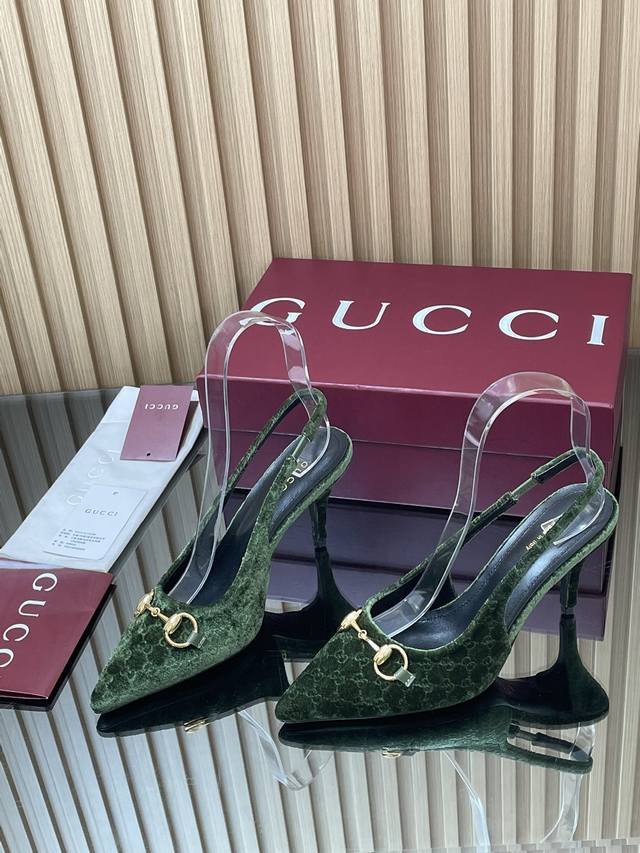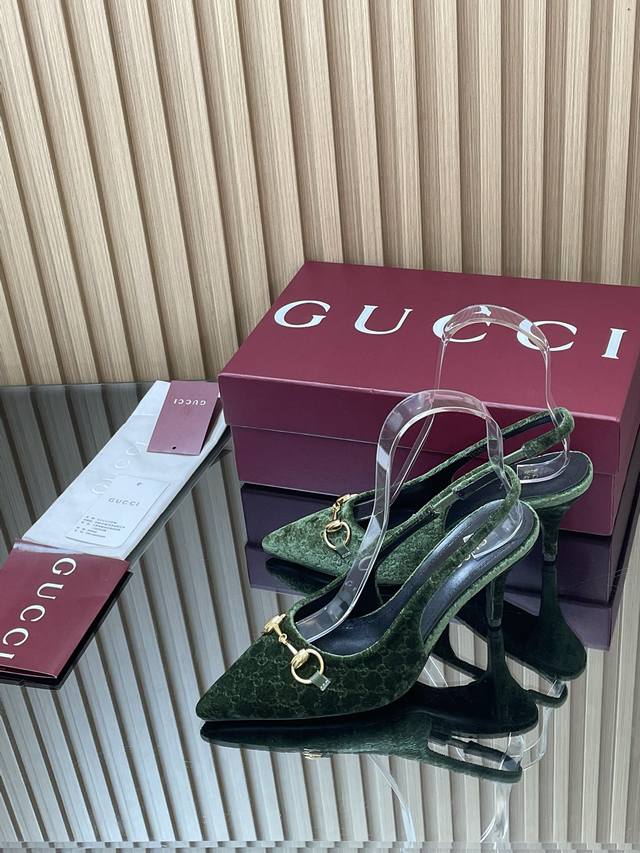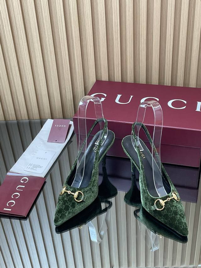 2025 Early Fall Gucci Gucci Horsebit Strapless Stiletto High-Heel Pointed-Toe Sandals. Imported silky GG gold velvet sandals, factory price p