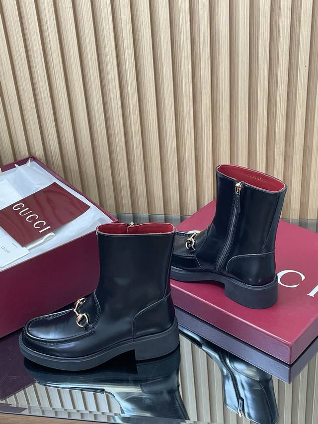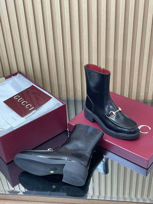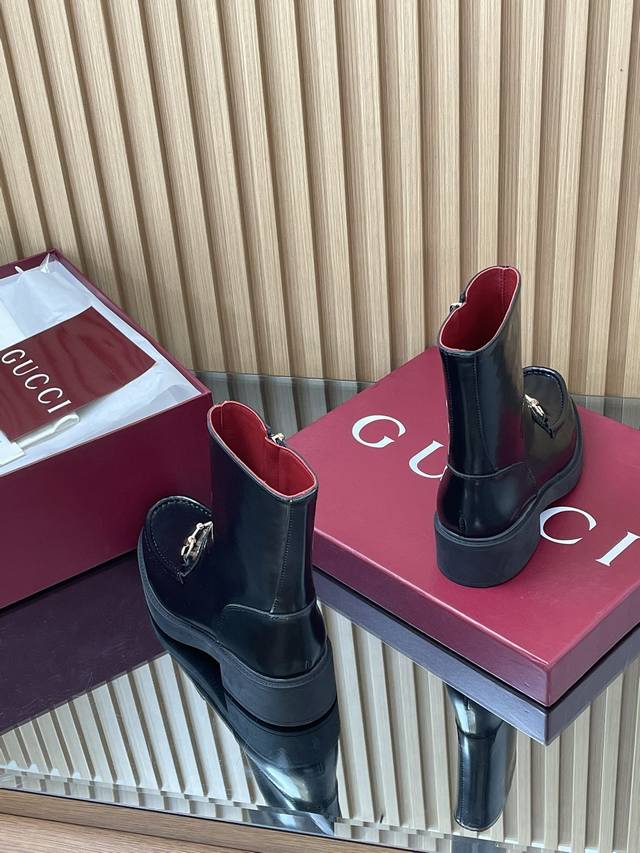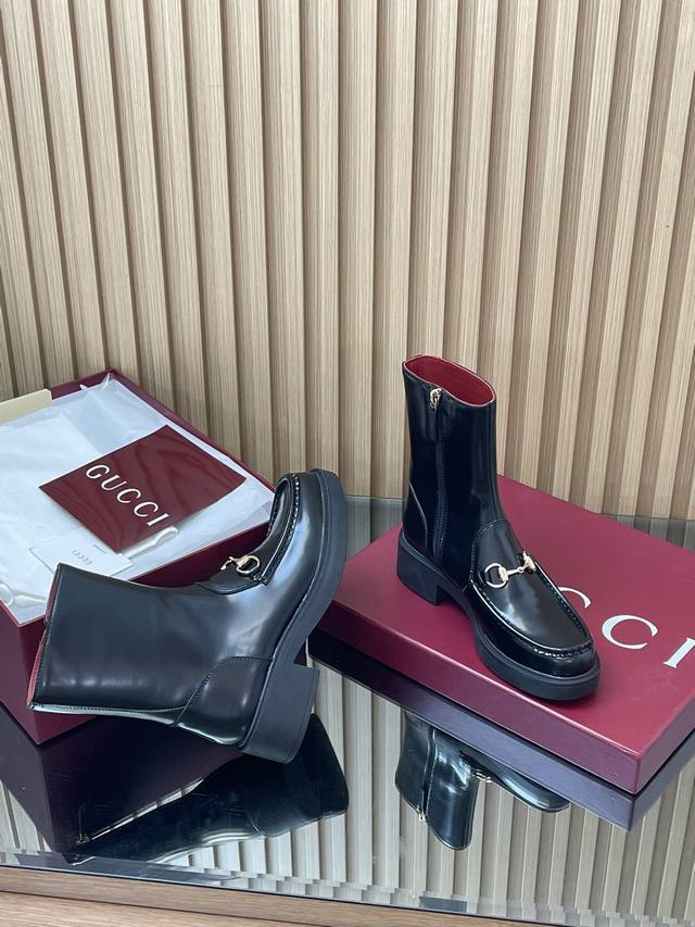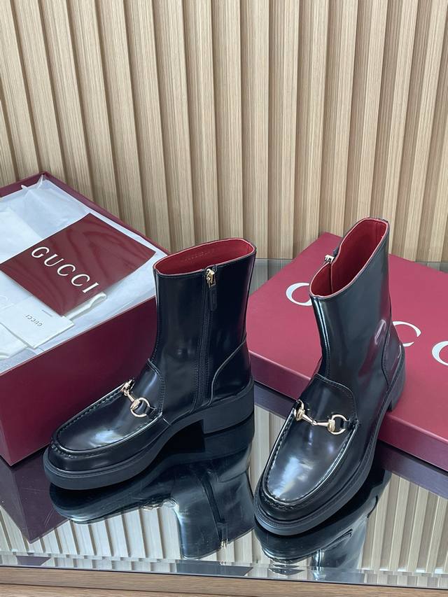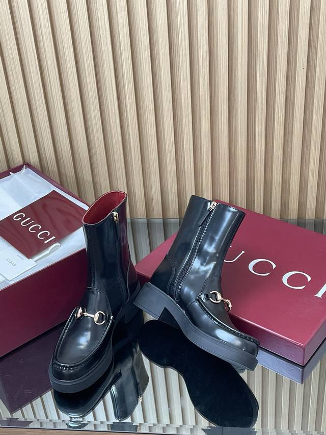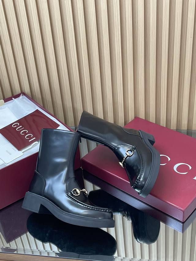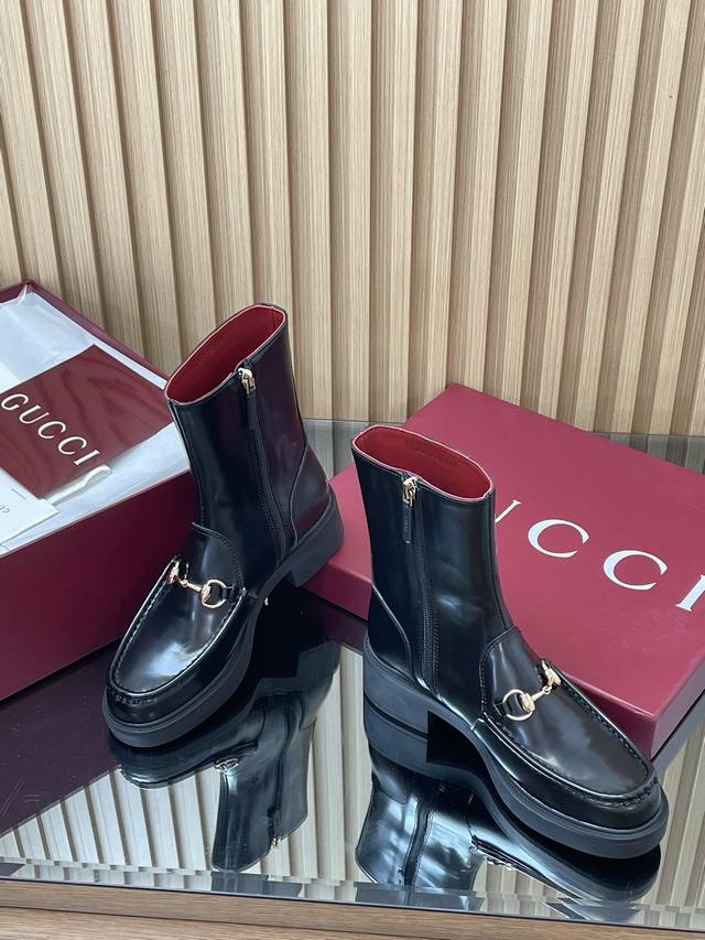 2025 Gucci Fall/Winter Newest Gucci Grooved Bee Sole Horsebit Platform Ankle Boots Chelsea Boots High-end boutique item, top-quality import. This ankle boot combines fashionable elements from boot and soft-top shoe designs, featuring a lightweight foam rubber grooved bee sole. The iconic pattern continues to shine in Gucci's new collection, while the classic horsebit accessory highlights the brand's equestrian heritage. This design enhances the overall appeal, injecting a refined and sophisticated feel into everyday shoes. Material: Imported split-edge beaded calfskin with light gold horsebit detail. Insole: Ankera burgundy calfskin. Outsole: 1:1 mold-developed high-tenacity foamed rubber outsole with a honeycomb pattern. Absolutely not heavy or stiff, and will never collapse. All materials and craftsmanship are consistent with the Y version. Sizes: 35-42 (standard size 404142, custom-made). Heel height: 4.5cm, forefoot 2.5cm. Packaging: High-end boutique packaging .