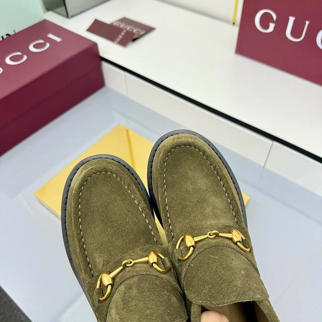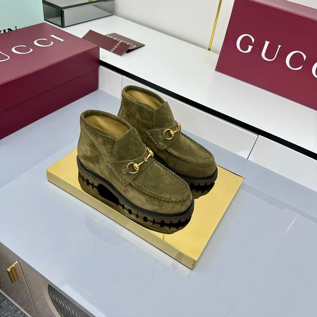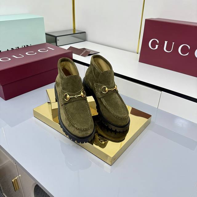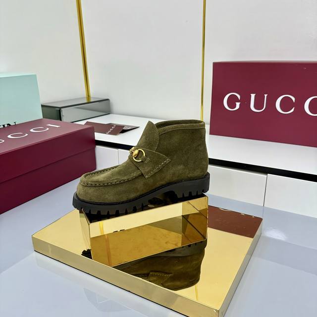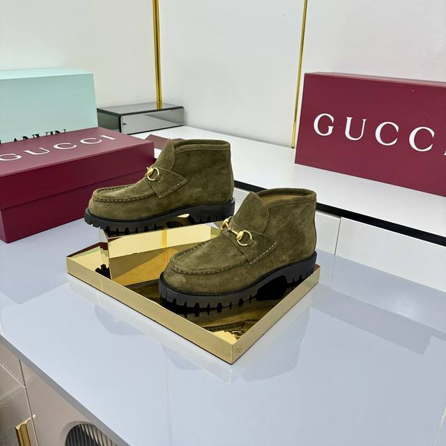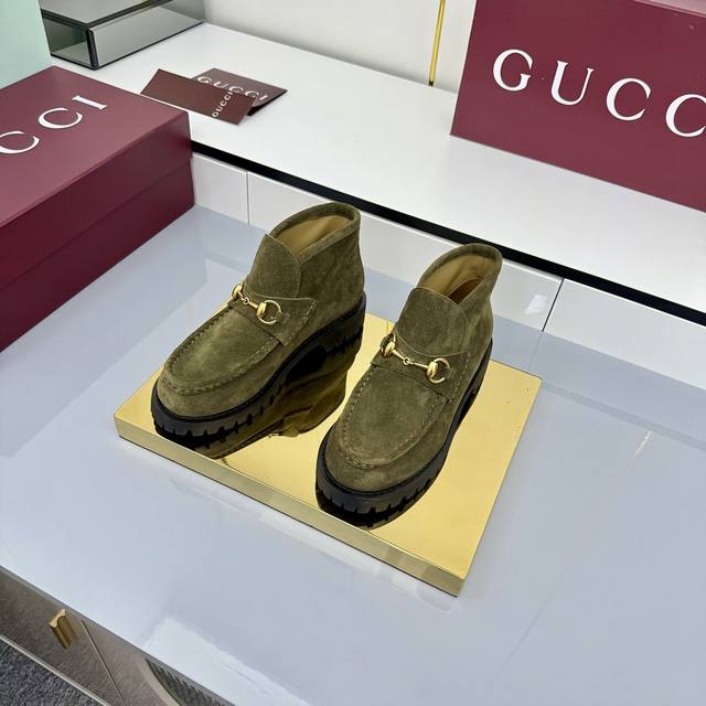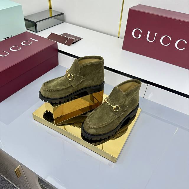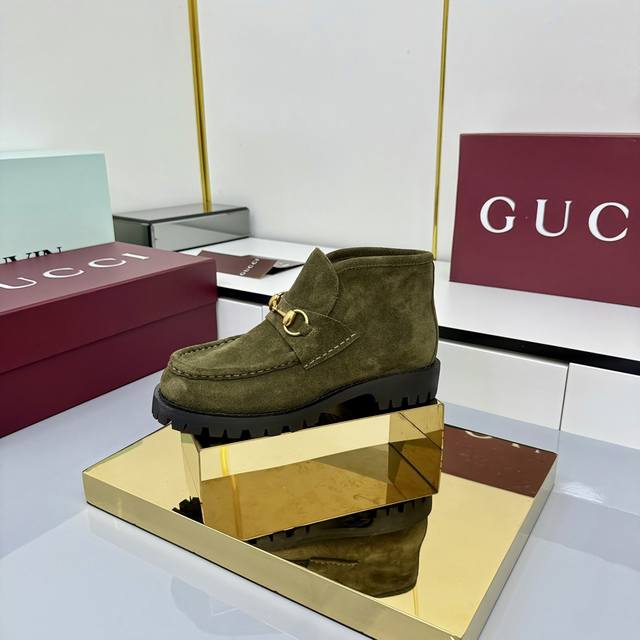 2025 - This Gucci Horsebit ankle boot features a classic loafer silhouette, blending heritage design with modern sophistication. The boot boasts a distinctive slim fit and is crafted from a coffee-colored suede material, paying homage to the brand's design legacy. (DDD Dark green suede material, DDD Women's, DDD Light gold hardware, DDD Horsebit, DDD Rubber sole, DDD Flat, Size 35-41, DDD Heel height: 1.5 cm)