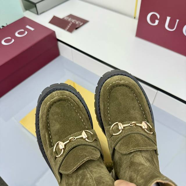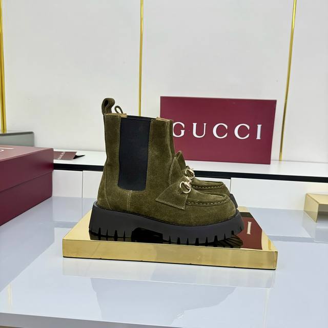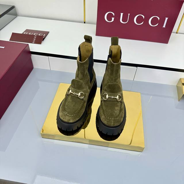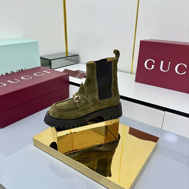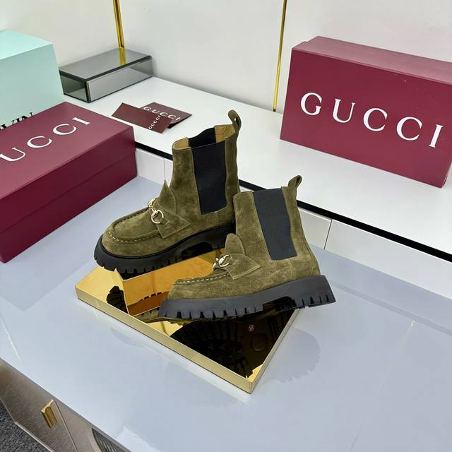 2025 - This Gucci Horsebit Ankle Boot features a classic short boot silhouette, blending heritage design with modern sophistication. The boot boasts a distinctive slim fit and is crafted from coffee-colored suede, paying homage to the brand's design legacy. Women's, Light Gold Hardware, Horsebit, Rubber Sole, Flat, Sizes 35-41, Heel Height: 1.5 cm