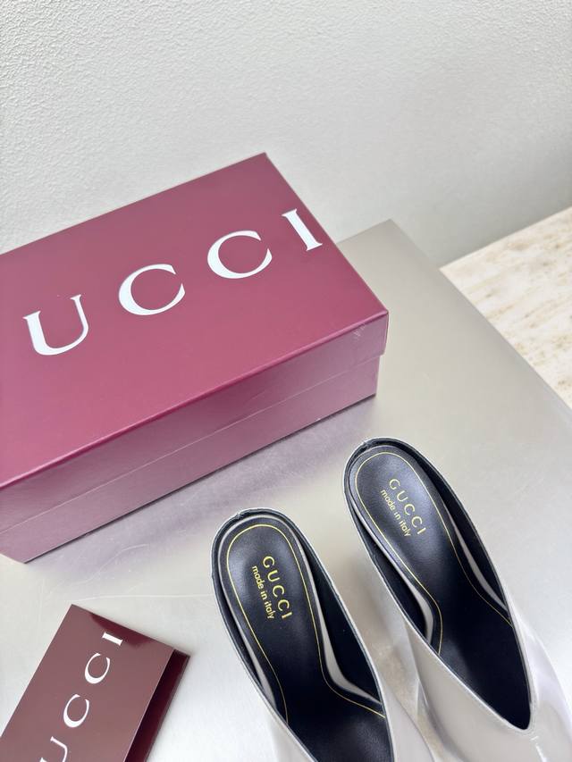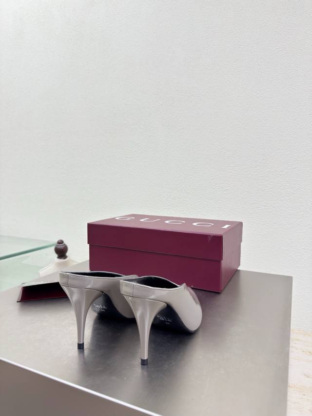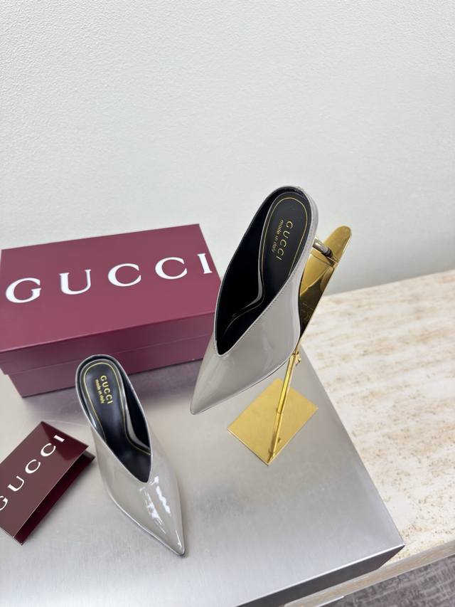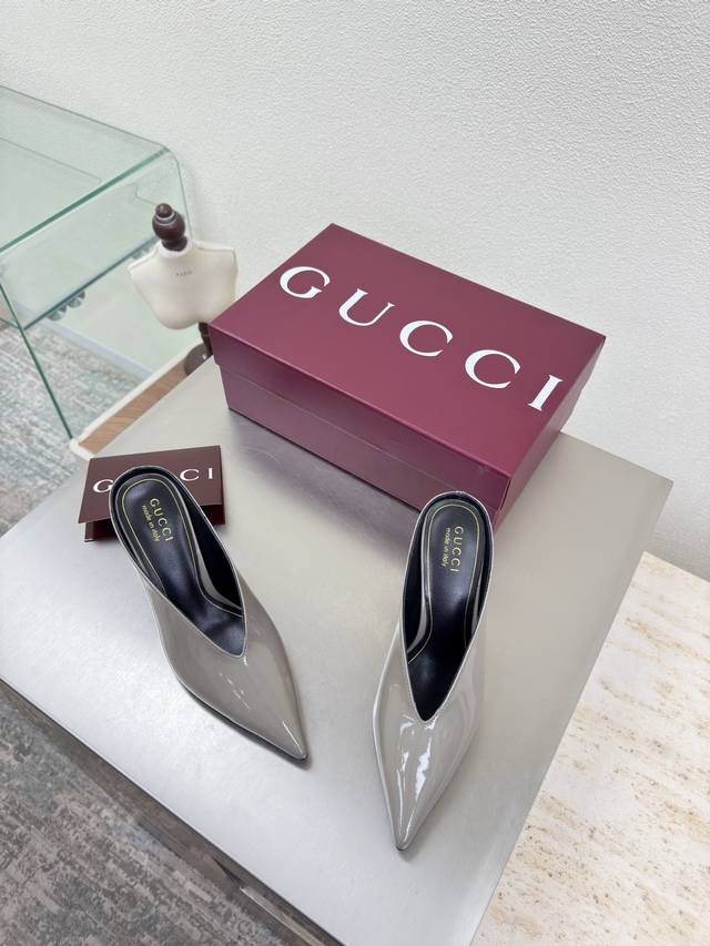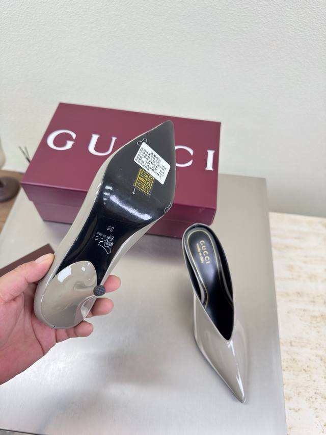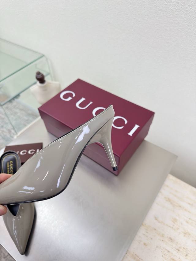 26 High-end Gucci pointed-toe mules, grey calfskin patent leather with saddle buckle, new Gucci style, hot-selling item. Features original rhinestone-encrusted classic logo on the upper, exquisite gold insole logo, Italian imported genuine leather outsole, sheepskin lining insole, classic hardware buckles (original custom fit). Sizes: 35 36 37 38 39 40 41 42. Custom sizes 40 41 42 come with original packaging.
