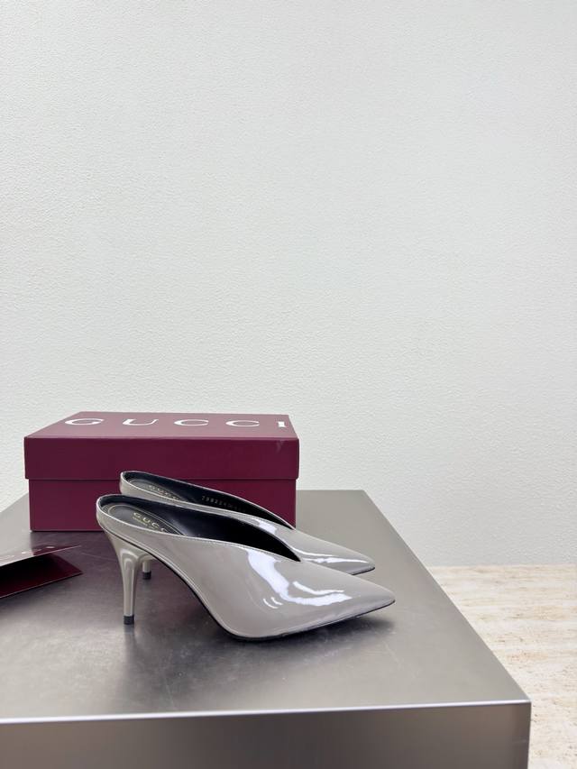 26 High-end Gucci pointed-toe mules, grey calfskin patent leather with saddle bu