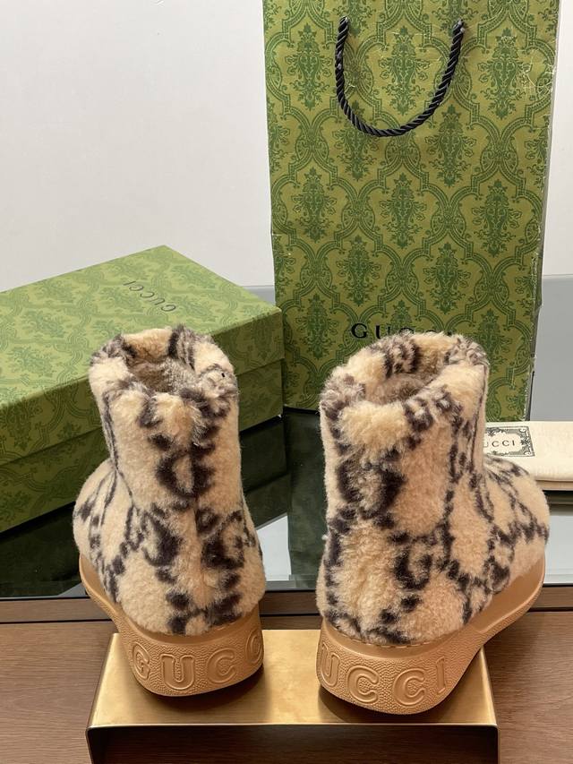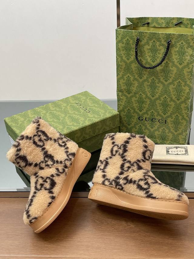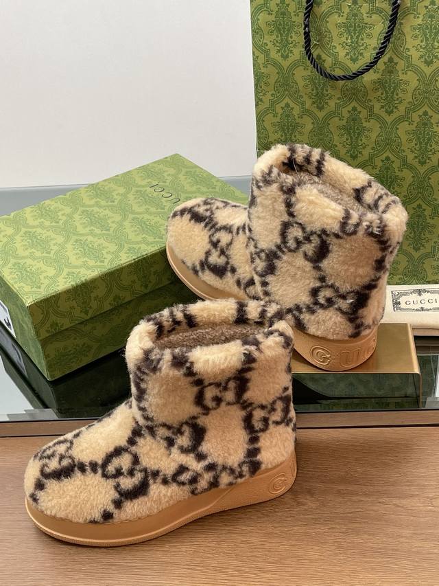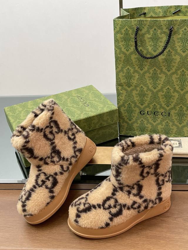 2670 Gucci New Women's Ski Boots, Thick-Soled Snow Boots, Merino Wool Warm Boots DDD These boots are made from Gg wool jacquard uppers and come in a combination of apricot and coffee tones, reinterpreting this material deeply rooted in Maison Gucci's heritage in a modern way. Another feature of the design is the luxurious merino wool finish, adding warmth and texture to the model. The rubber foam sole is adorned with the iconic Gg logo, completing the look. DDD Sizes: 35-42 DDD Apricot and Coffee Gg Wool Jacquard DDD Women's DDD Merino Wool Finish DDD Wool Lining DDD Rubber Foam Sole with Gg Pattern DDD Low Size DDD Height: 42mm DDD Made in Italy DDD