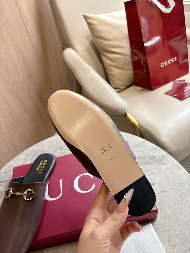 3669-1 Coffee 35-42 The iconic motif continues to shine in Gucci's new Fall/Winter 2025 collection. The new collection features meticulously crafted horsebit hardware, showcasing the brand's equestrian heritage. This women's mule is crafted from smooth suede and accented with light gold hardware for striking details. (Keywords: Leather, Light Gold Hardware, Horsebit, Leather Sole, Flat)