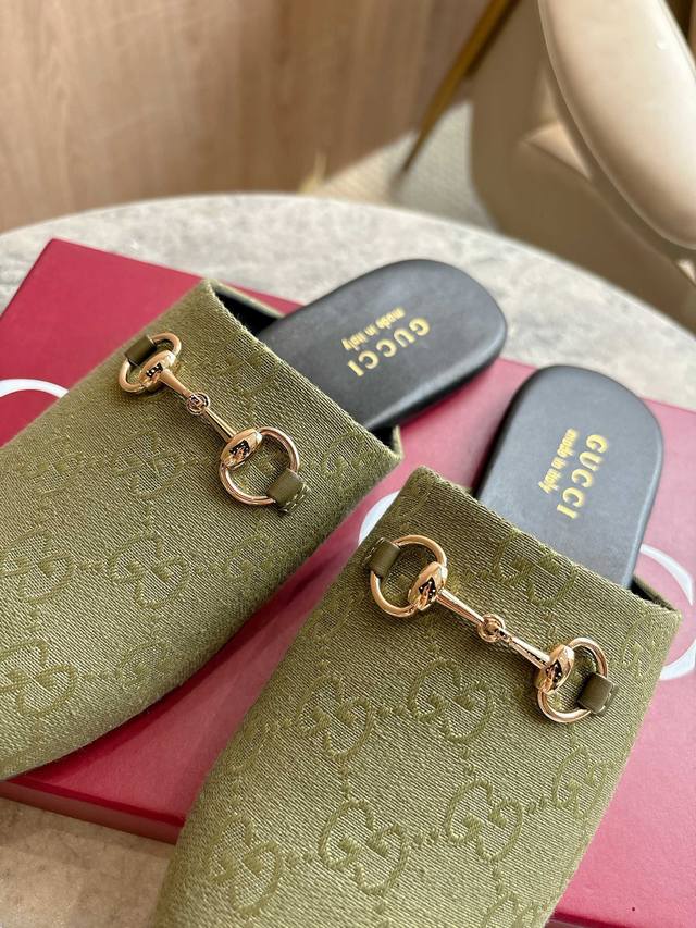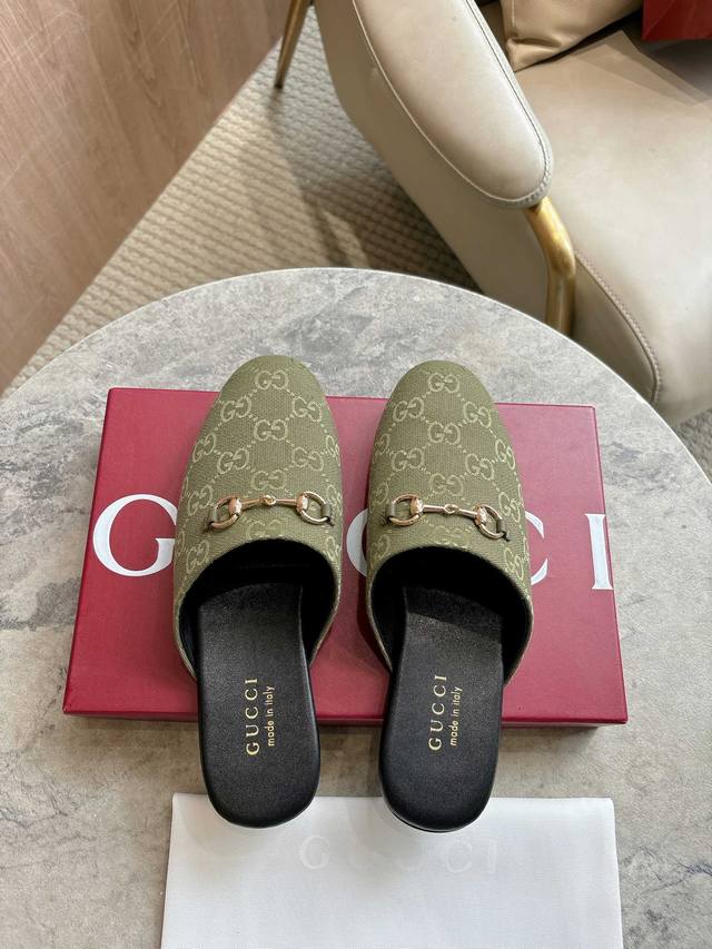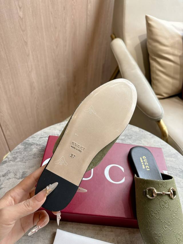 3669-1 Green G 35-41 Since its inception, the mule has been an iconic product of the Gucci collection. This women's mule cleverly combines classic military green Gg canvas with mule design elements, giving a bright and refreshing twist to the classic color scheme. Military Green Classic Gg Canvas Women's Light Gold Tone Accessories Dark Brown Leather Trimming Leather Sole Horsebit Detail Flat Shoe