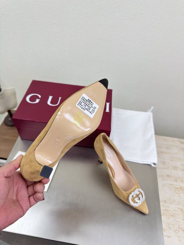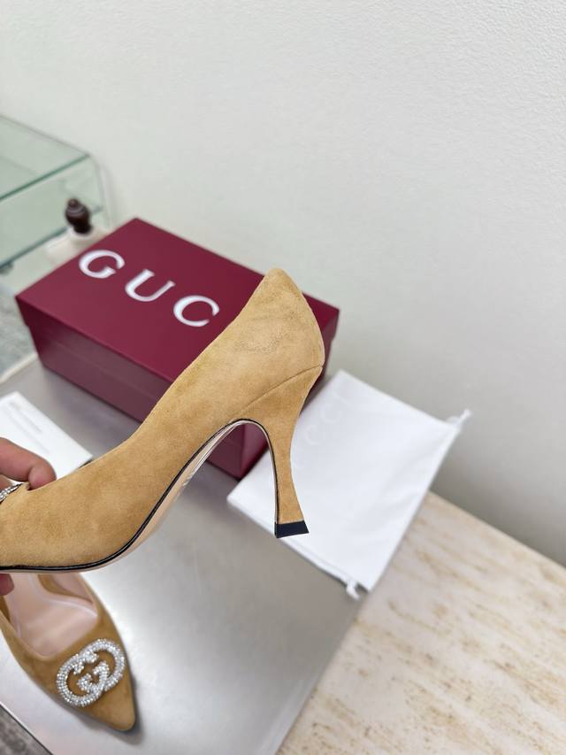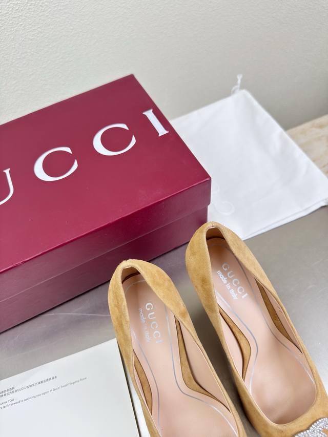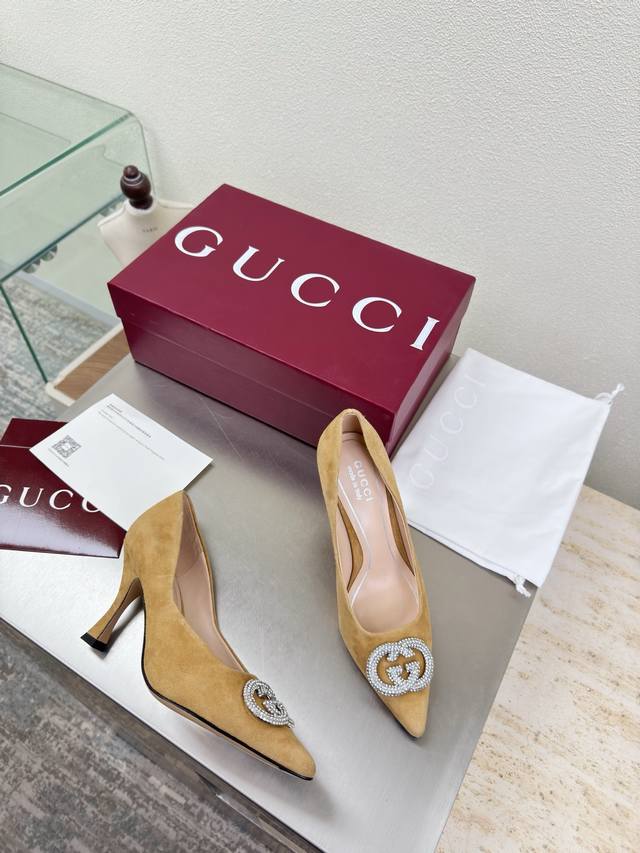 Classic Gucci Double G Logo Single Shoes with Rhinestone Buckle. Features a stylish brand logo, highly recognizable and easy to wear. High-heeled, even Gucci is not outdated. This series showcases a new fashion charm, continuing the ultra-high heel design. It has won the favor of many well-known overseas bloggers, with millions of fans showcasing it. It's a bestseller both domestically and internationally, already sold out in China. Top-tier candy-colored versions, each color is absolutely gorgeous. Multiple colors available. Upper: Suede leather. Lining: Imported sheepskin leather. Sole: Original genuine leather outsole. Sizes: 35 36 37 38 39 40 41 42 40 41 42. Packaging: Original Gucci packaging.