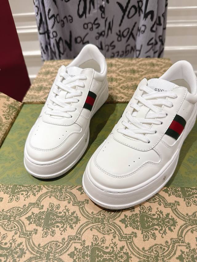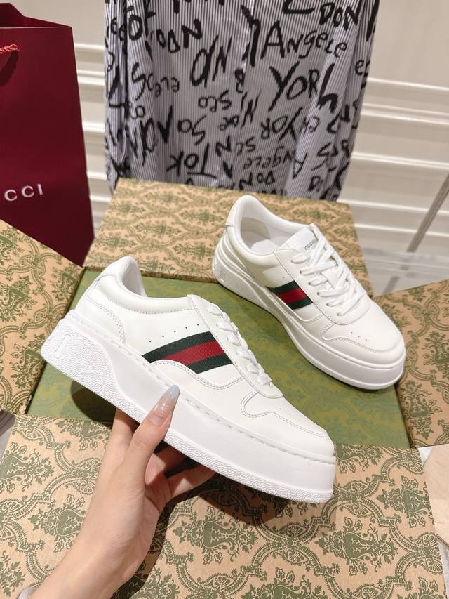 Couple's Gucci 2025Ss New Series Thick-Soled White Sneakers Casual Sneakers DDD GG Couple's White Sneakers, Same Style as the Store, Runway Style, Celebrities, Influencers, Live Streamers, etc. Must-Have DDD The design is light luxury and retro, with a thick sole for added height, similar to an upgraded version of the classic white sneakers DDD The highest quality version features original custom calfskin upper, paired with Gucci's classic monogram webbing, perforations, and embossing, cowhide lining, and cowhide insole, providing a comfortable and soft feel! Original replica 1:1 mold opening, lightweight sole, 4cm thick platform! DDD Sizes: Women's 35-40, Men's 39-45 DDD Packaging: Store air-shipping packaging DDD
