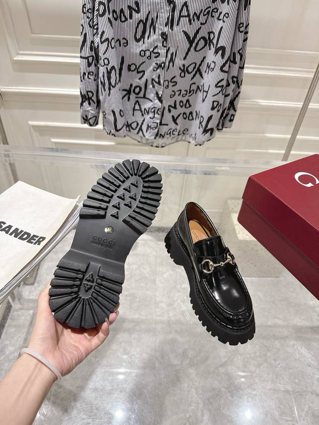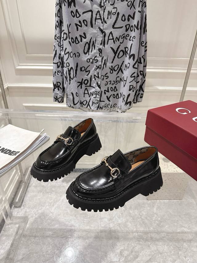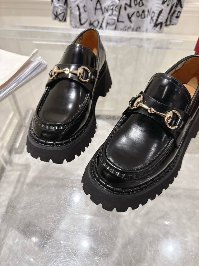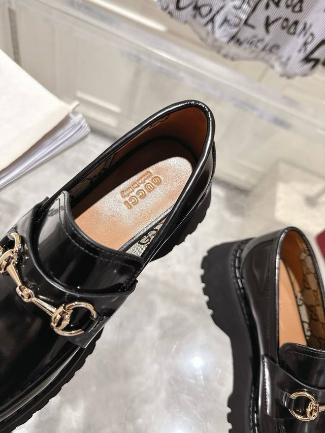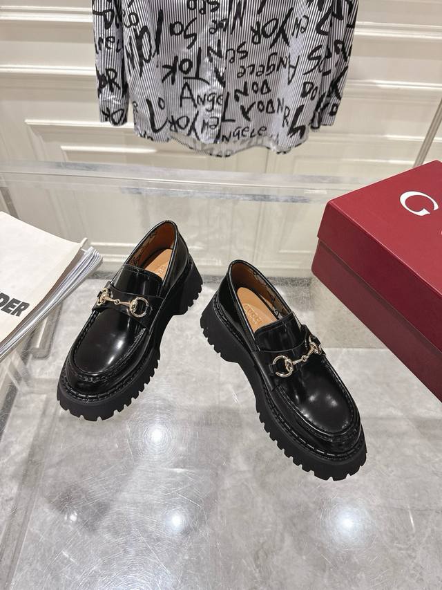 Factory Direct Import Gucci 60 Autumn/Winter New Horsebit British Style Slip-on Platform Loafers. As a tribute to the brand's equestrian origins, the Horsebit, after years of refinement, blends rich historical heritage with modern fashion trends. Original imported cowhide upper + sheepskin lining, paired with Gucci's iconic brass Horsebit. Original high-tenacity, ultra-lightweight rubber outsole with a 5cm outsole height. Sizes: 35-40.