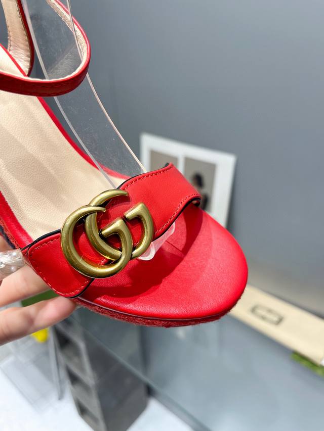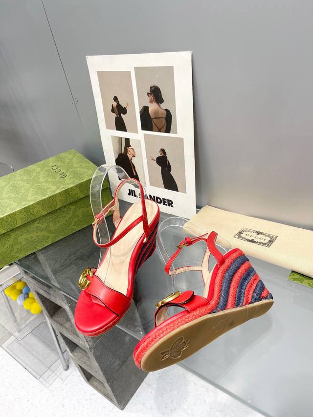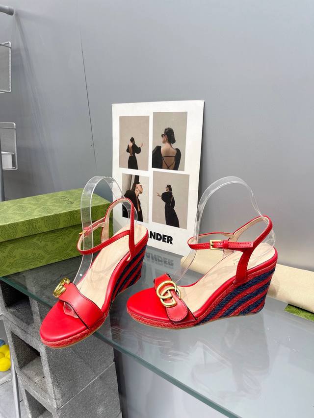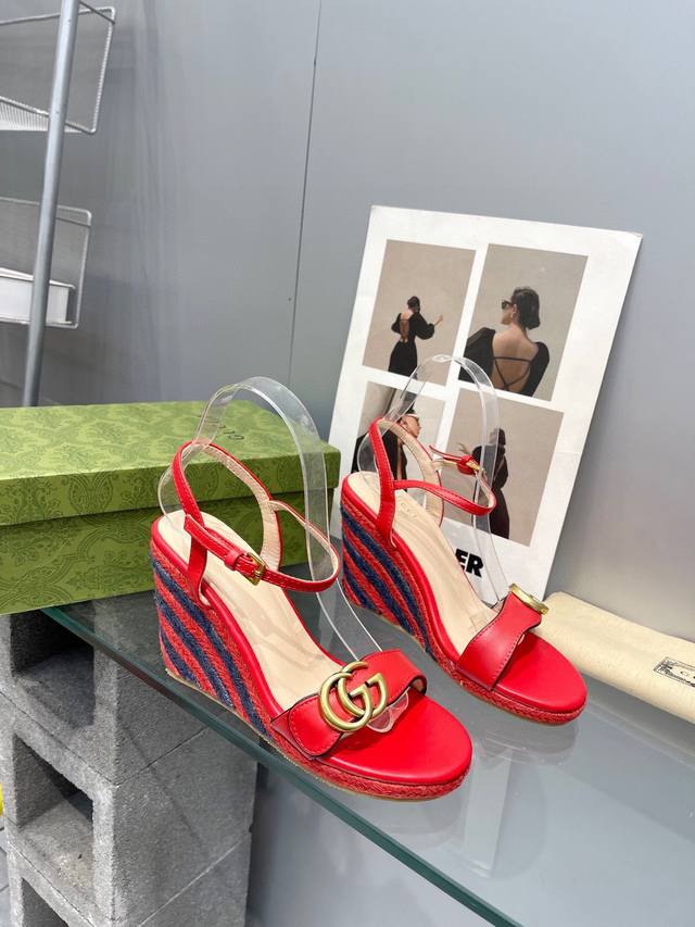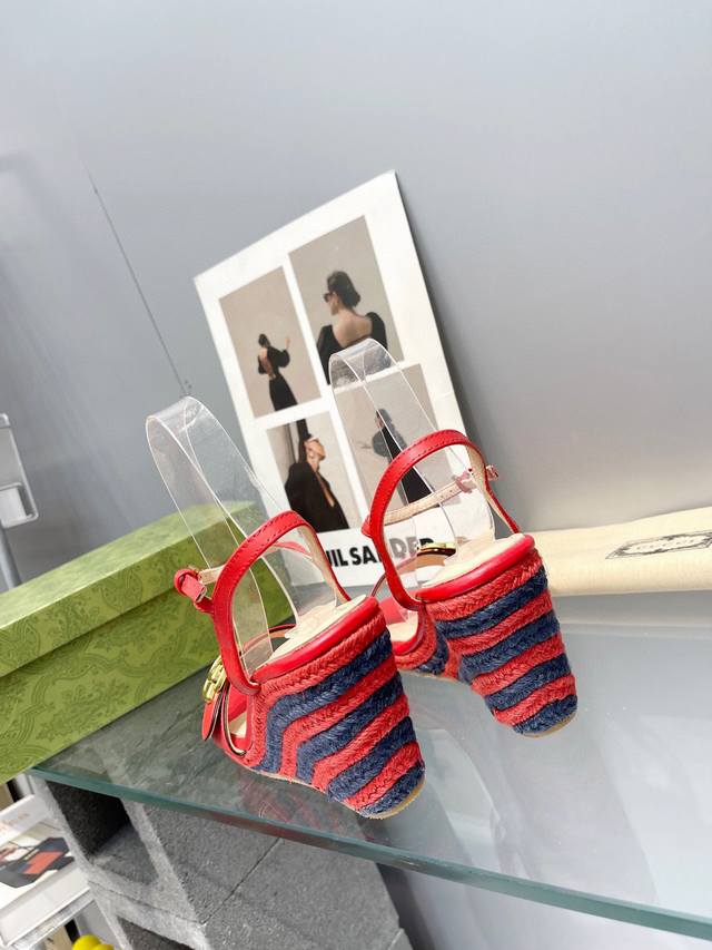 Factory direct price Gucci wedge sandals, high-quality replica, made according to the original 1.1 design. Upper is made of imported Italian mixed sheepskin, lining is mixed sheepskin, hardware is made to the original 1.1 mold with Gucci logo, rubber outsole, 8cm heel height, 1cm platform thickness. The wedge and platform are made with pure natural hemp trim. Sizes: 35 to 41. Size 41 is custom-made and non-refundable/non-exchangeable.