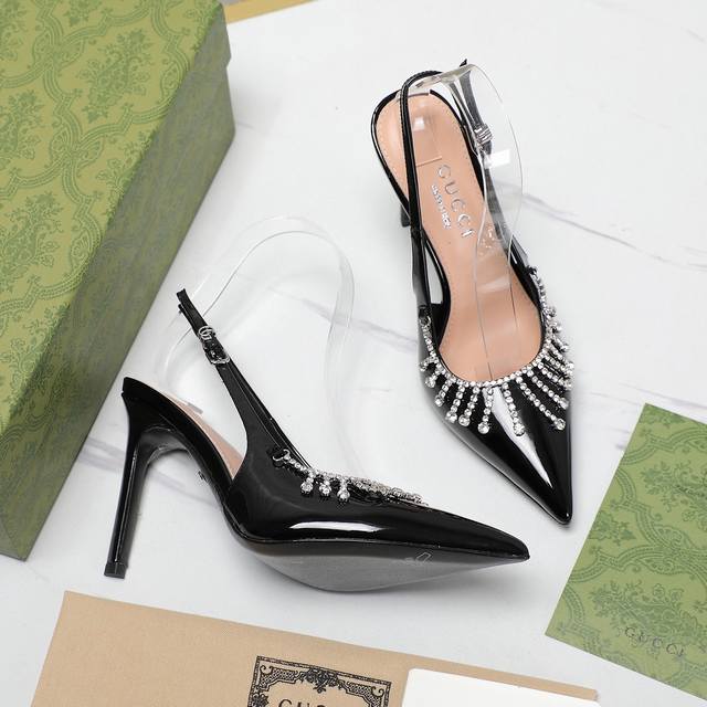 Factory direct price, highest quality version. Gucci 2026 Spring/Summer new pointed-toe rhinestone backless sandals. The beloved low-cut shoes are back! Crafted with different materials, the silk is subtly adorned with rhinestones, suitable for various occasions. The metallic heel adds a touch of glamour. High-quality material, patent leather lining, imported sheepskin lining, 10.5cm heel, Italian leather sole. Sizes: 35-42. 404142. Custom orders, no returns or exchanges. Original packaging included!