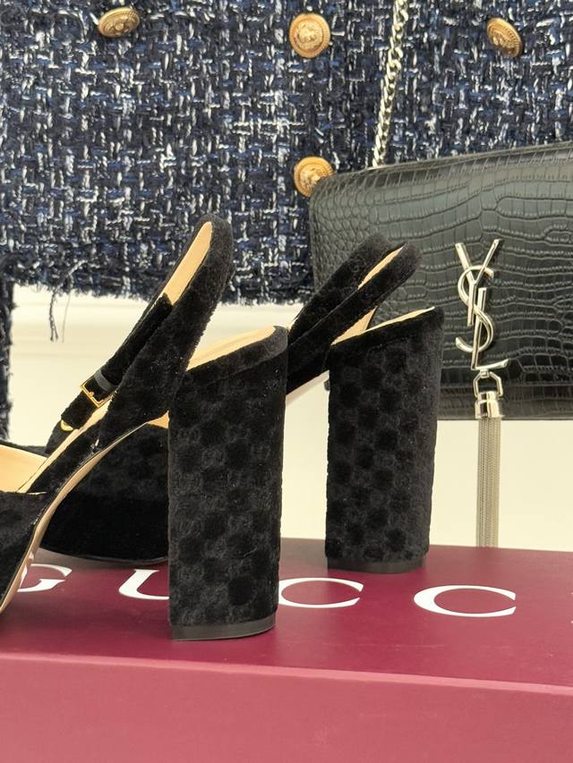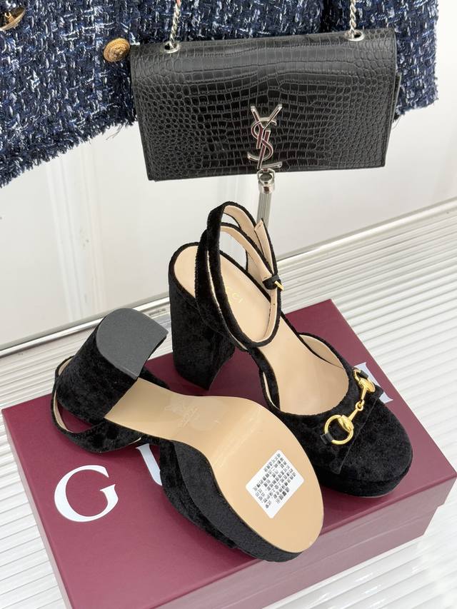 Factory Price: Gucci 25Wf New Horsebit Velvet Platform Sandals. When the vintage texture of velvet meets the iconic Gucci Horsebit, these sandals instantly embody elegance and become a timeless fashion icon. More than just a shoe, they're a statement piece of luxury. The iconic metal Horsebit runs through the shoe, perpetuating the brand's century-old equestrian heritage. The smooth texture of velvet is infused with a sharp edge, creating a perfect balance of classic and modern. The rich velvet fabric has a delicate sheen, reflecting the light and creating a sense of luxury. The meticulously designed platform not only cushions the pressure of high heels but also visually elongates the leg. Paired with a stable heel height, they offer a commanding presence while maintaining a relaxed and effortless walk. Whether paired with a floor-length dress for a dinner or paired with slim-fit trousers for a retro yet sophisticated urban look, this piece captures the essence of style, ensuring you impeccable presence at every important moment. Made from custom-made velvet, the lining is sheepskin, and the sole is imported from Italy. Sizes: 35-39, 40, 41, 42. Custom made.