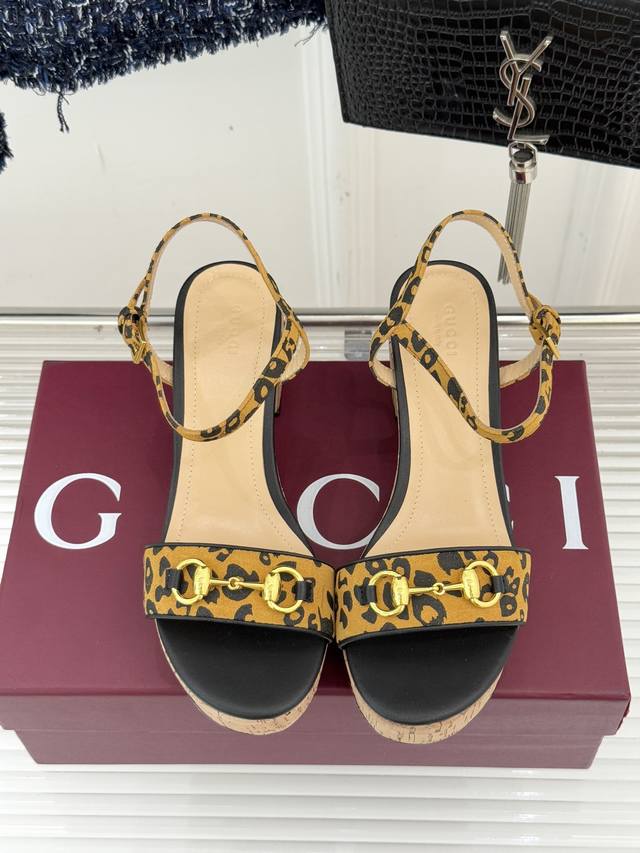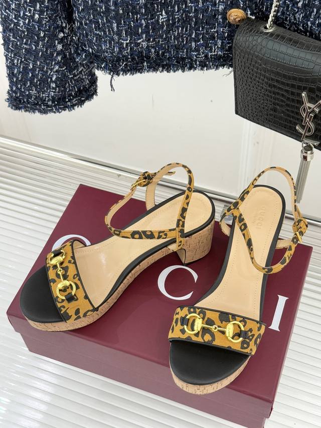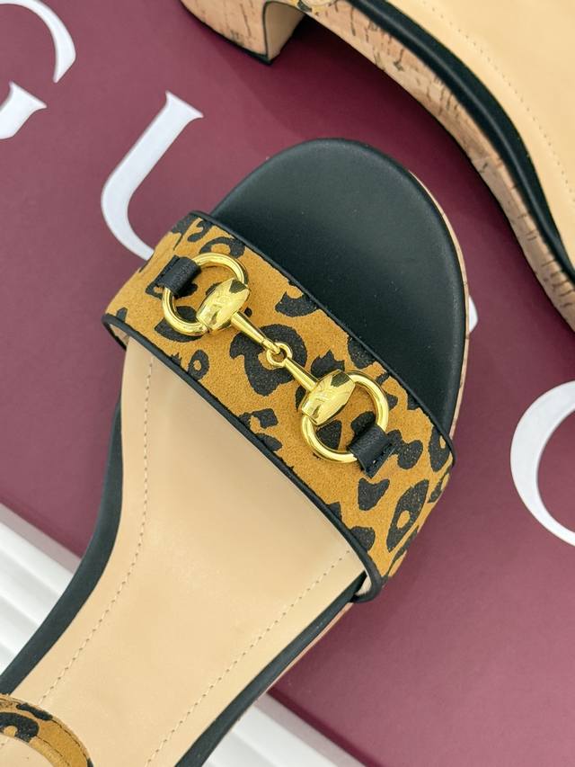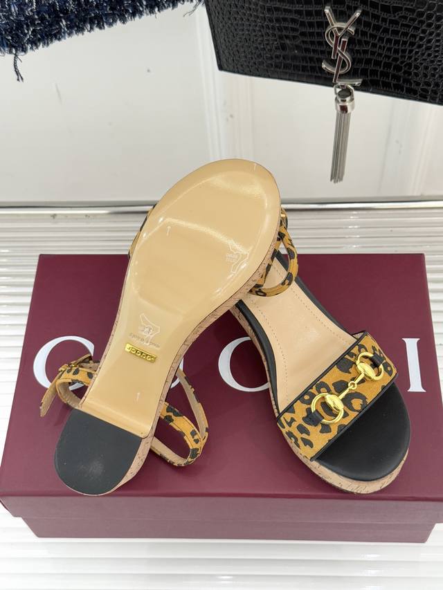 Factory Price: Gucci Classic Horsebit Leopard Print Wood Grain Thick-Sole Block Heel Sandals. When Archival DNA meets wild aesthetics, these sandals become a style statement with every step. Their flowing, wild energy conceals a fashionable edge, embodying Gucci's contemporary interpretation of animal-inspired motifs. The iconic light gold horsebit adorns the toe box, anchoring the brand's heritage with a classic equestrian symbol. The ankle buckle complements the shoe, adding a touch of sophistication. The combination of the thick wood-grain sole and block heel is a truly striking statement. The 4.7-inch heel, accented by a hidden platform, elongates the leg while providing secure support. This pair recreates the relaxed aura of vintage disco shoes. Whether paired with a flowing maxi dress for an elegant look or paired with denim for a casual statement, these sandals easily capture the attention and become a statement piece.