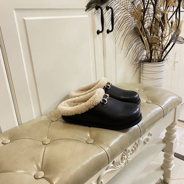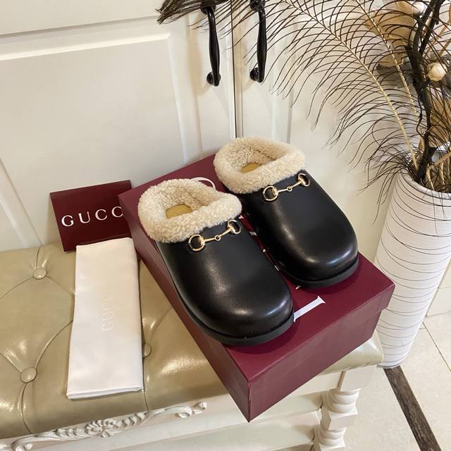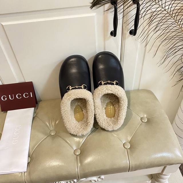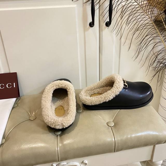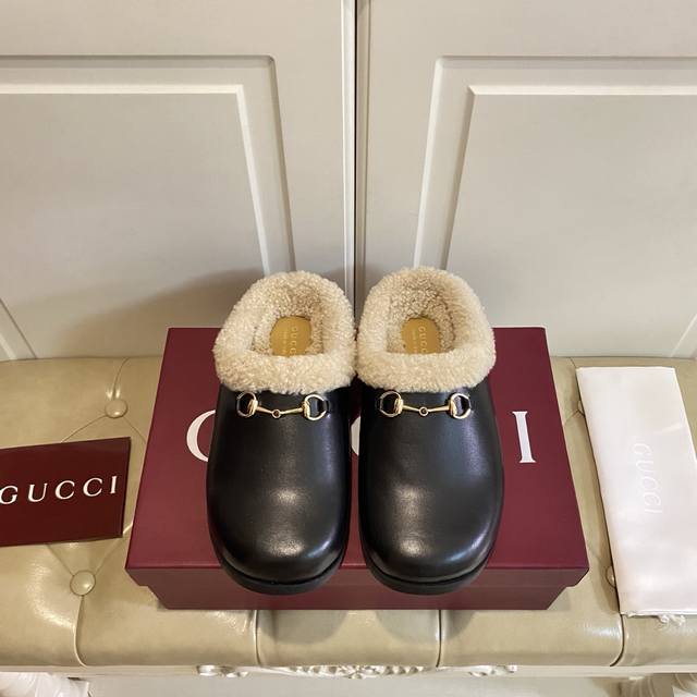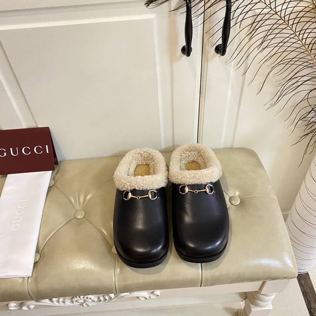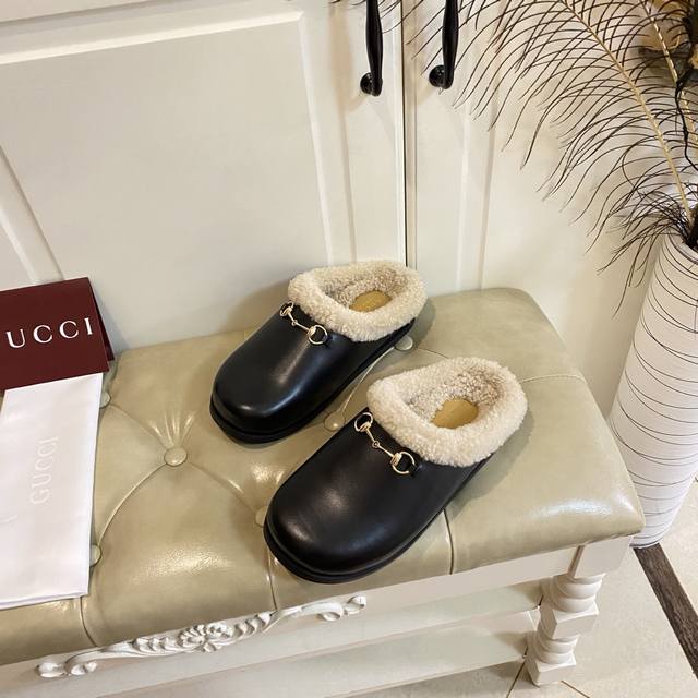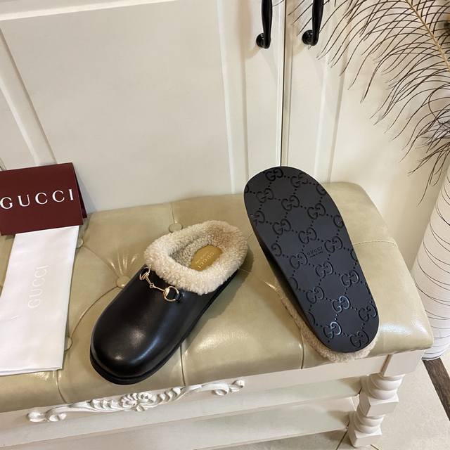 Factory Price P, Gucci New Round Toe Mule Slippers, Suede Embossed Leather Upper, Wool Lining, Rubber Sole, Sizes 36-42