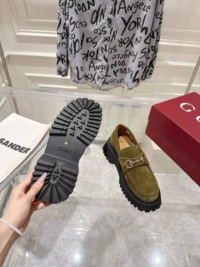 Factory release: Gucc's new autumn/winter Horsebit British-style slip-on loafers. As a tribute to the brand's equestrian roots, the Horsebit has weathered the storm, blending rich historical heritage with modern fashion. Made with the original imported cowhide upper and sheepskin lining, it features the iconic G-brand copper Horsebit. The original, developed rubber outsole is ultra-light and highly resilient. The outsole is 5cm high. Sizes: 35-40.