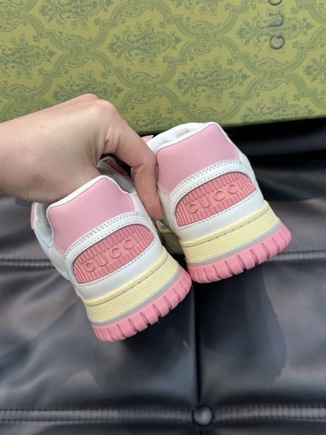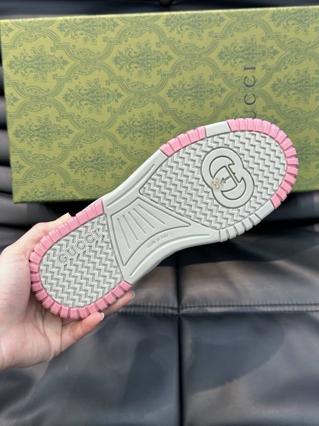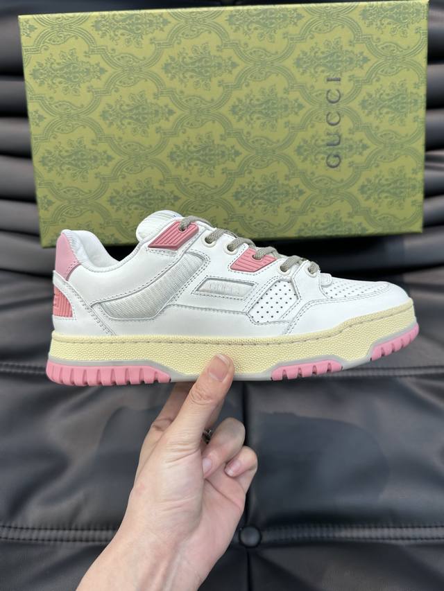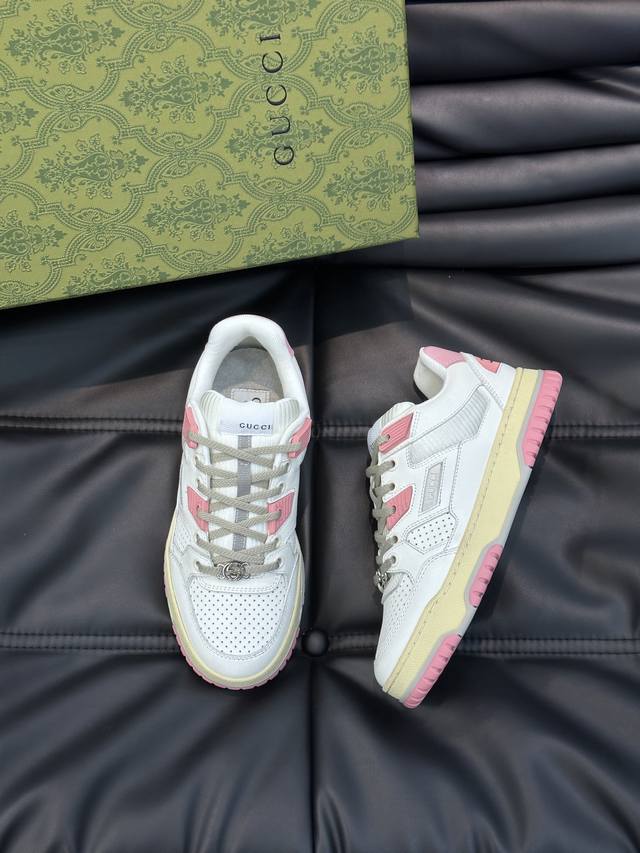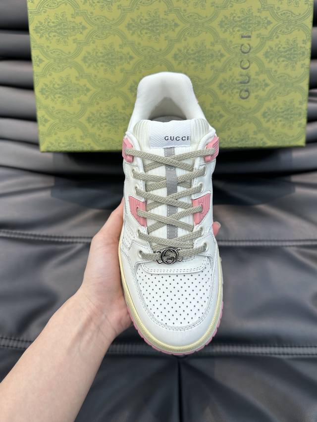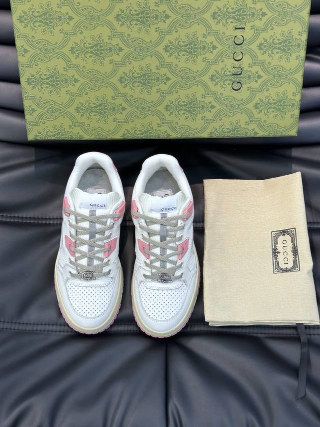 Gucc* Gucci's new distressed-effect sneakers for couples. These low-top sneakers feature a basketball-inspired silhouette, cleverly incorporating perforated panels and a distressed finish, showcasing unique craftsmanship. The interlocking double- G hardware and Gucci logo details subtly pay homage to the brand's design heritage. A rubber outsole, embellishments, and embossed sole add a modern touch to the overall design. Size: 35-45