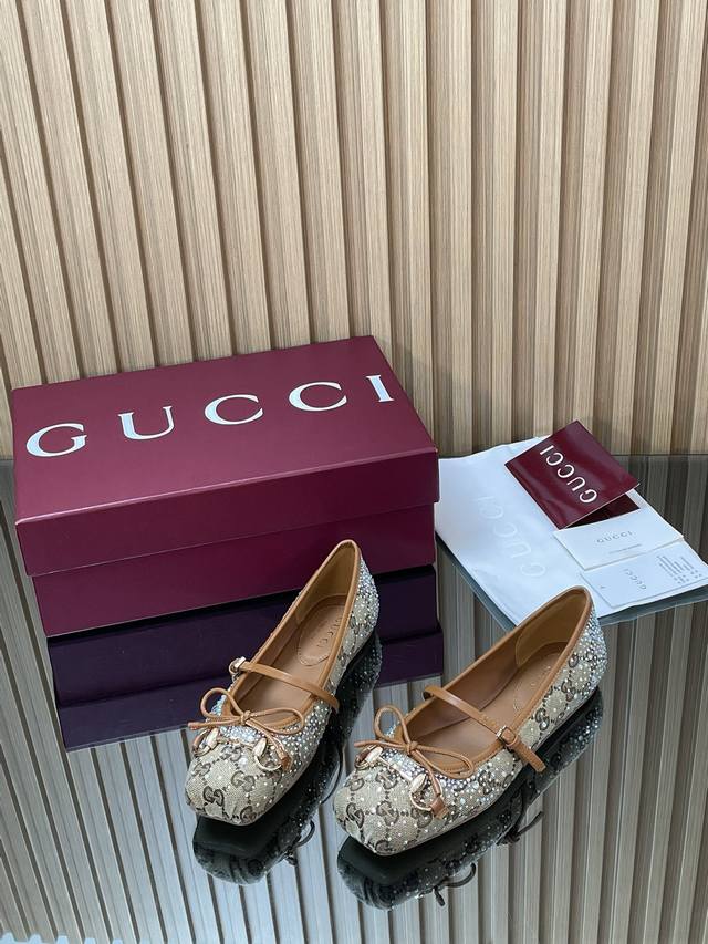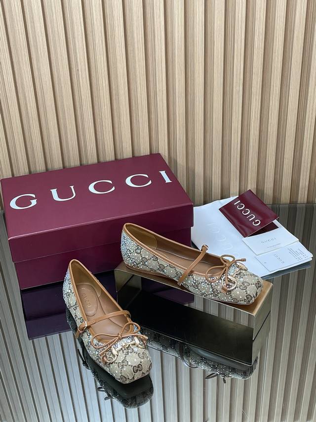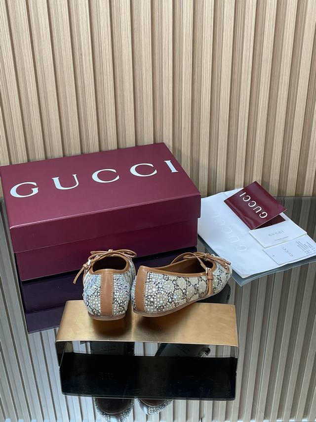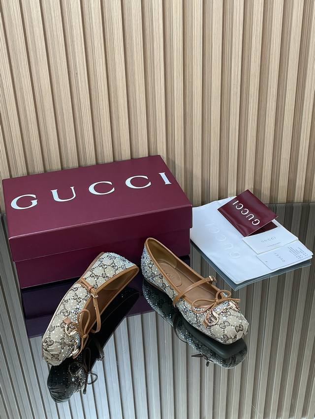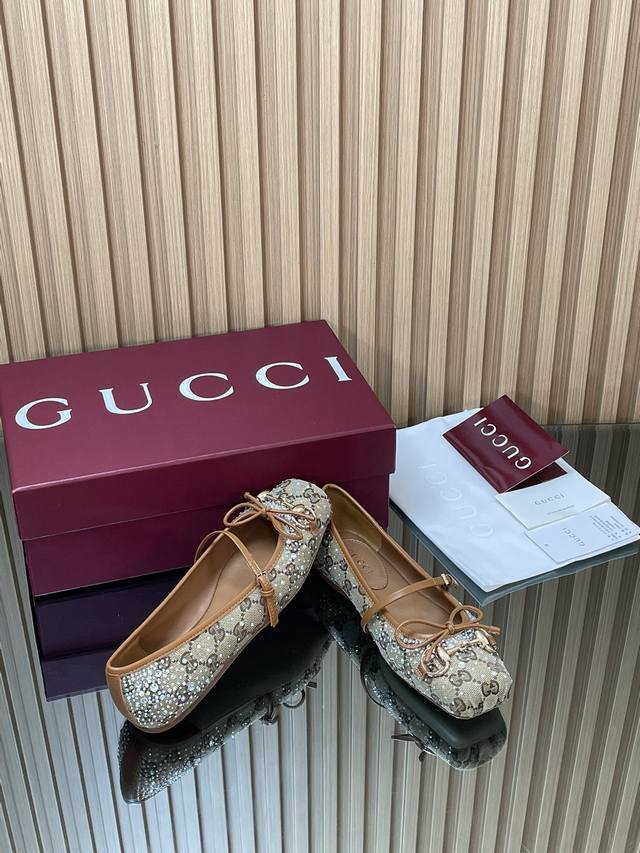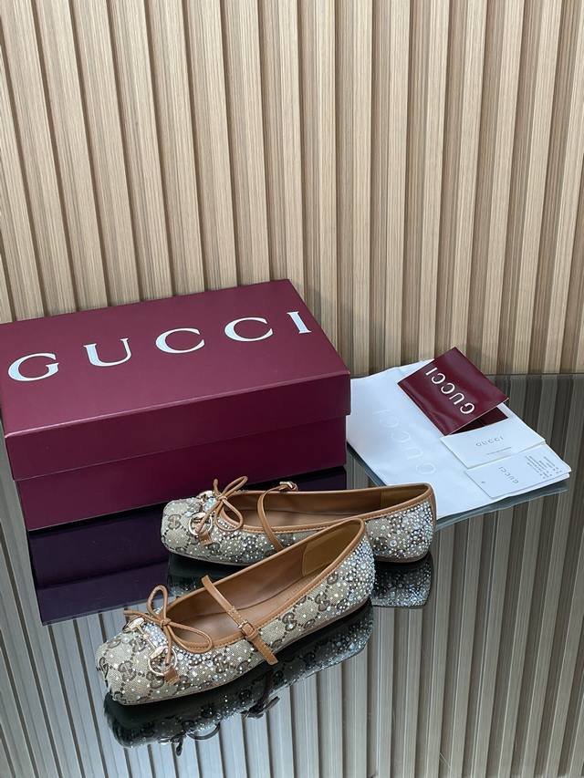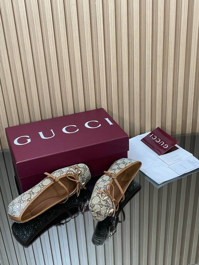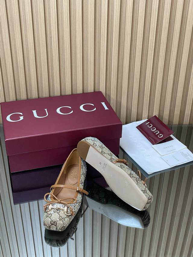 's 2025 Fall/Winter collection features a square toe and elegant bow details, paying homage to traditional ballet flat designs. Crafted from GG canvas, it's hand-set with multi-faceted iridescent crystals and adorned with a light gold horsebit. The soft, padded insole provides a luxurious and comfortable wearing experience. Material: Original custom-made imported GG monogram canvas + iridescent rhinestones. Hardware: Dongguan factory-made, molded horsebit rivets. Lining/Insole: High-end custom-made silk sheepskin lining. Heel height: Flat. Outsole: Italian genuine leather. Sizes: 35-41. 40, 41, 42 are custom-made and non-refundable. Comes with full original high-end packaging! Italian creation. Anchorage burgundy, full high-end original packaging.