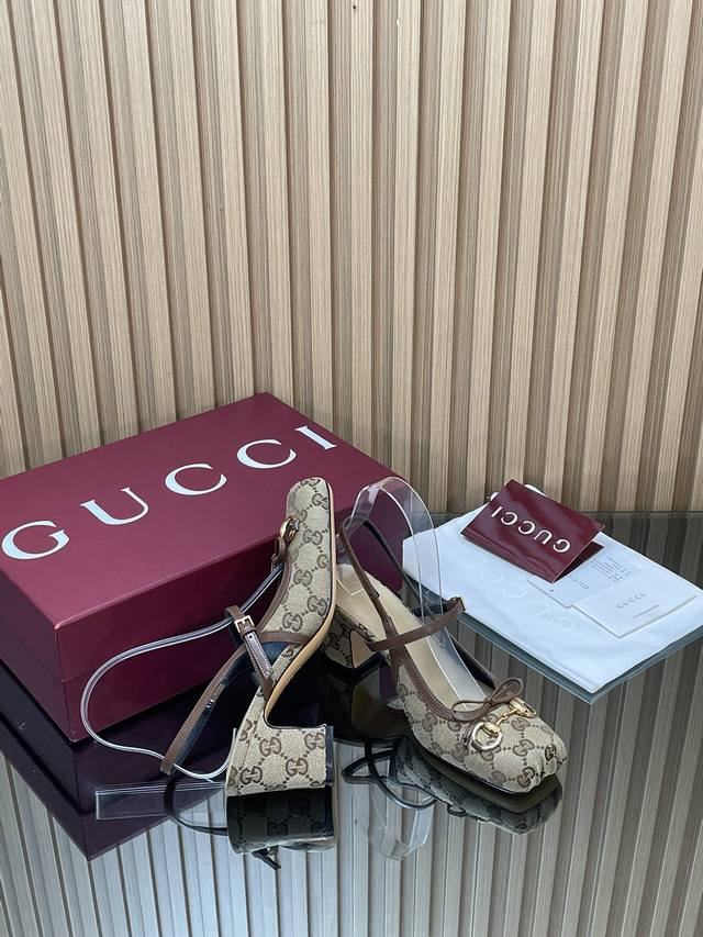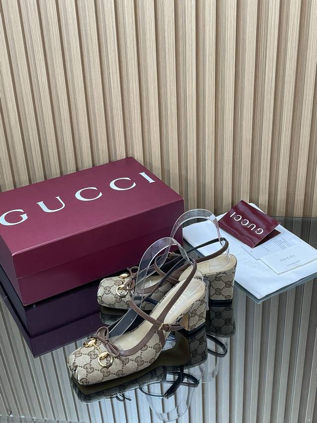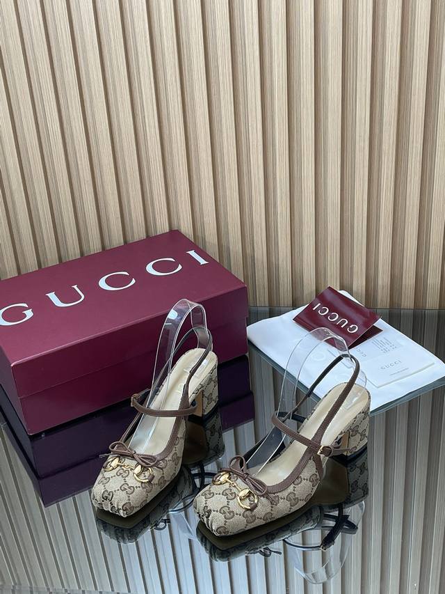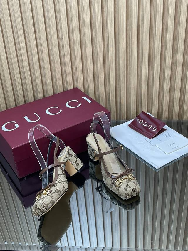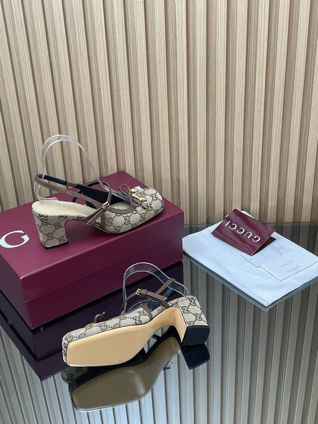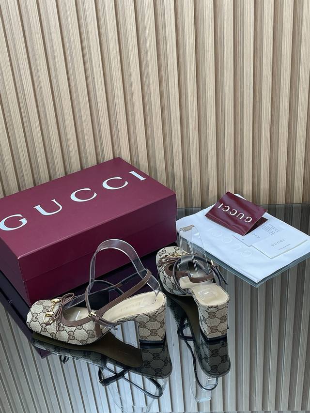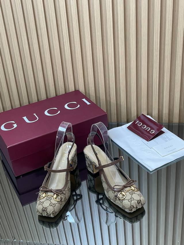 Gucc High-End Boutique 2025 Overseas Early Autumn Gucci Horsebit Series New Arrival High-Heeled Square Toe New Ballet Shoes Horsebit Buckle New Small Square Toe Mules Classic Exquisite Elegant Bow Low Mouth Shoes High-Quality Back Lace-up Open Back Shoes DDD Original Quality, Every detail is carefully crafted, comparable to ZG, unique quality! DDD 2025 Autumn/Winter Collection: This horsebit lace-up pump features a square toe design with elegant bow details, paying homage to traditional ballet flats. Crafted from leather and adorned with light gold accents, the Sacchetto construction ensures exceptional comfort. Material: Original custom imported sheepskin GG monogram fabric. Hardware: Horsebit buckle, custom-made in Dongguan factory. Lining/Insole: High-end custom sheepskin lining. Heel height: 6.5 and 9.5 cm. Outsole: Italian genuine leather. Sizes: 35-41, 40, 41, 42. Made to order, no returns or exchanges. Italian creation. Complete high-end original packaging in red.