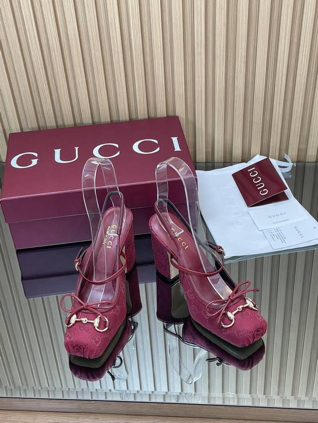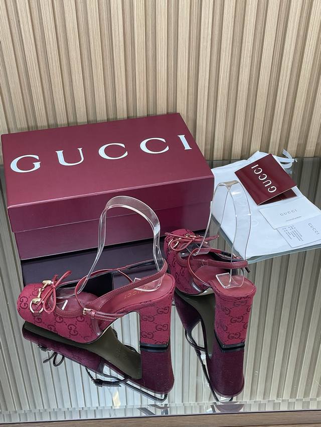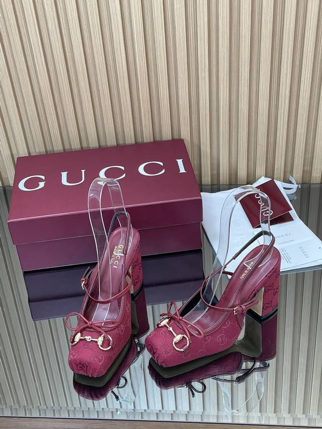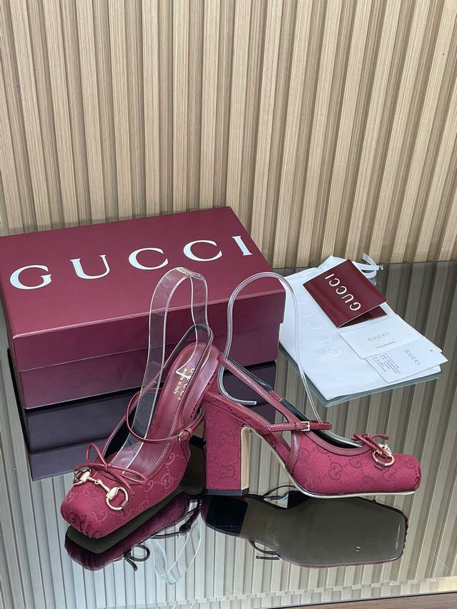 2025 Autumn/Winter Collection: This horsebit back-lacing pump features a square toe design with elegant bow details, paying homage to traditional ballet flats. Crafted from leather and adorned with light gold accents, the Sacchetto construction ensures exceptional comfort. Material: Original custom imported sheepskin GG monogram fabric. Hardware: Horsebit buckle, custom-made in Dongguan factory. Lining/Insole: High-end custom sheepskin lining. Heel height: 9.5 cm. Outsole: Italian genuine leather. Sizes: 35-41. Sizes 40, 41, and 42 are custom-made and non-refundable. Italian design. Complete high-end original packaging in red.