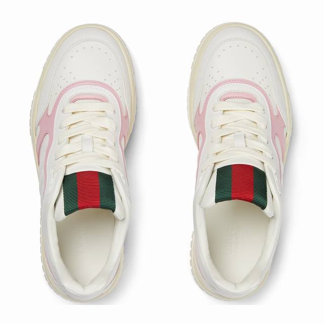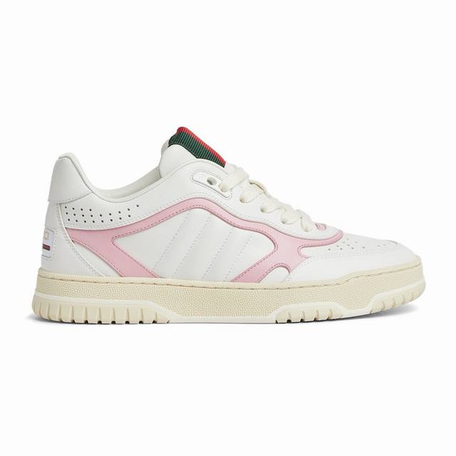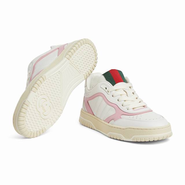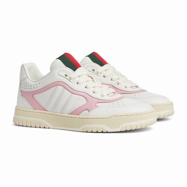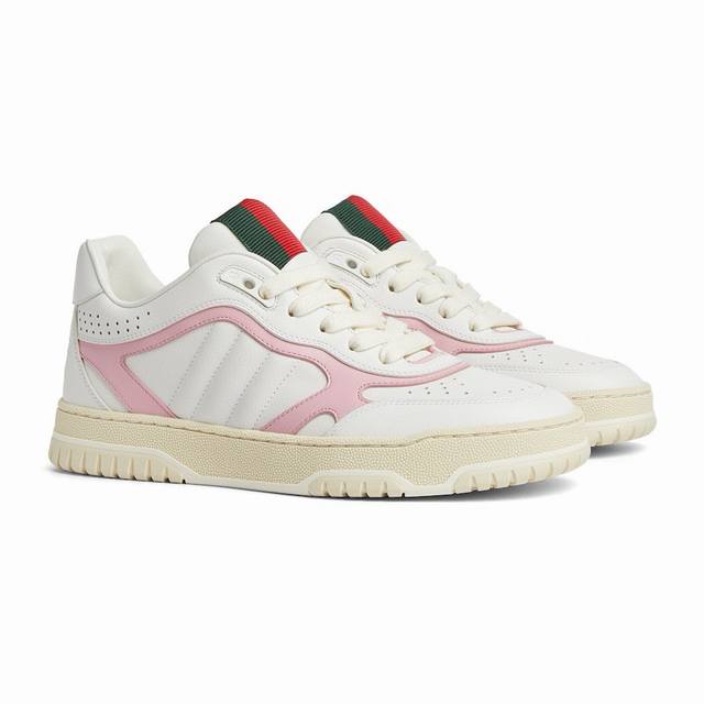 Gucc* Re series couple's webbing leather sneakers. As Sabato De Sarno's first sneaker for Gucci, the Re-Web series reinterprets the brand's classic stripes, with bold and unconventional details complementing a modern silhouette. This shoe is crafted from iconic classic Gg canvas and white leather. This new sneaker is adorned with several classic brand details, featuring a striking red and green webbing tongue that's instantly captivating. Available in women's sizes 35-39 and men's sizes 38-44.