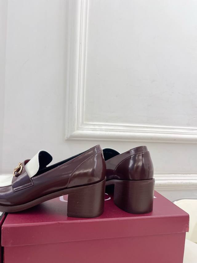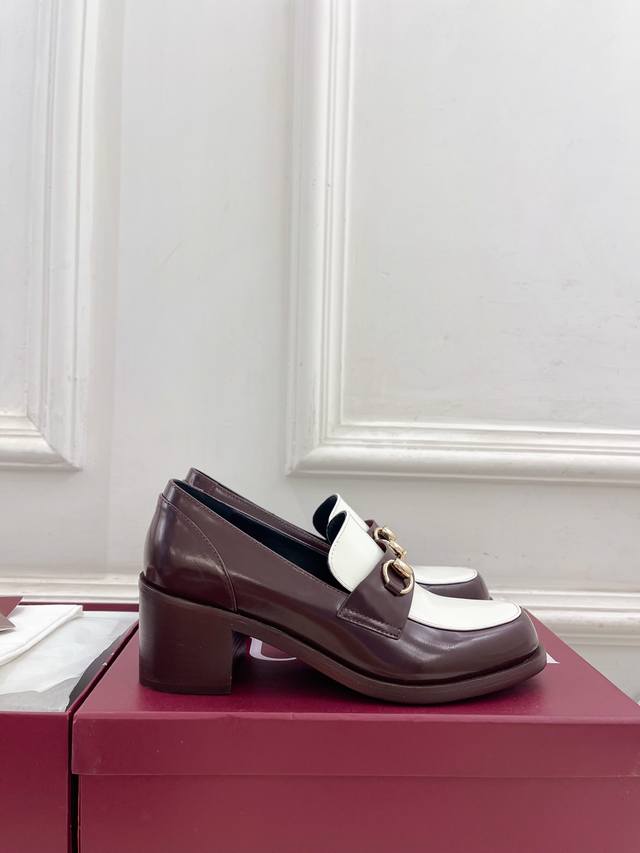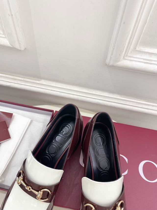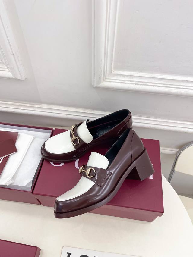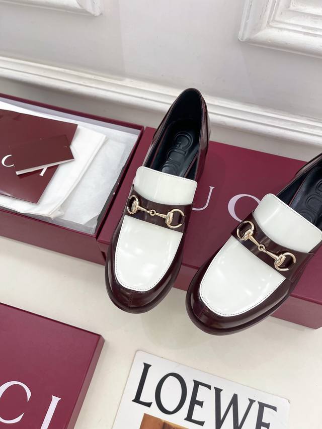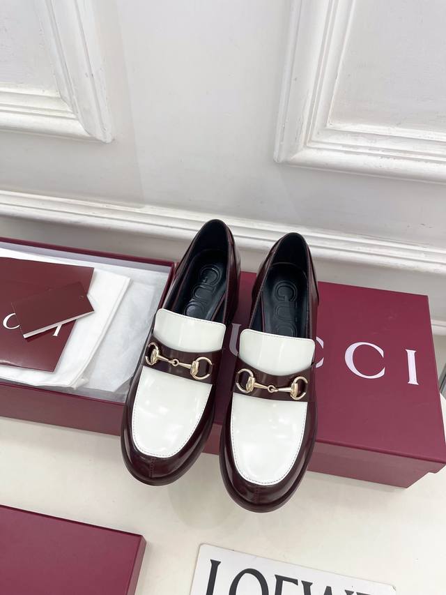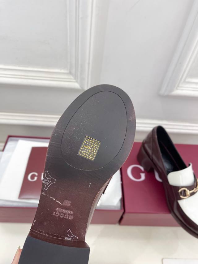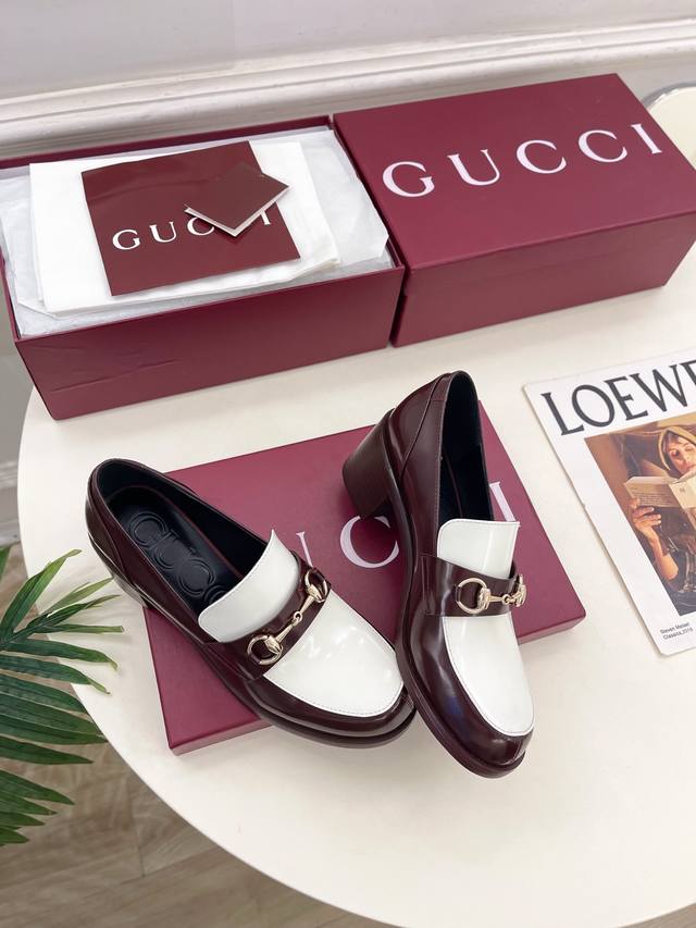 Gucci 2025 Fall/Winter New Arrival: Classic Horsebit Chunky Heel Loafers - The main collection is finally here! A highly anticipated item! A fresh design on the classic silhouette! High-end feel! A must-have for bloggers both domestically and internationally, retro yet stylish, easy to wear, and absolutely gorgeous! Officially recommended, new colors continuously updated! Upper: Original specific cowhide with split edges. Lining: Imported sheepskin. Outsole: Original Italian genuine leather. Heel height: 5.5cm. Sizes: 35-39, 40, 41, 42 (custom sizes available). Factory price (PP): [Price not specified]
