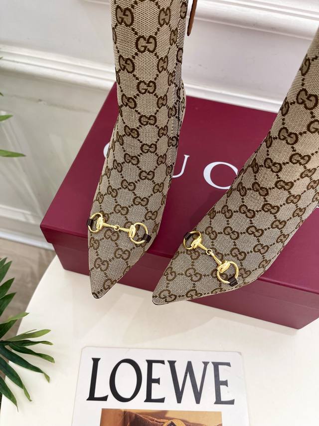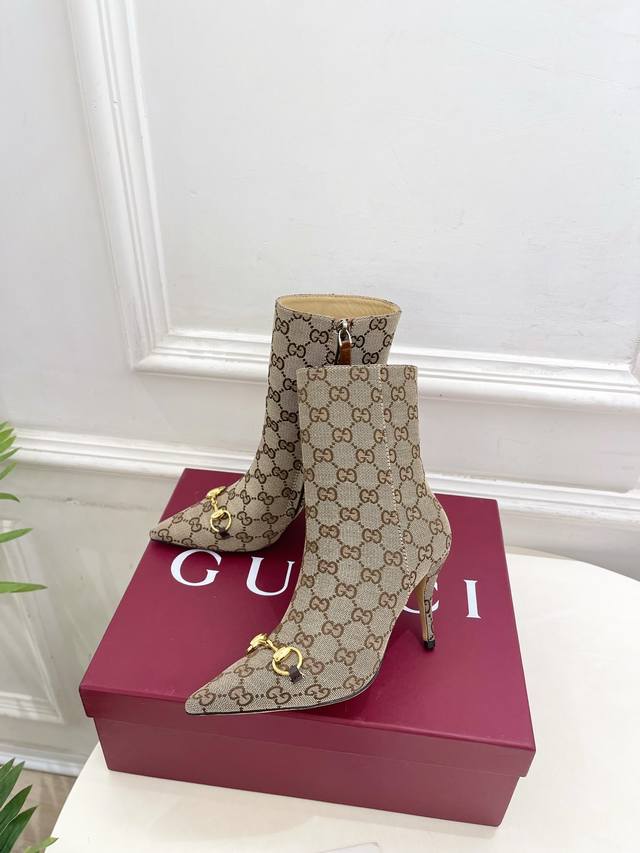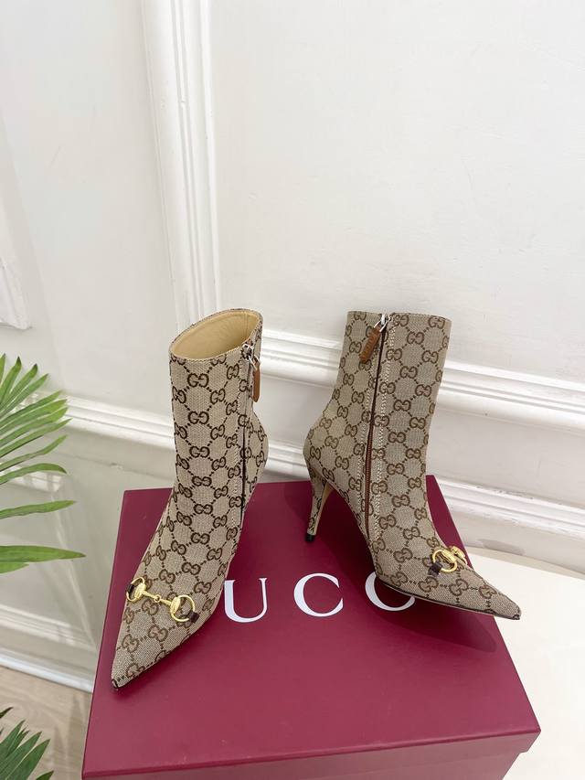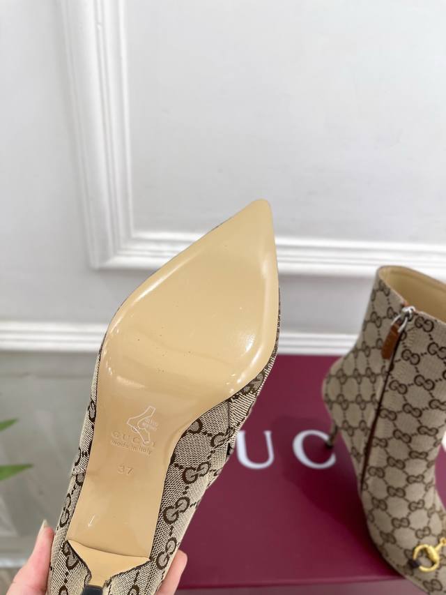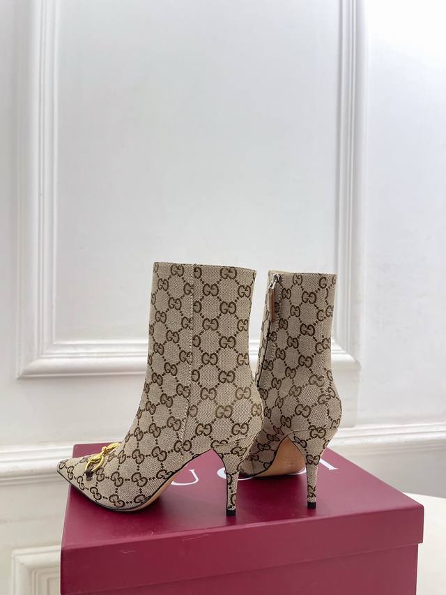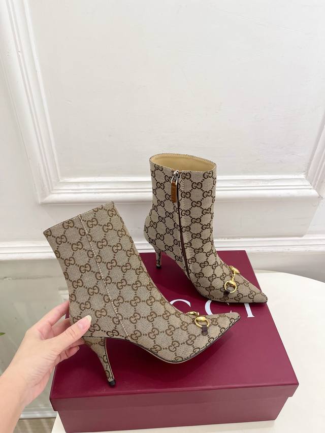 Gucci 2025 Fall/Winter New Horsebit Pointed Toe Side Zipper High-Heeled Ankle Boots - The main series is finally here! A highly anticipated item! A classic design with a fresh twist! High-end feel! A must-have for bloggers both domestically and internationally, retro yet stylish, easy to wear and incredibly beautiful! Officially recommended, new colors continuously updated! Upper: Original calfskin patent leather, Gg fabric Lining: Imported sheepskin Outsole: Italian genuine leather Heel height: 8.5cm Sizes: 35-39, 40, 41, 42 (custom sizes available) Factory price: Gg fabric 490, leather upper 490