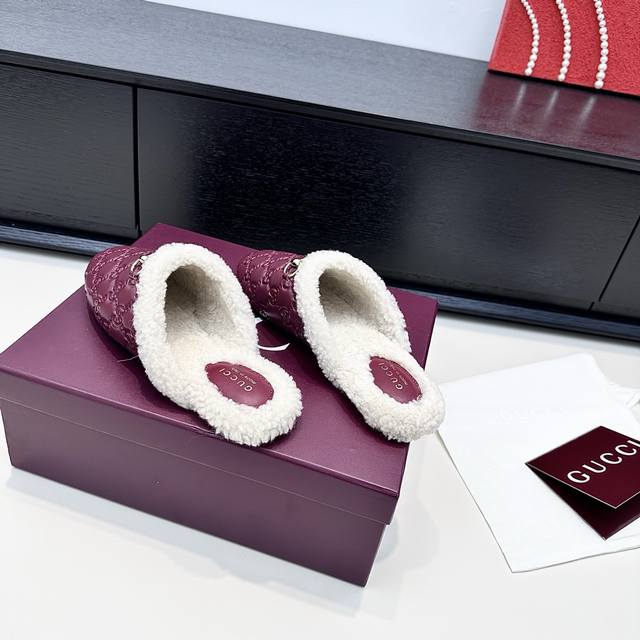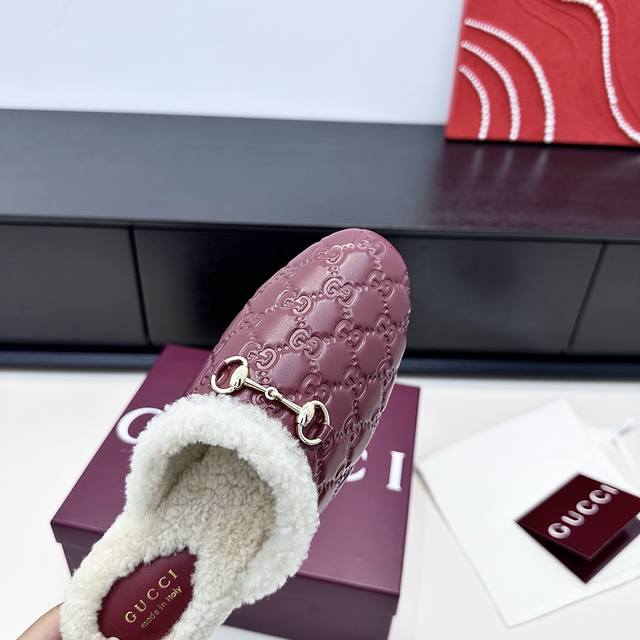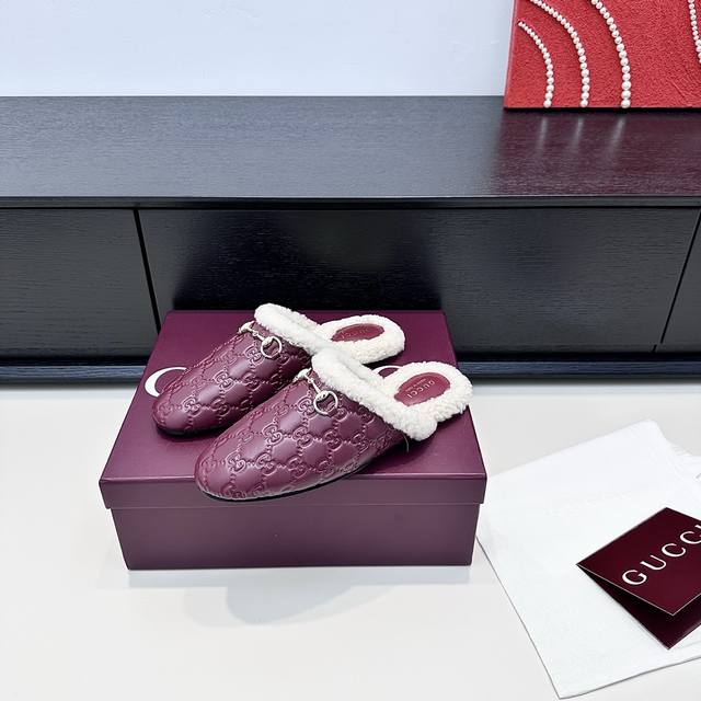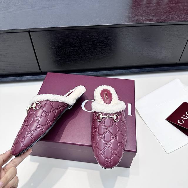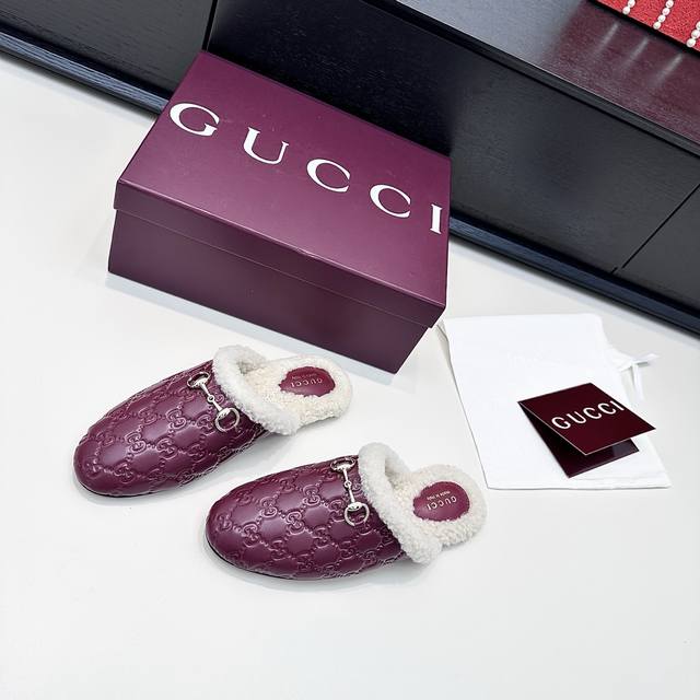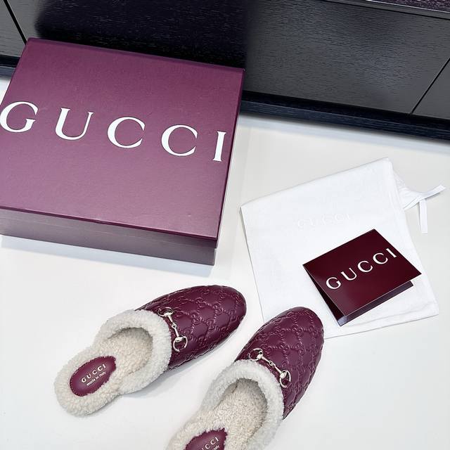 Gucci 25th Anniversary New Wool Mule Slip-On Slippers DDD The relaxed sophistication of autumn and winter is what these Gucci mule slippers offer DDD All-over GG pattern with soft fur trim, the classic horsebit buckle adds a touch of luxury to every detail DDD The warmth inside the shoes is a touch of understated elegance in everyday life DDD True to size: 35-39 Custom orders available for 34, 40, 41, 42 DDD
