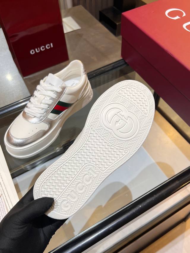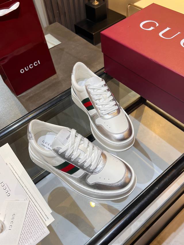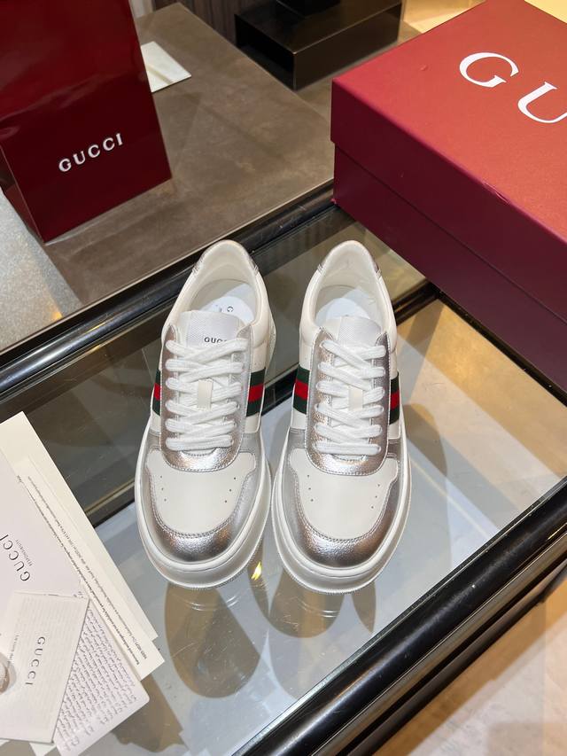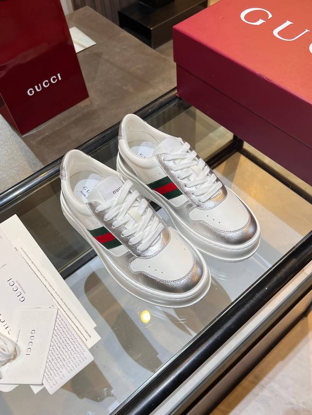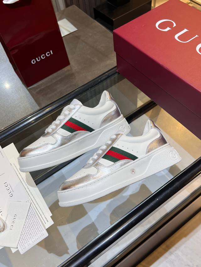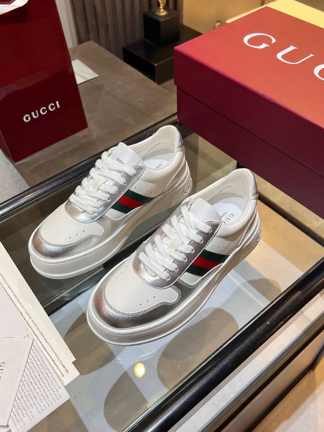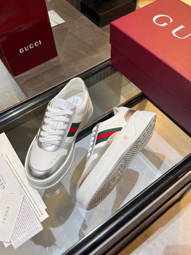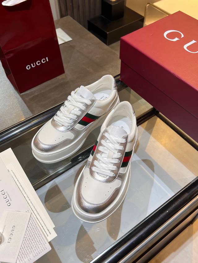 Gucci Fall/Winter Couple Platform White Sneakers are here! Latest IP-level quality, lightweight platform sole for an instant 5cm height increase! Front lace-up design fits the foot shape perfectly, super easy to put on and take off. Classic red and green webbing adds a retro touch. Upper made of imported color-blocked eco-friendly water-dyed calfskin. Leather lining + latex insole with leather trim. Original ultra-lightweight one-piece injection molded sole. Soft and comfortable to walk in, no foot fatigue. Comes with full packaging. Women's sizes 35-40, Men's sizes 39-45. A must-have for couples, starting your sophisticated look from your feet! #GucciNewArrivals #CoupleShoesRecommendation #LuxuryOutfit #FallWinterEssentialItems